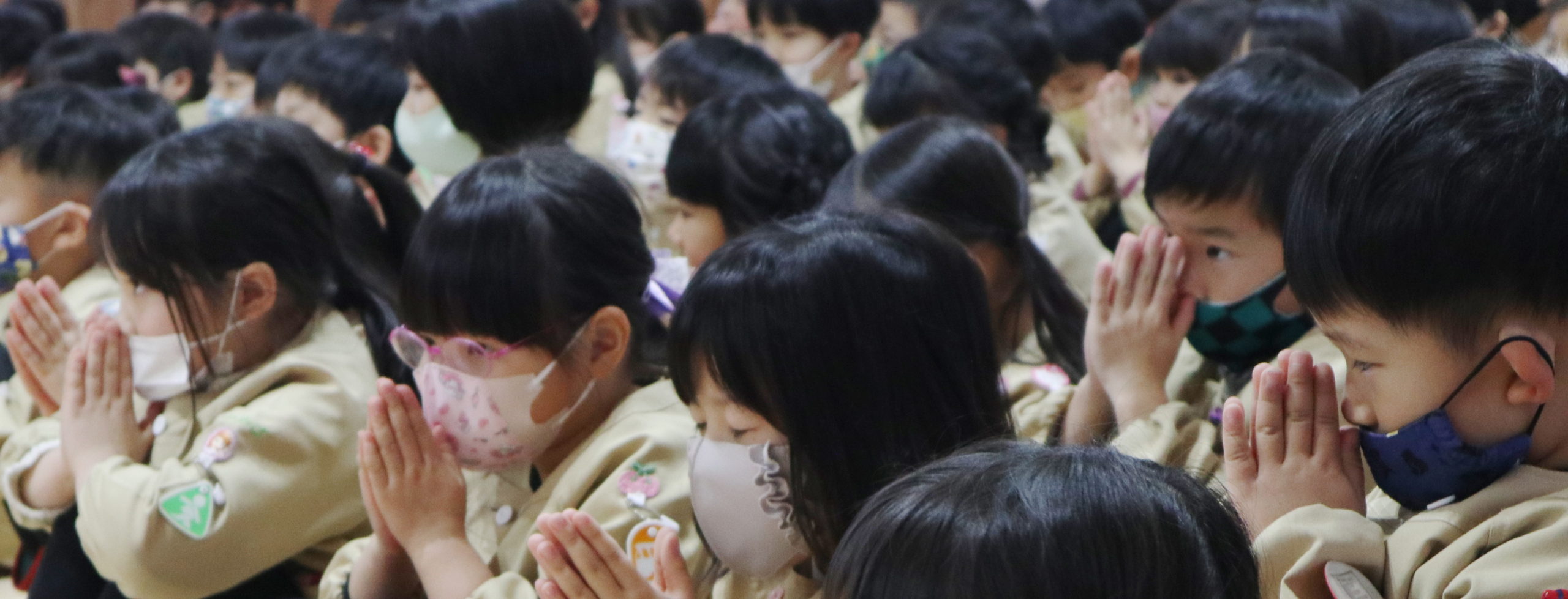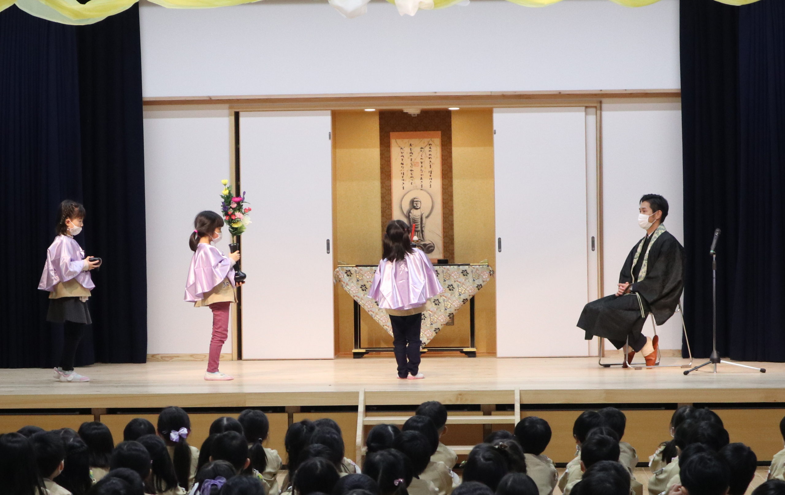 こはるちゃん、のぞみちゃん、まなかちゃんのみなさんが務める献灯献花献香からはじまりました。厳かな音楽が流れる中、ドキドキしましたがみんなが静かに見守る中、立派に務めてくれましたよ。