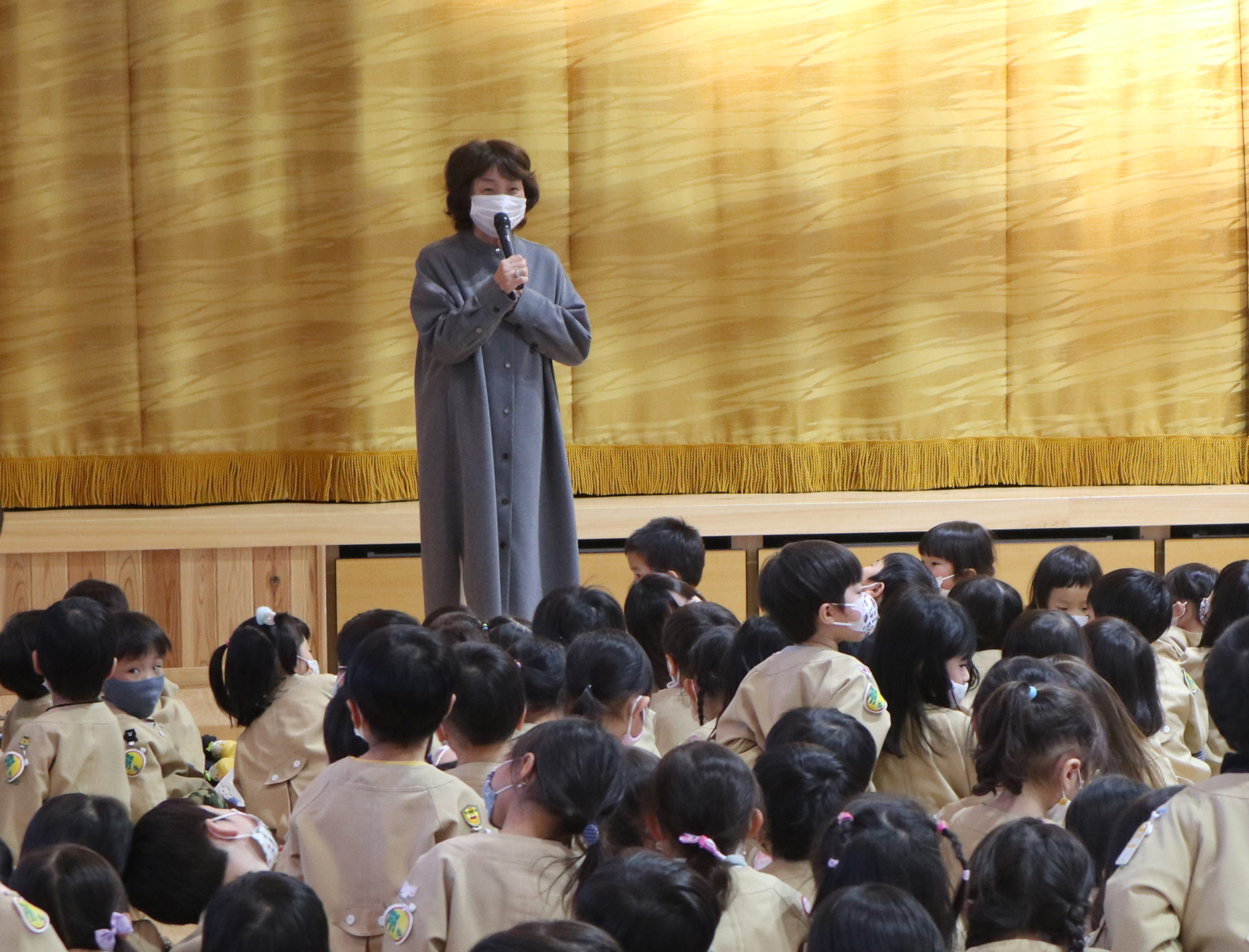 「2学期もこうしてみんな無事で過ごすことができました。それはどうしてかな?みんなのお父さんやお母さん、おじいちゃんやおばあちゃんや先生、おともだち まわりの人たちがたくさん支えてくれていたおかげだね。