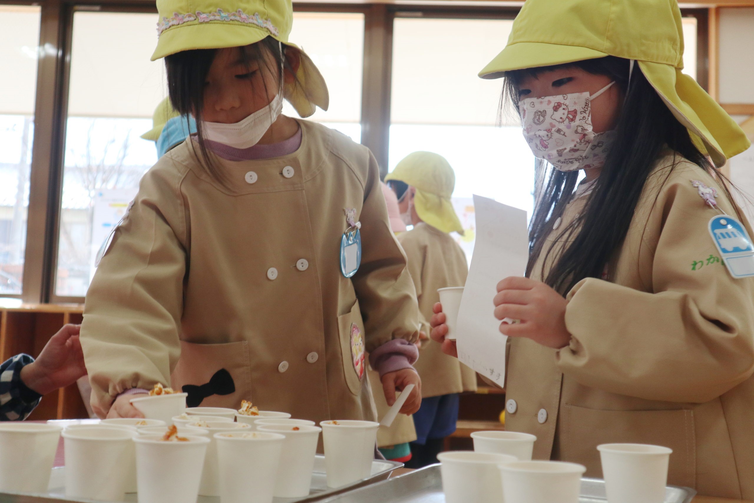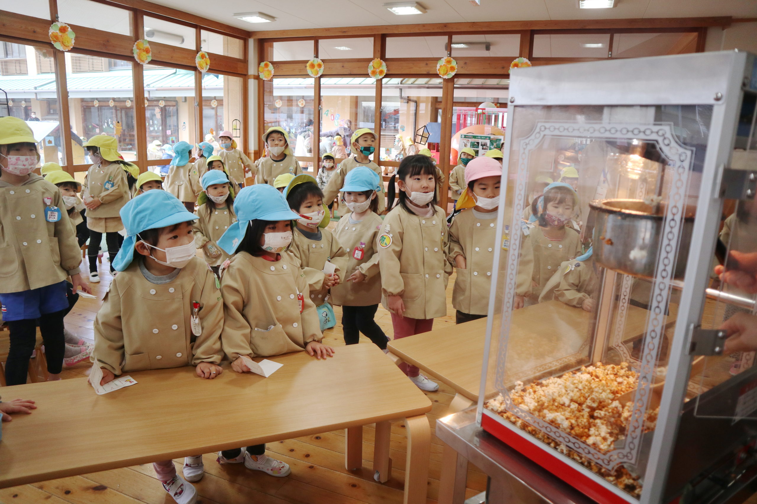 甘くていい香りに誘われてみんなが集まってきましたよ!キャラメル味のポップコーンのできあがり。