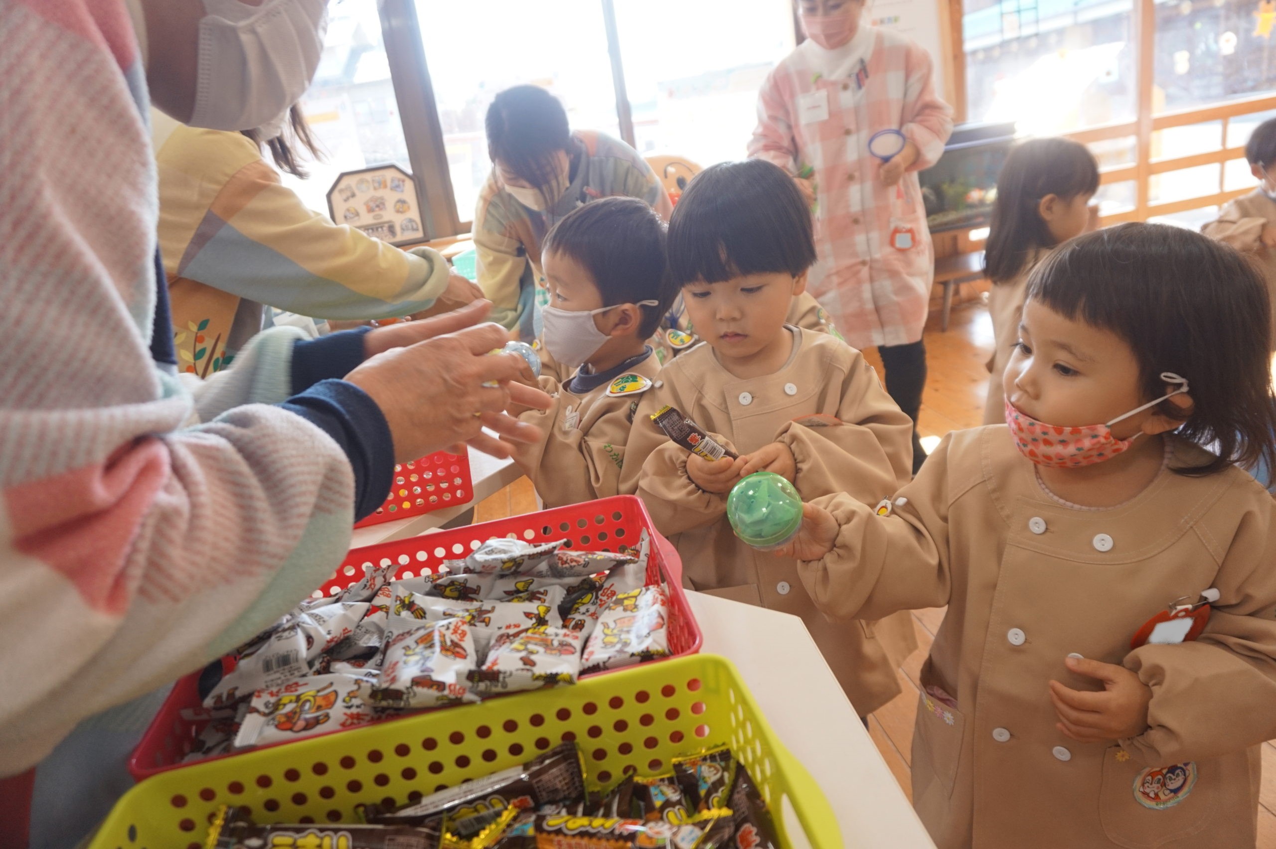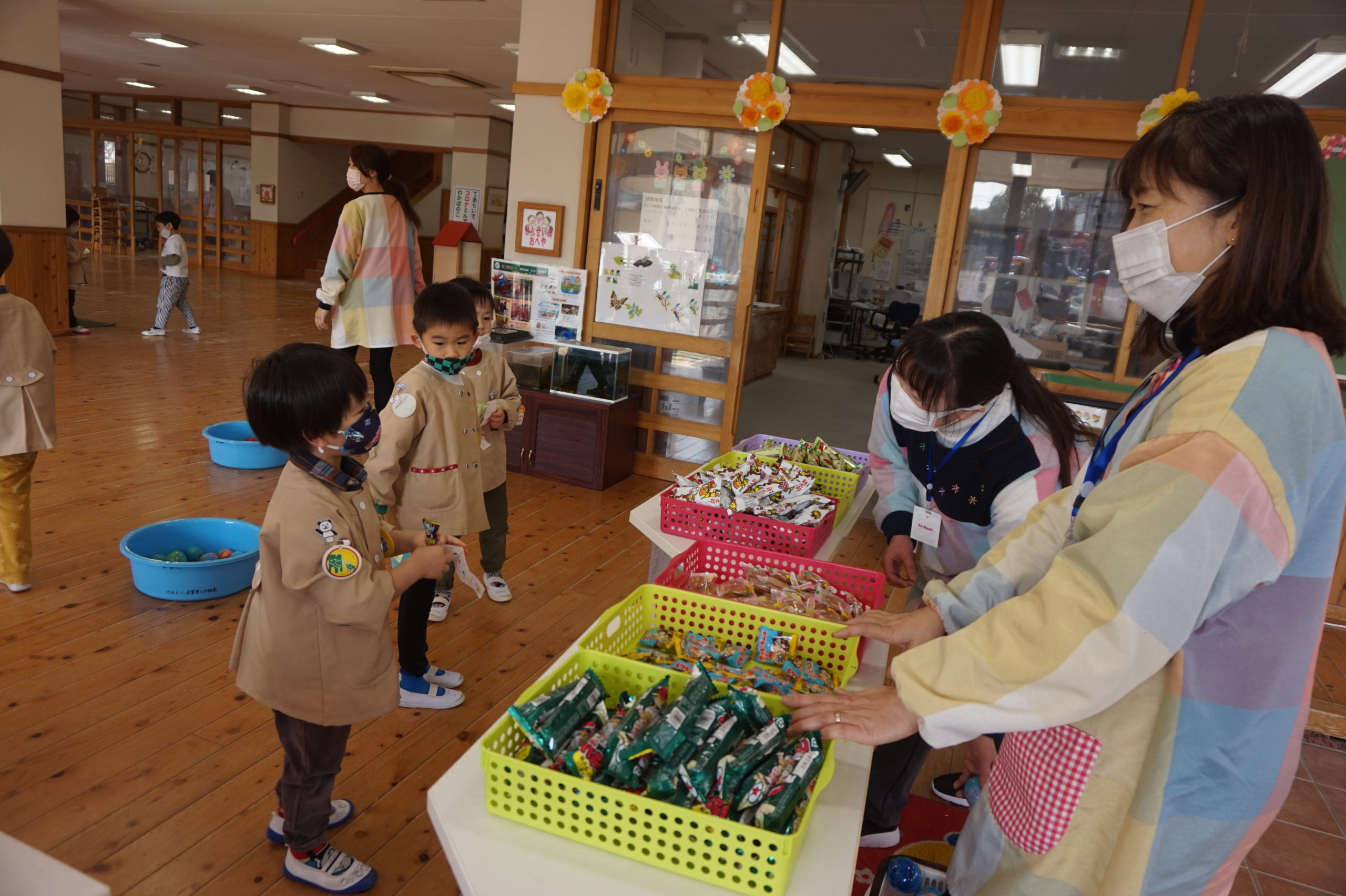 カプセルをすくったら、松井先生とのりこ先生のところへ行ってお菓子と交換したよ。カプセルの色でお菓子が決まっているよ。