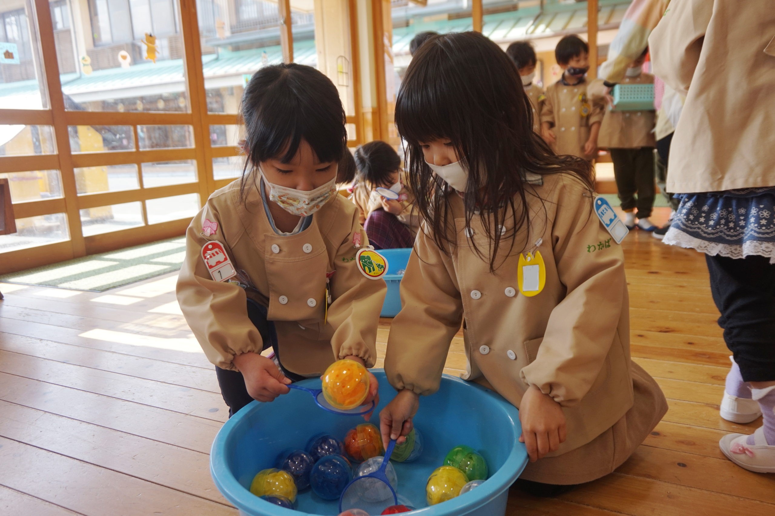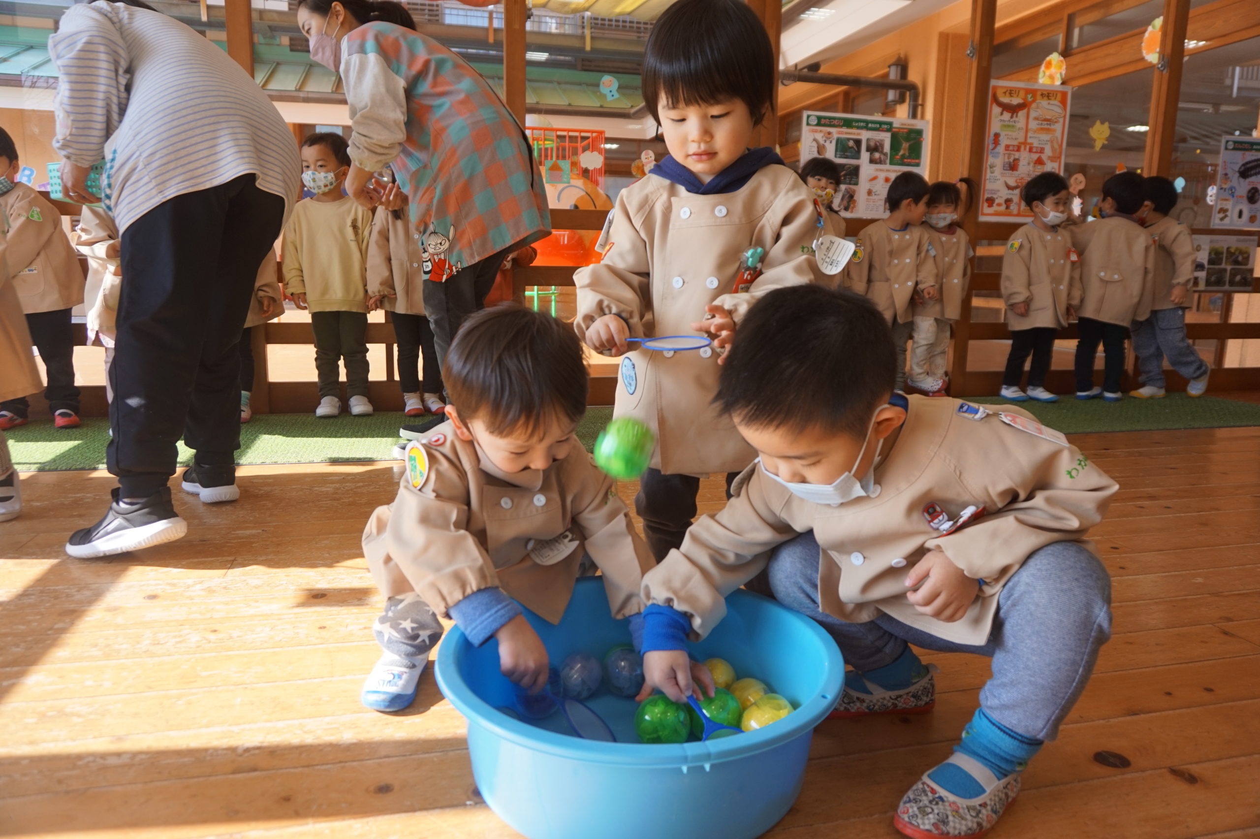 赤、青、黄、水色、黄緑、オレンジの六色のカプセルから好きな色を選んでポイですくったよ。すぐに狙いを定めてすくう子、何色にしようかなと迷っている子、ぐるぐるかき混ぜて楽しんでいる子、いろいろな姿がありました。