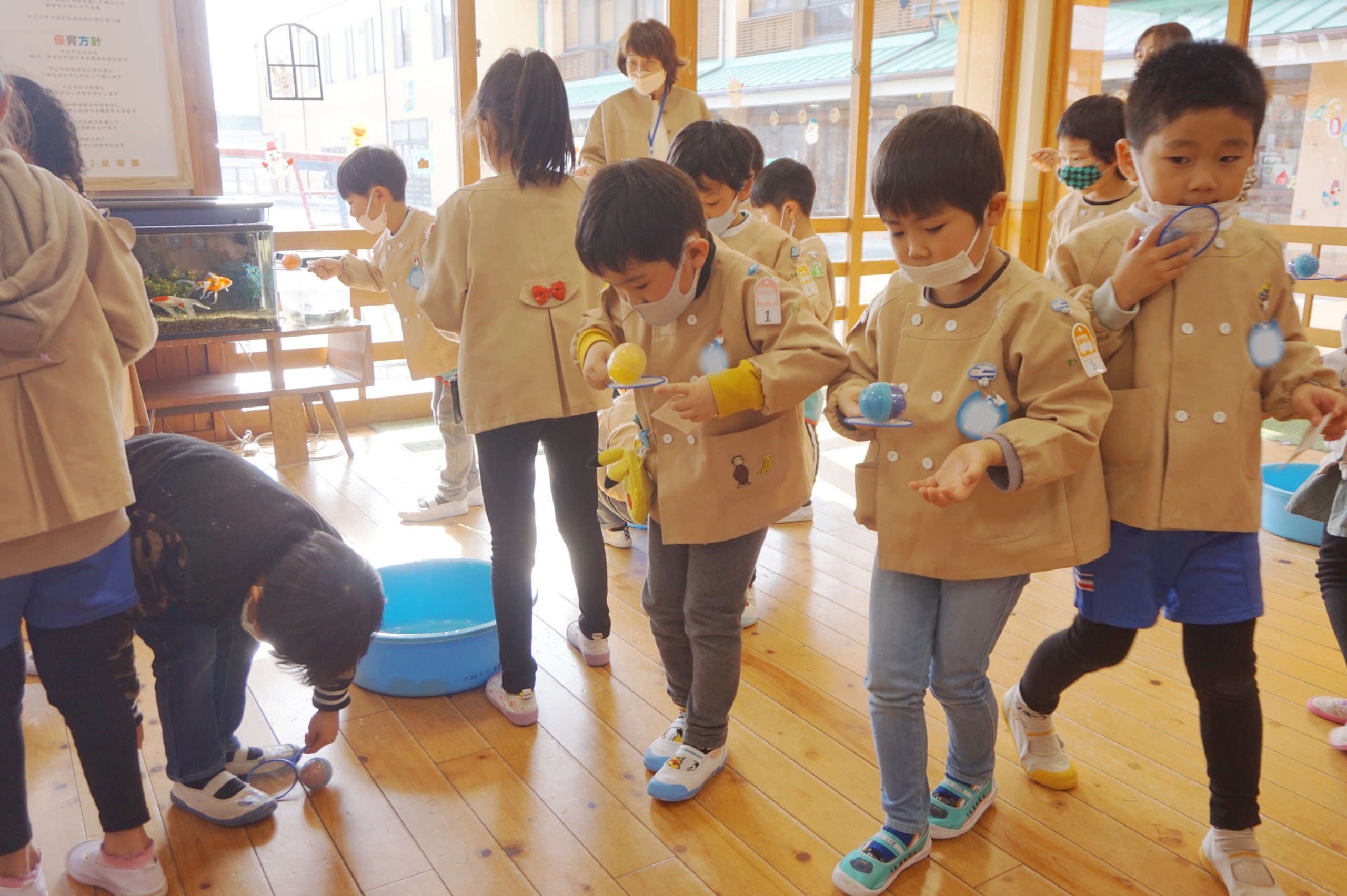 年長組さんはすくうだけじゃないよ。ころころ転がるカプセルを落とさないように運んだよ。そうっとね。その調子その調子!