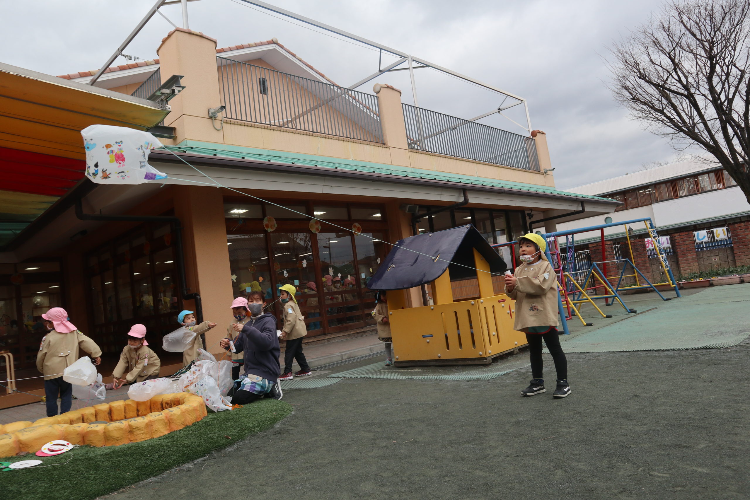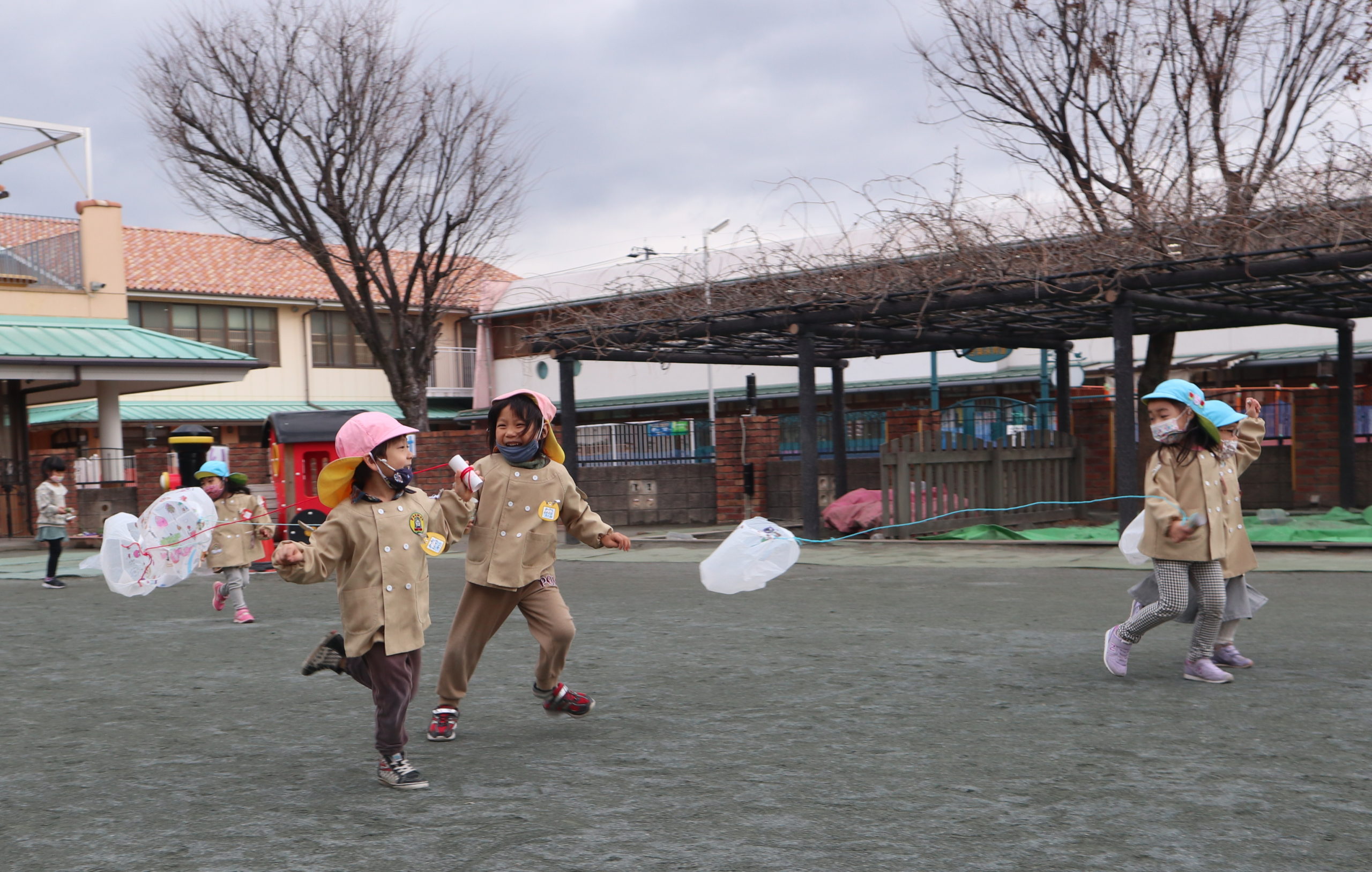 どんよりした寒空の下でしたが、寒さを吹き飛ばすかのように元気いっぱいに凧を掲げ駆け回っていました。