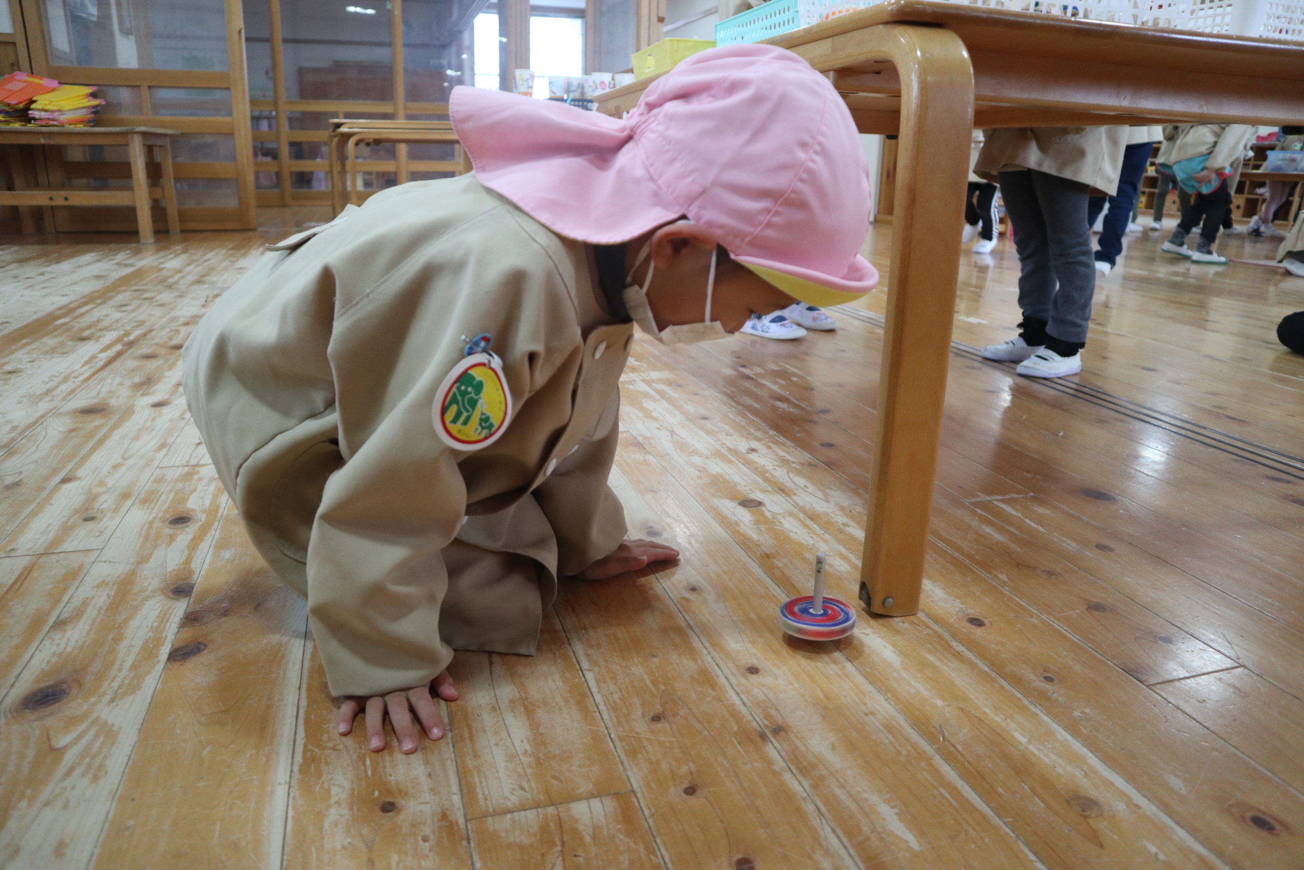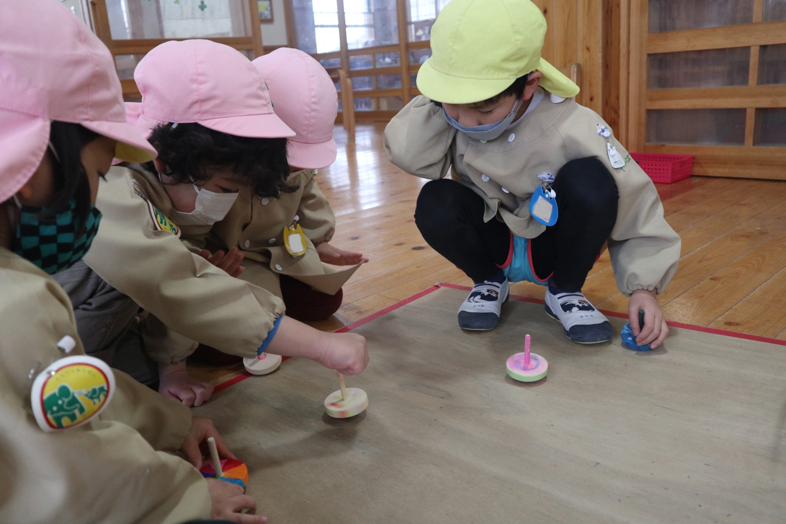 いろいろな模様のコマを選んで、回してみたよ。指先で摘まんで回したり、手のひらを前後にスライドして回したり。大きいおともだちが小さいおともだちに丁寧に教えてあげる姿も見られました。優しいお兄さんに育ちましたね。