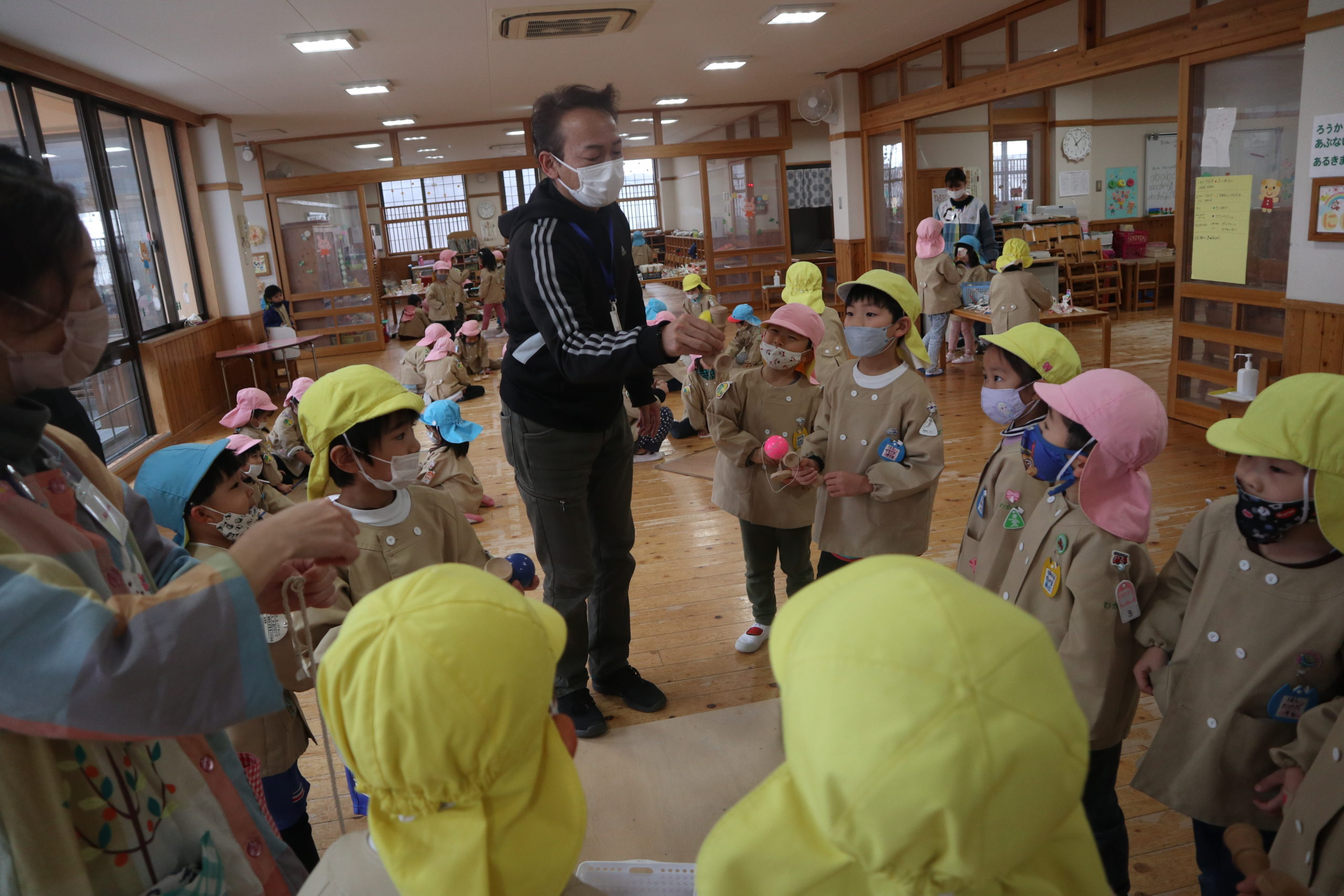 こどもたち手作りのけん玉で遊んだよ。玉があっちへ行ったりこっちへ来たり。簡単そうに見えて、ちょっぴり難しかったね。でも何度も何度も挑戦する姿かっこよかったよ!