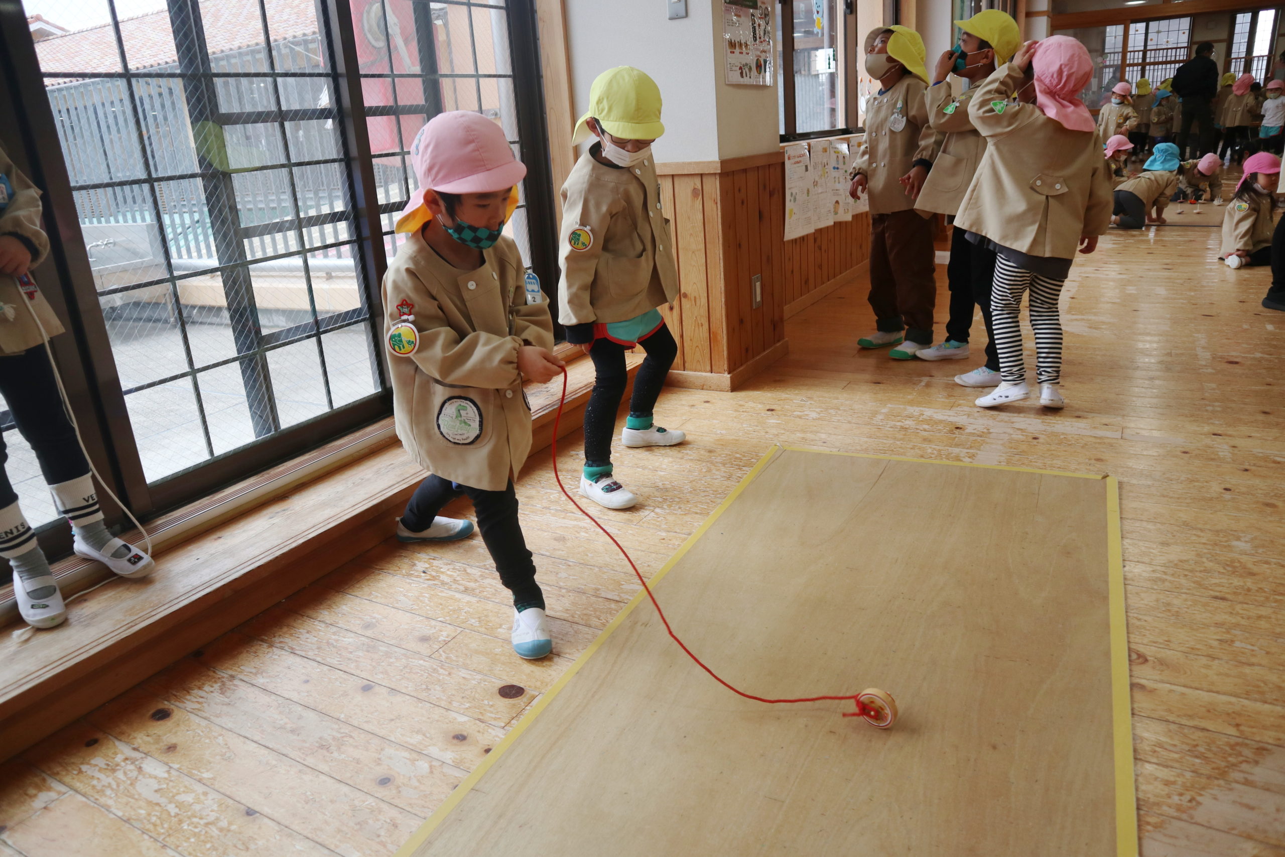 年長組のおにいさんに教えてもらって年中組さんもひもで回すこまにチャレンジしたよ。