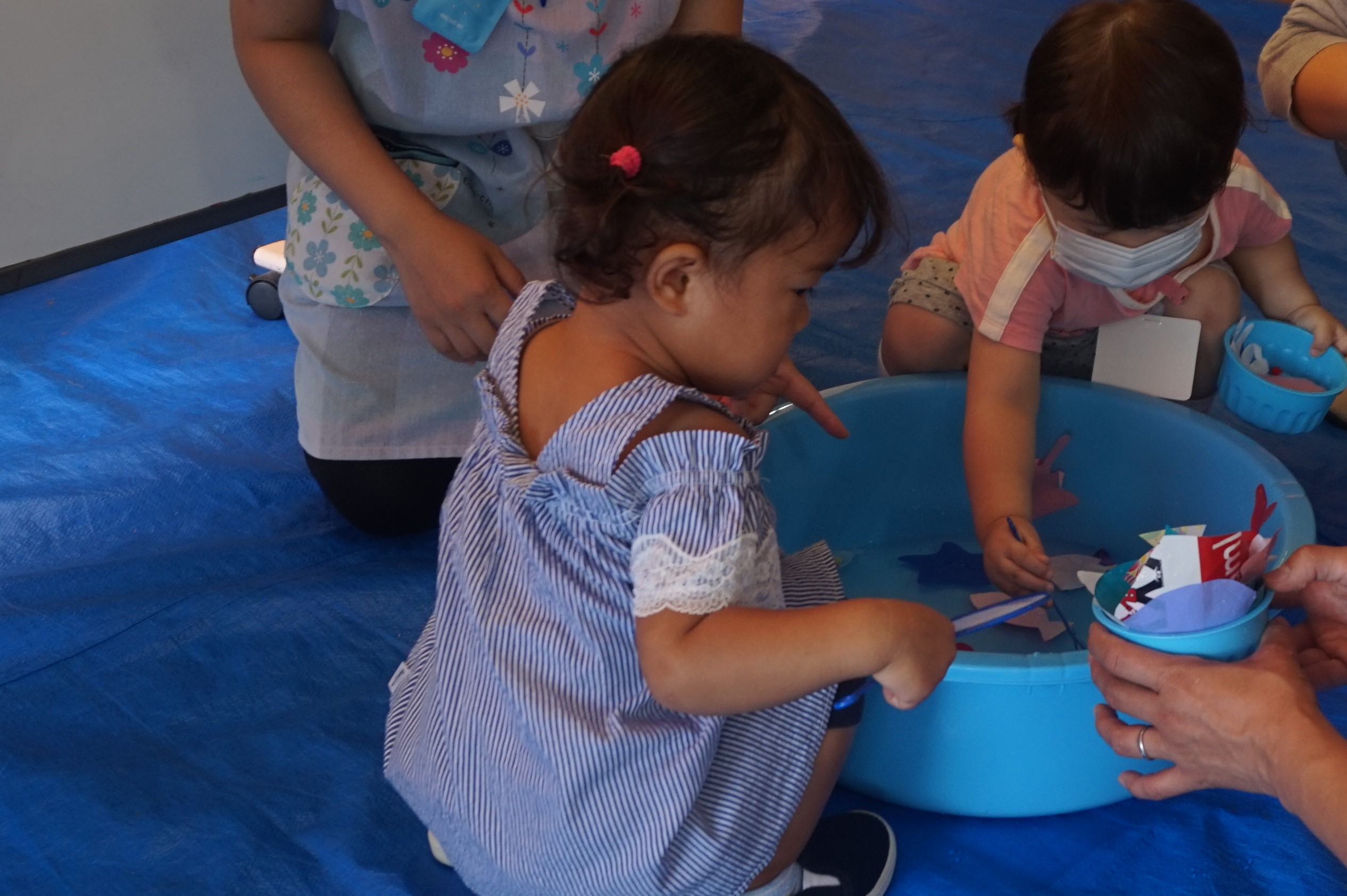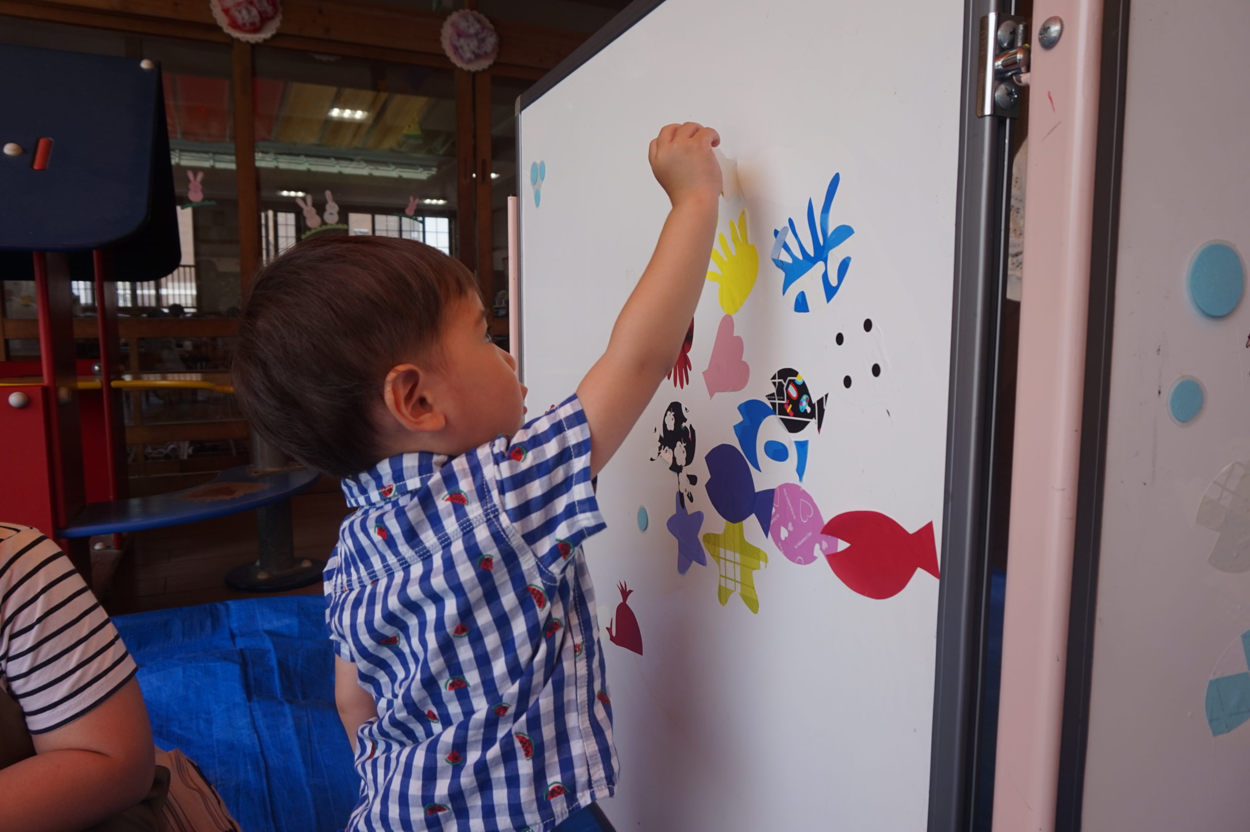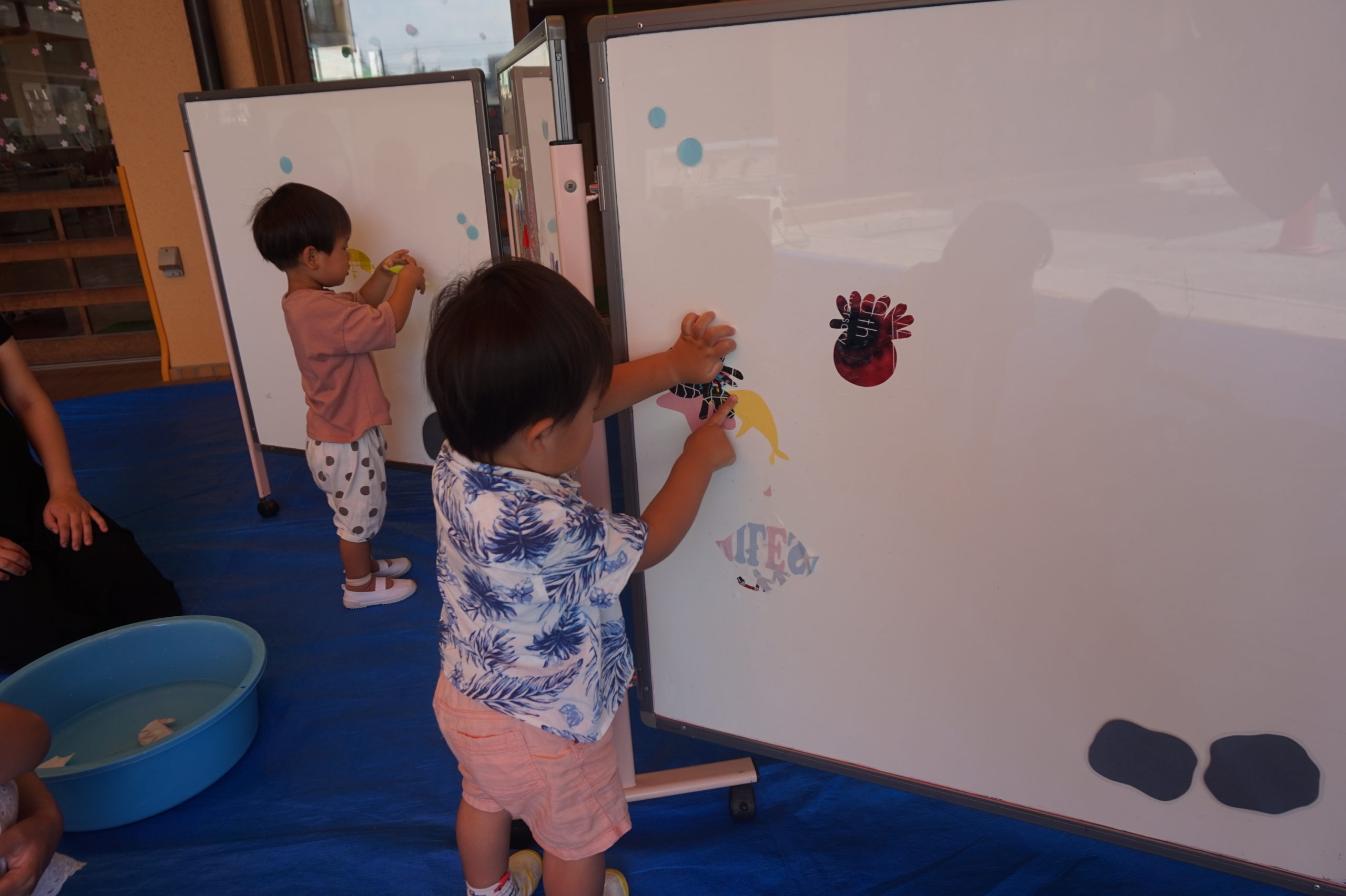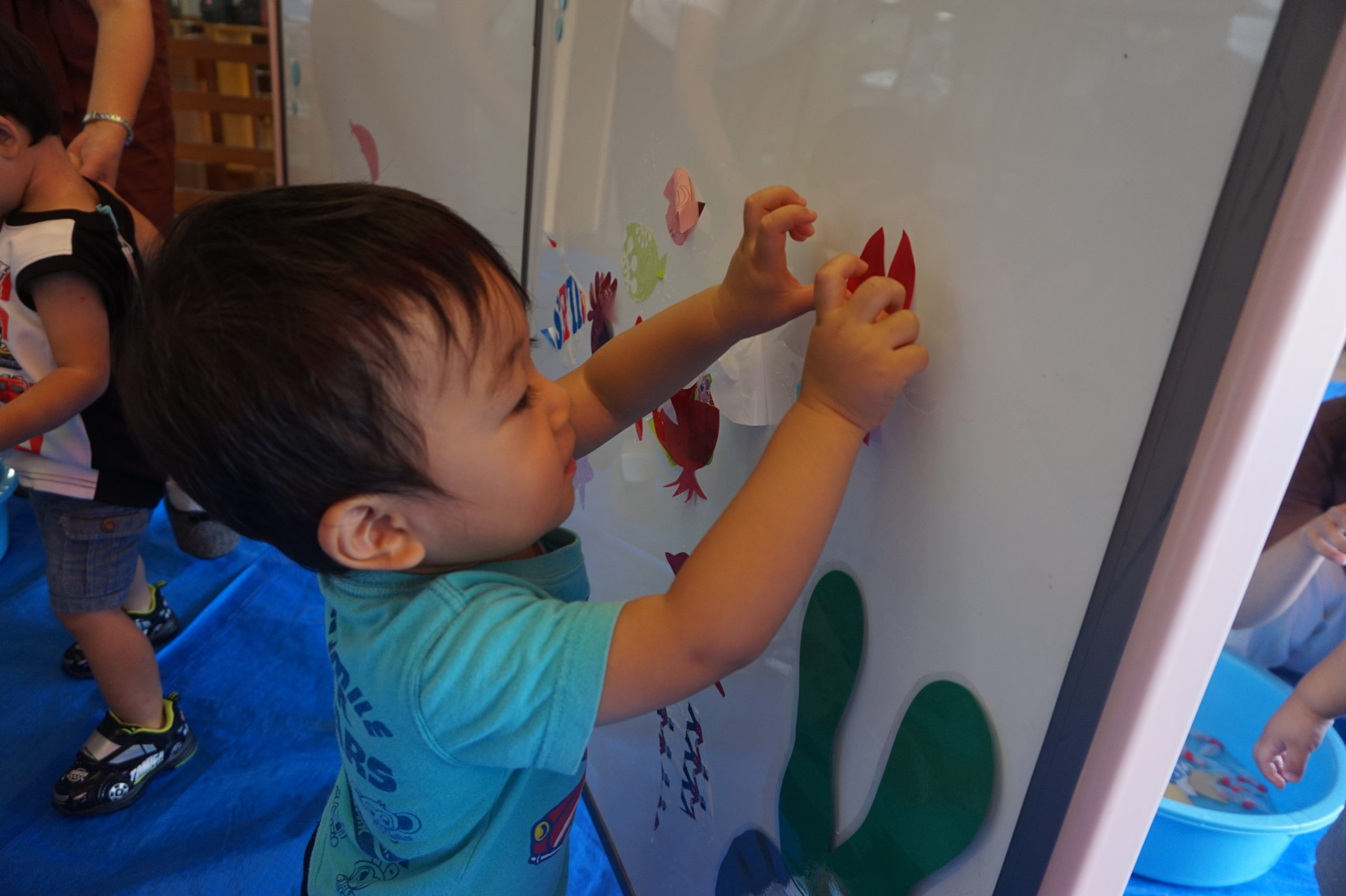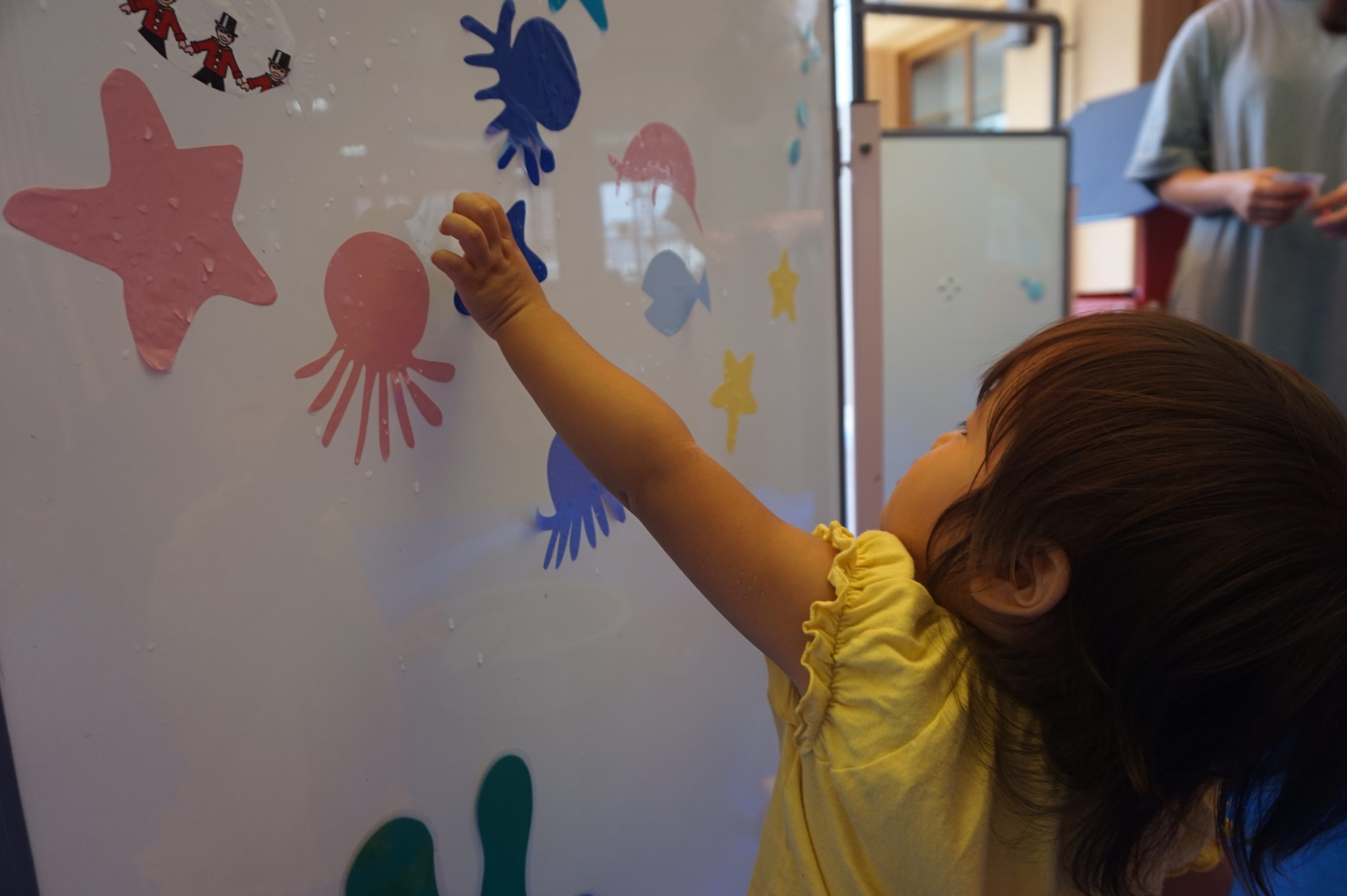 ポイで上手につかまえて、何回も夢中になってあそんでいる子。魚やたこ・くらげなどをホワイトボードにペタペタ貼って水族館をつくっている子。