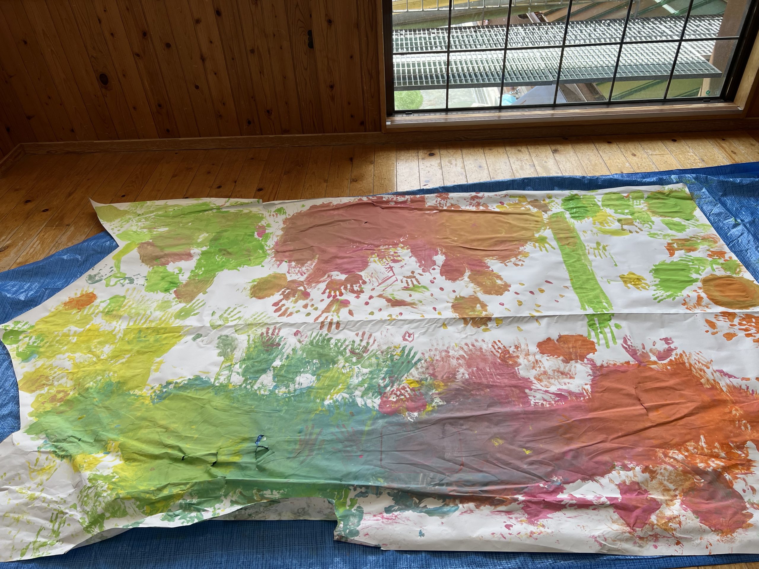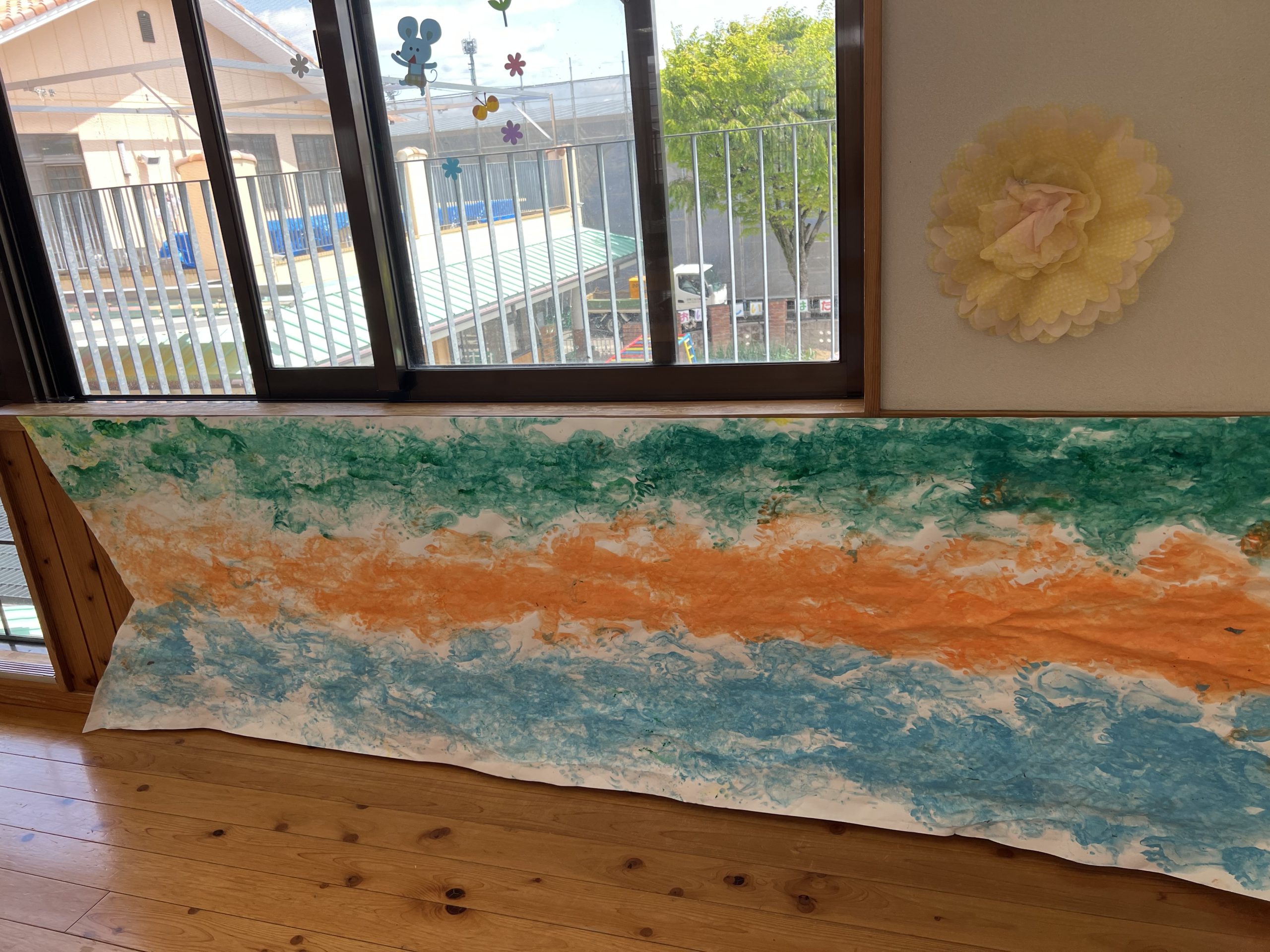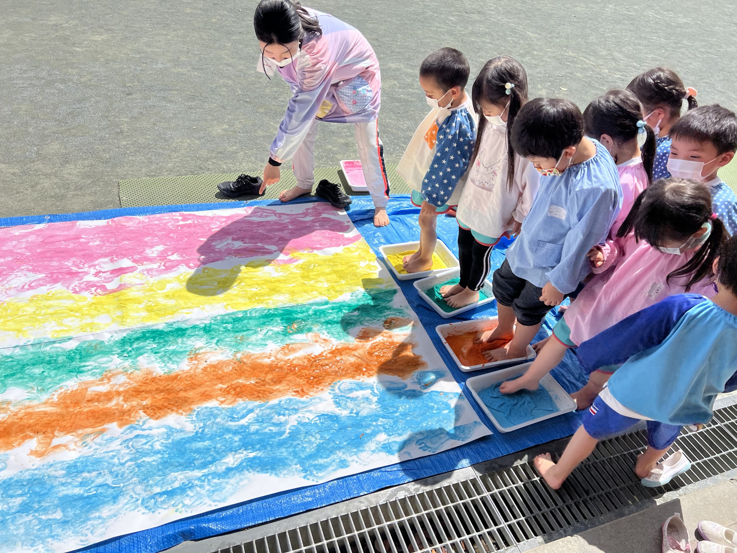 手で、足で、霧吹きで、ローラーで、クラスの大きなこいのぼり作りです。