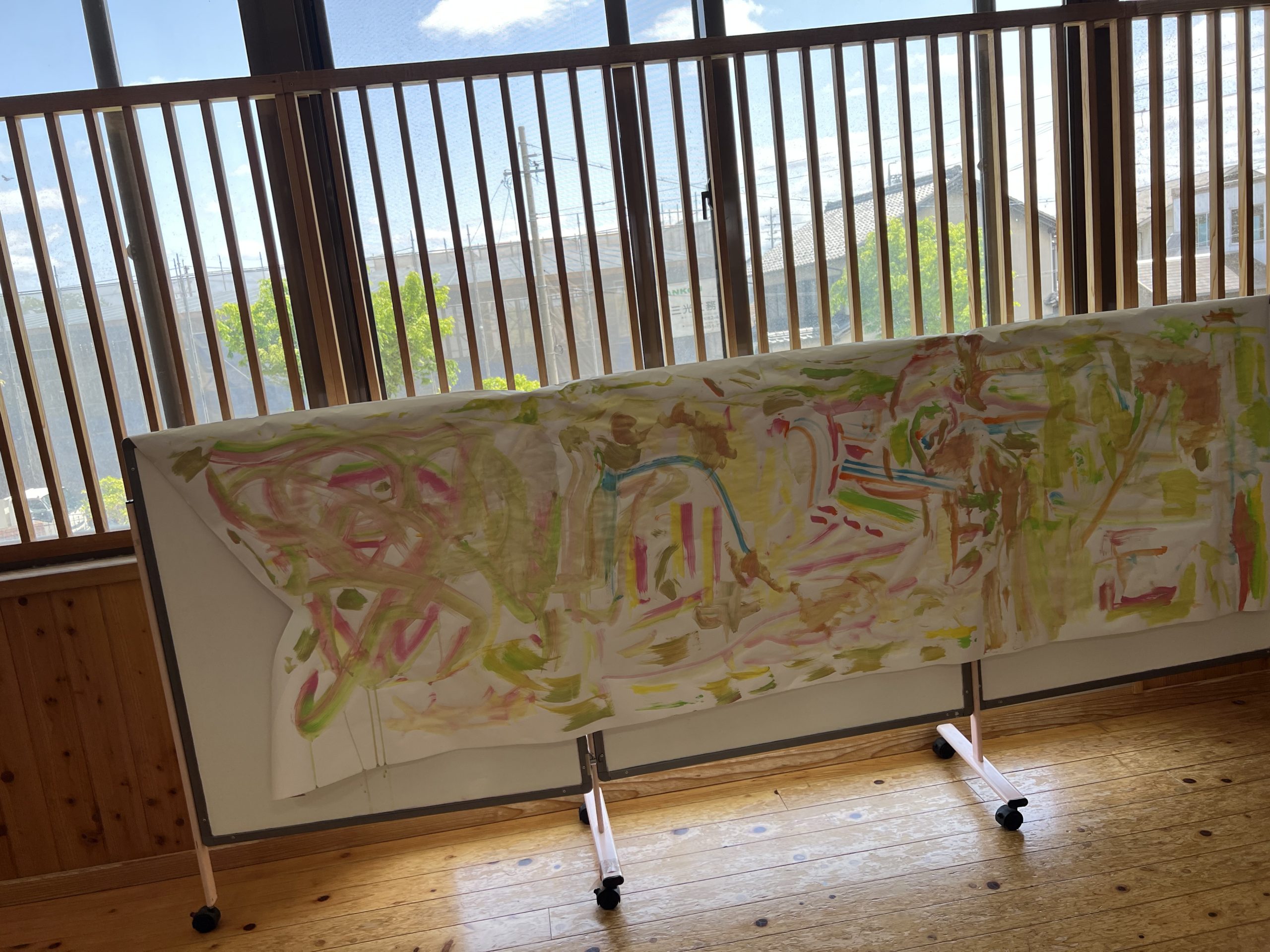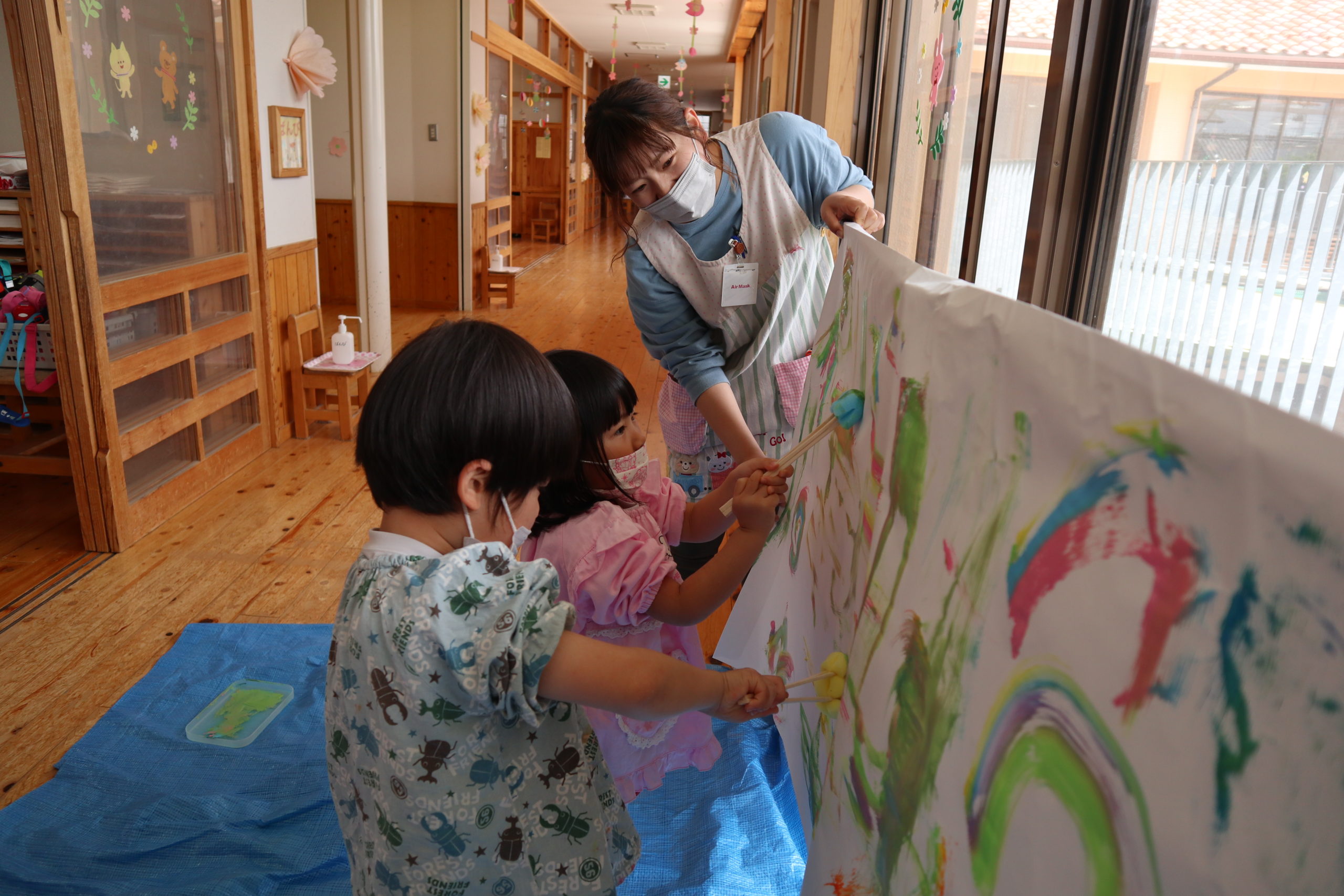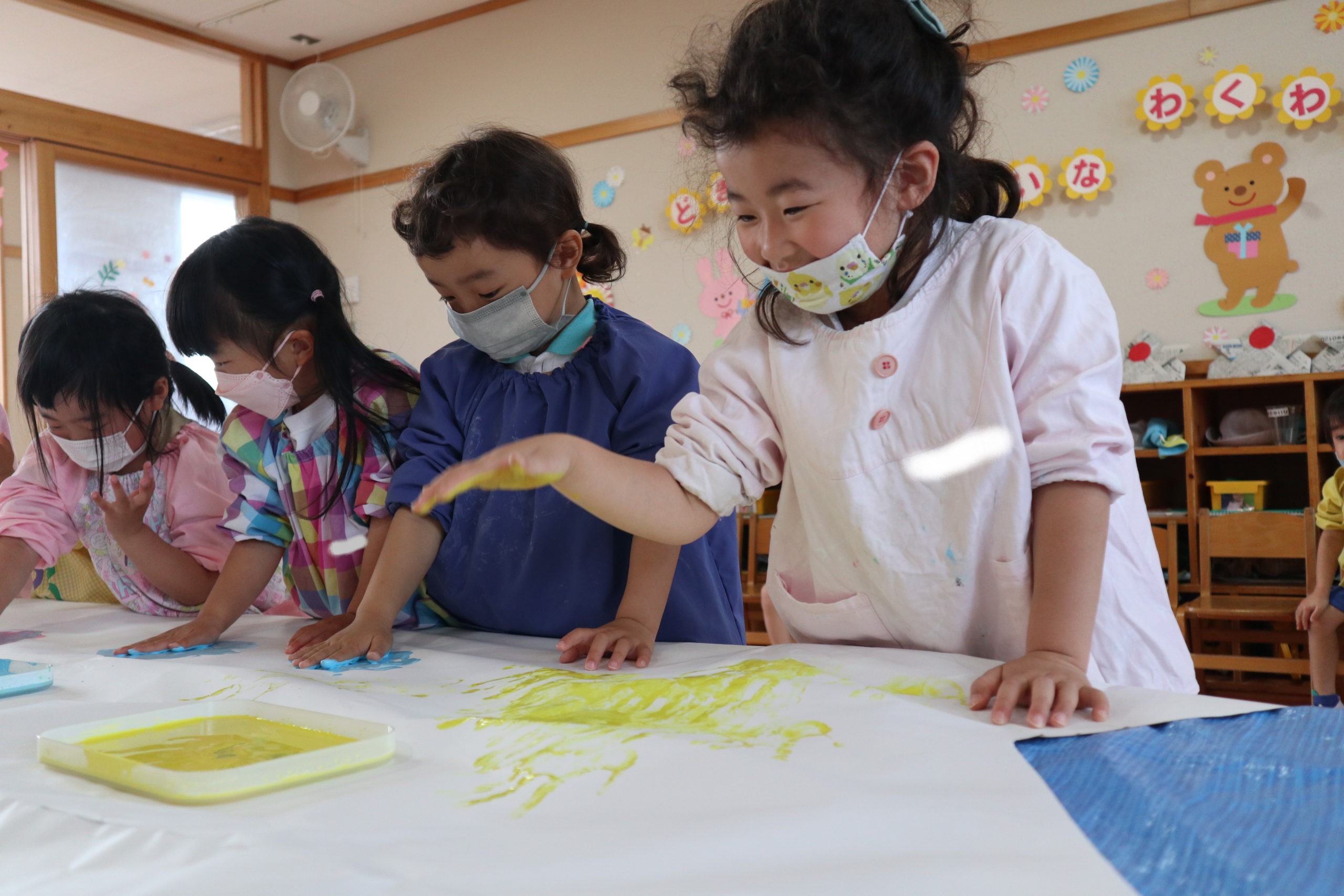 手で、足で、霧吹きで、ローラーで、クラスの大きなこいのぼり作りです。