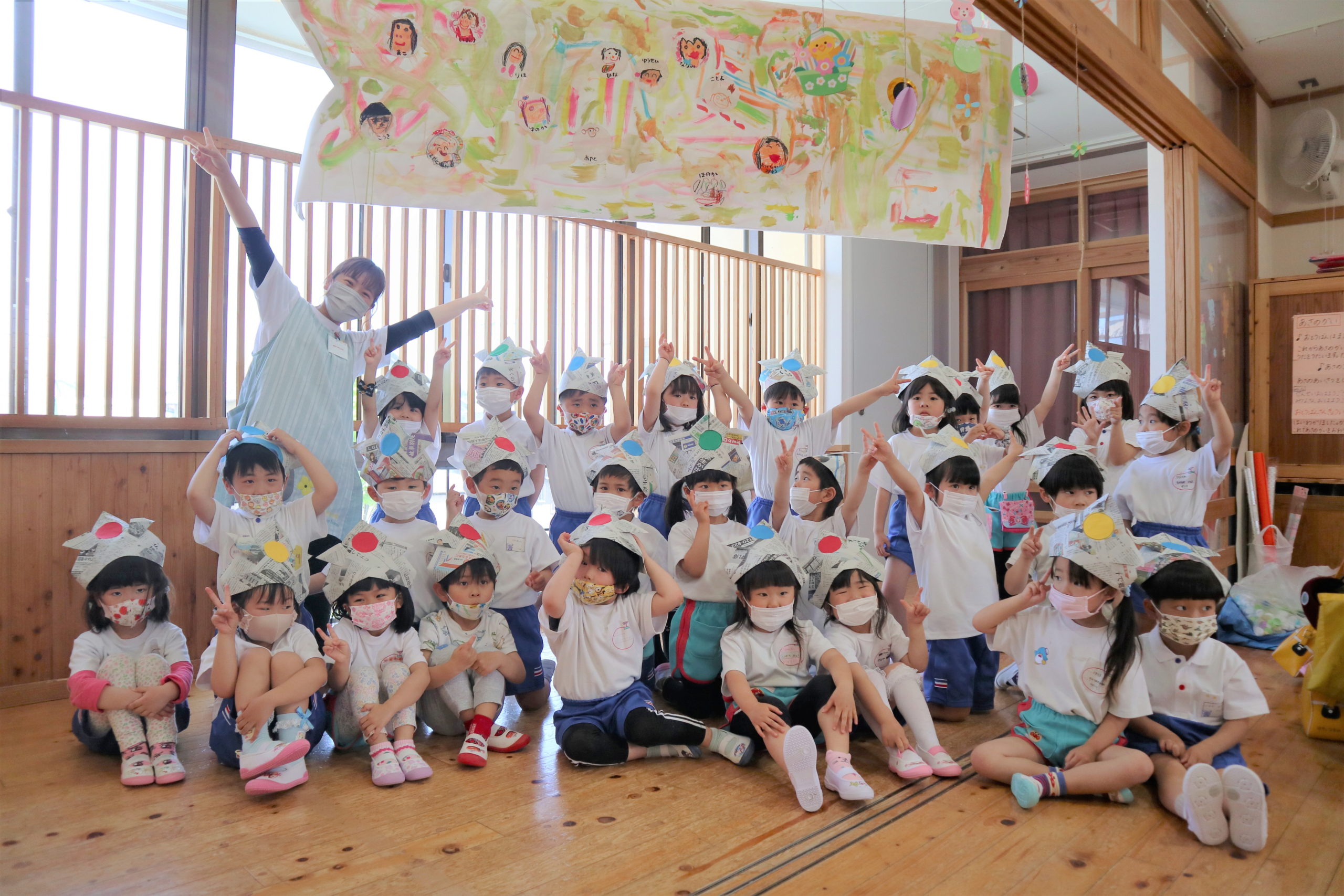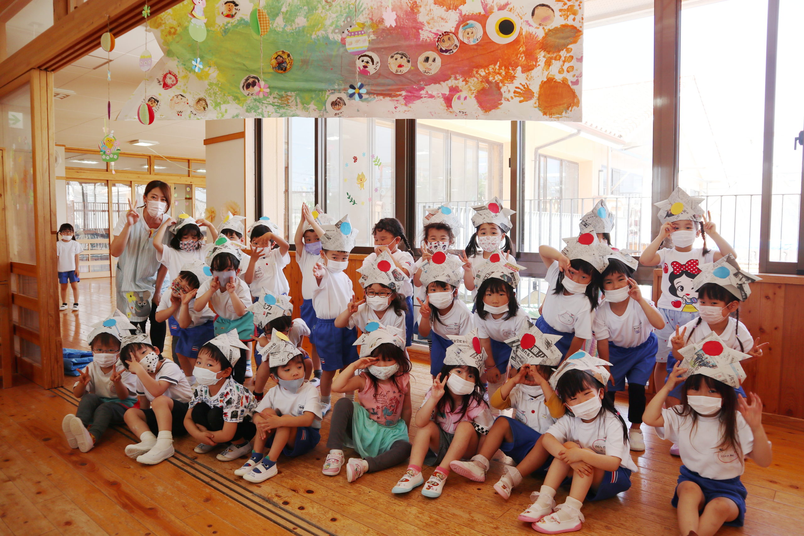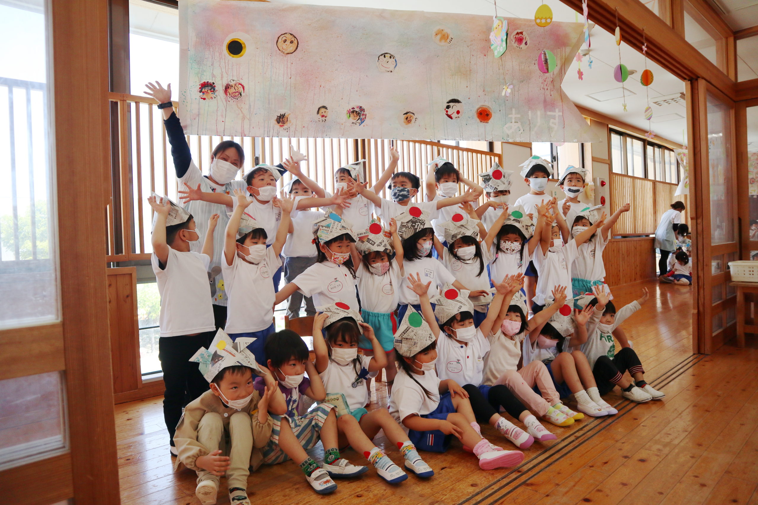 今日は、新しいおともだちと一緒にクラス写真の撮影をしましたが、こいのぼりの下でもパチリ!