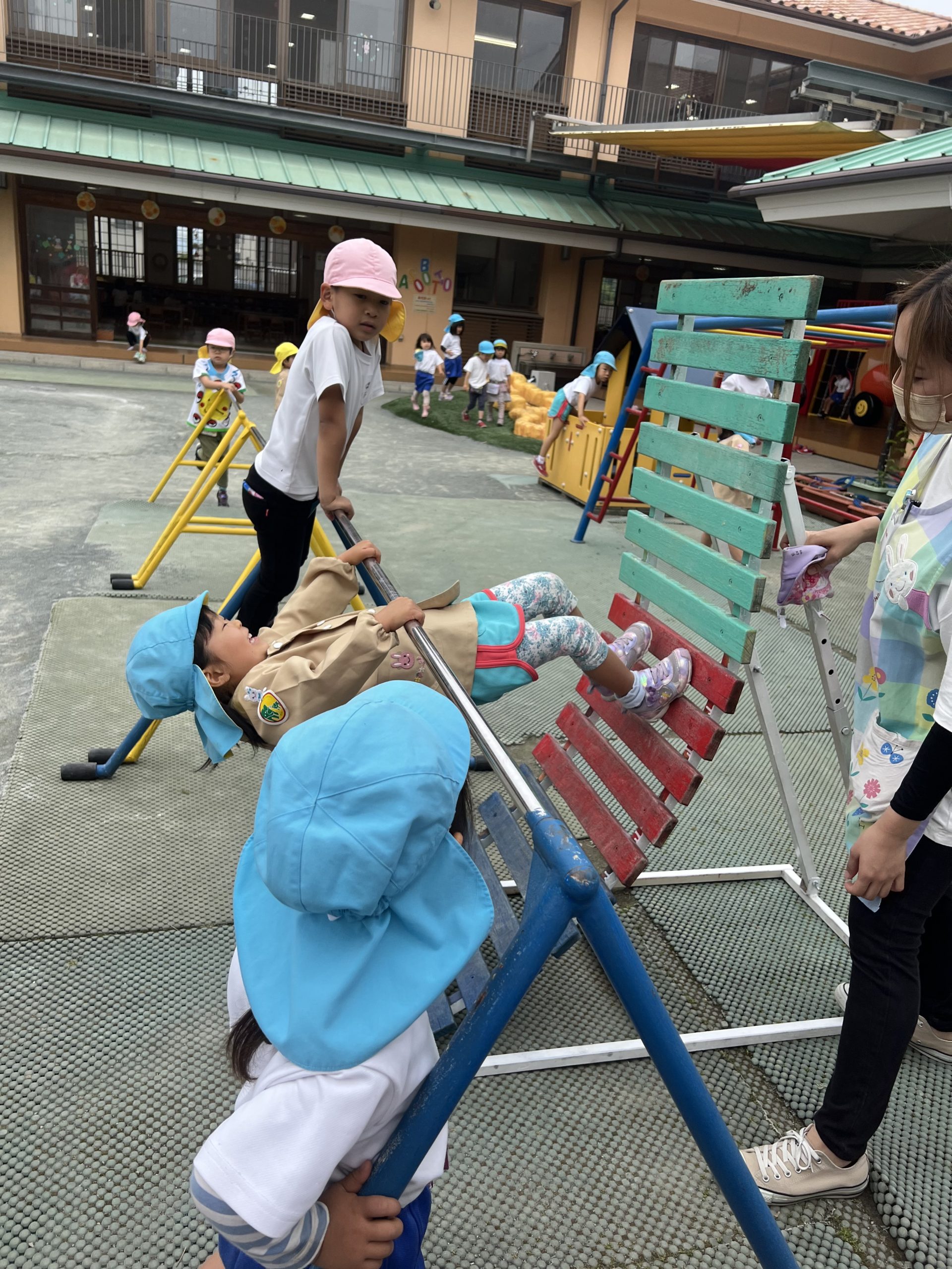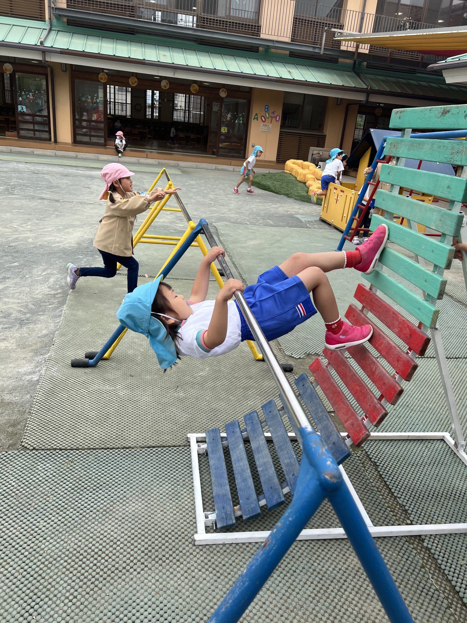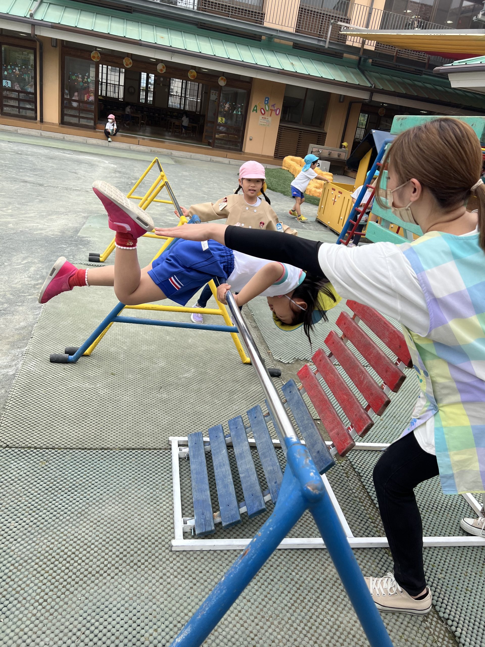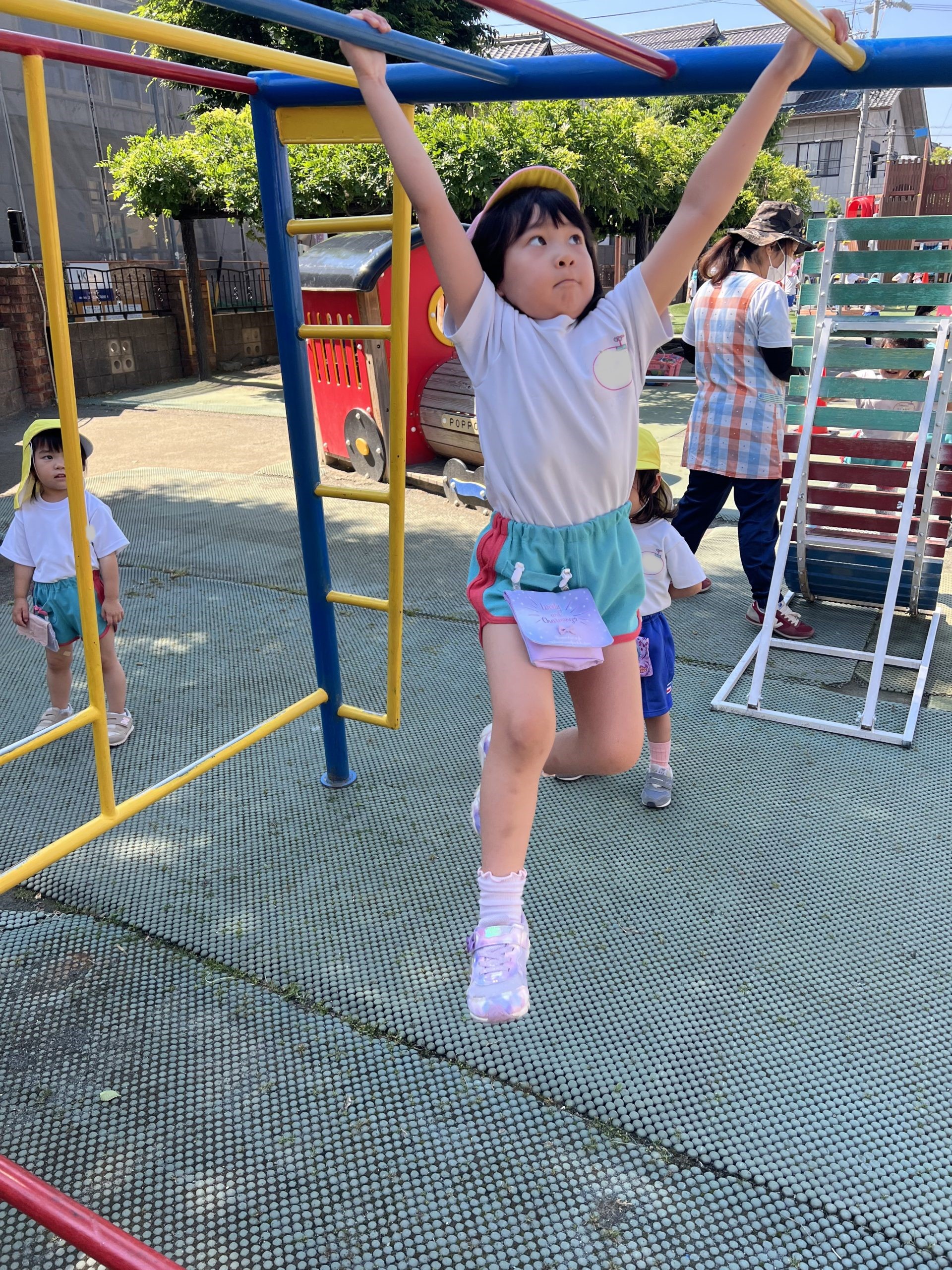 鉄棒には補助板を使って何度も逆上がりに挑戦する子どもたちがいます。