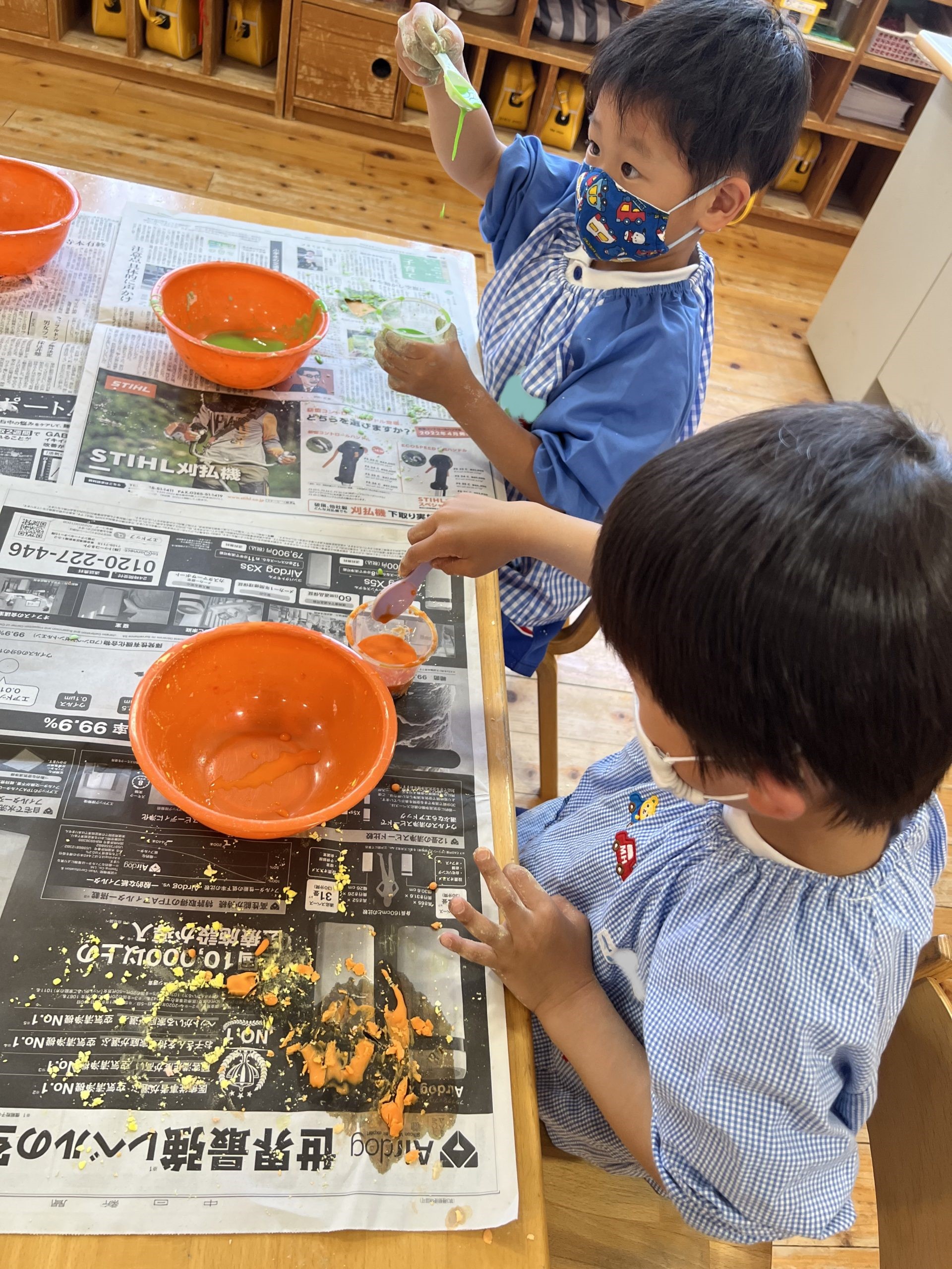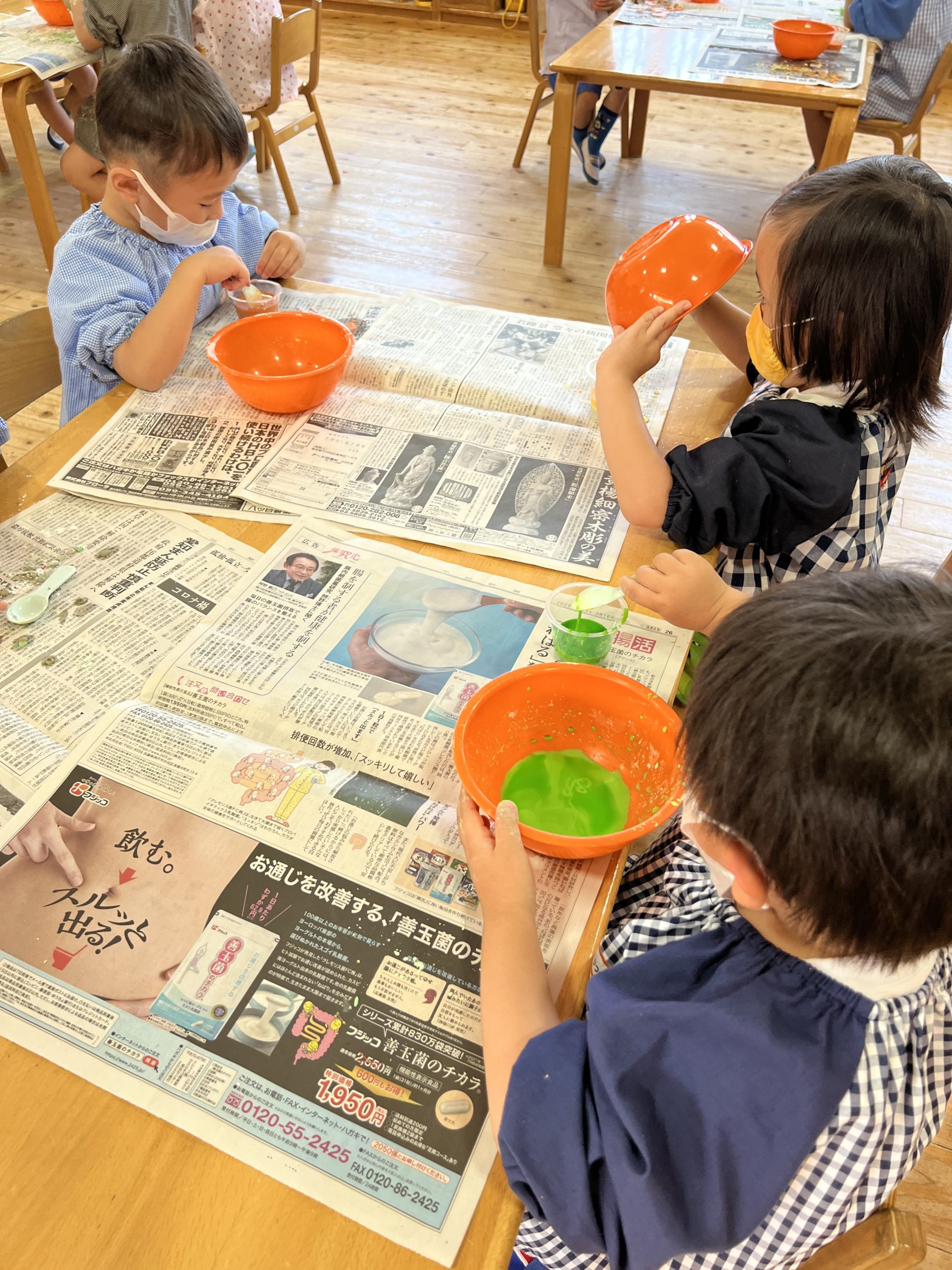 片栗粉に絵の具を混ぜて、気持ちの良い絵の具ができましたね。もくもくと熱中するすみれさんです。