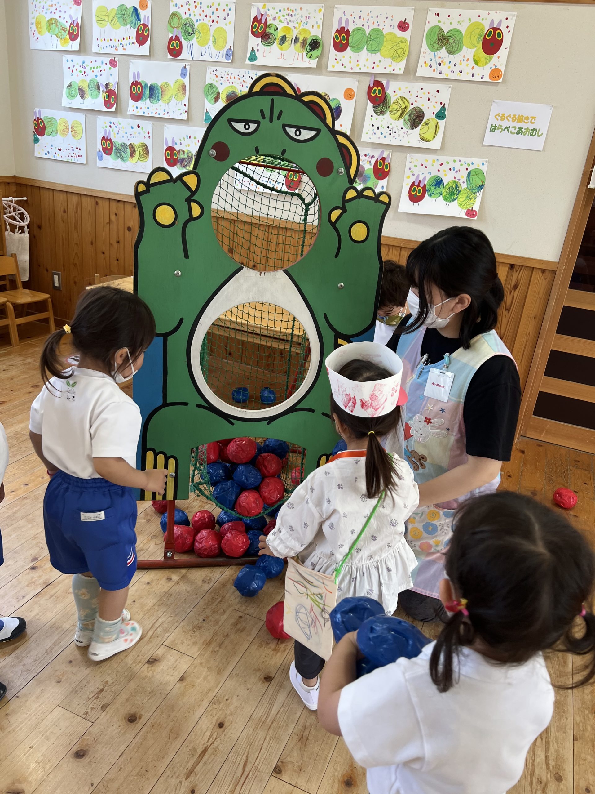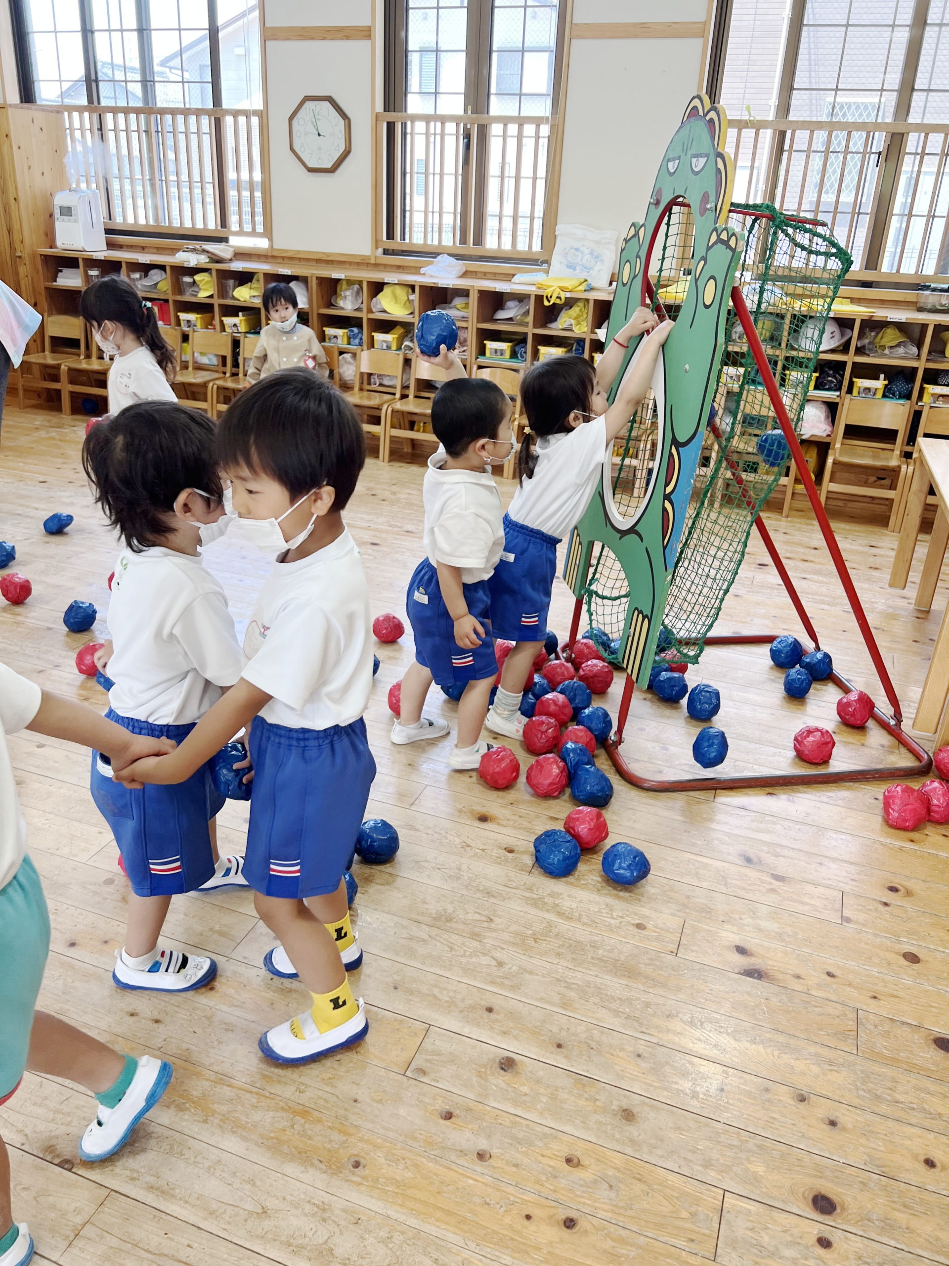 「やっつけよう」とかごをめがけて、コントロールも上手くなってたのしいね、ゆりくみさんです。