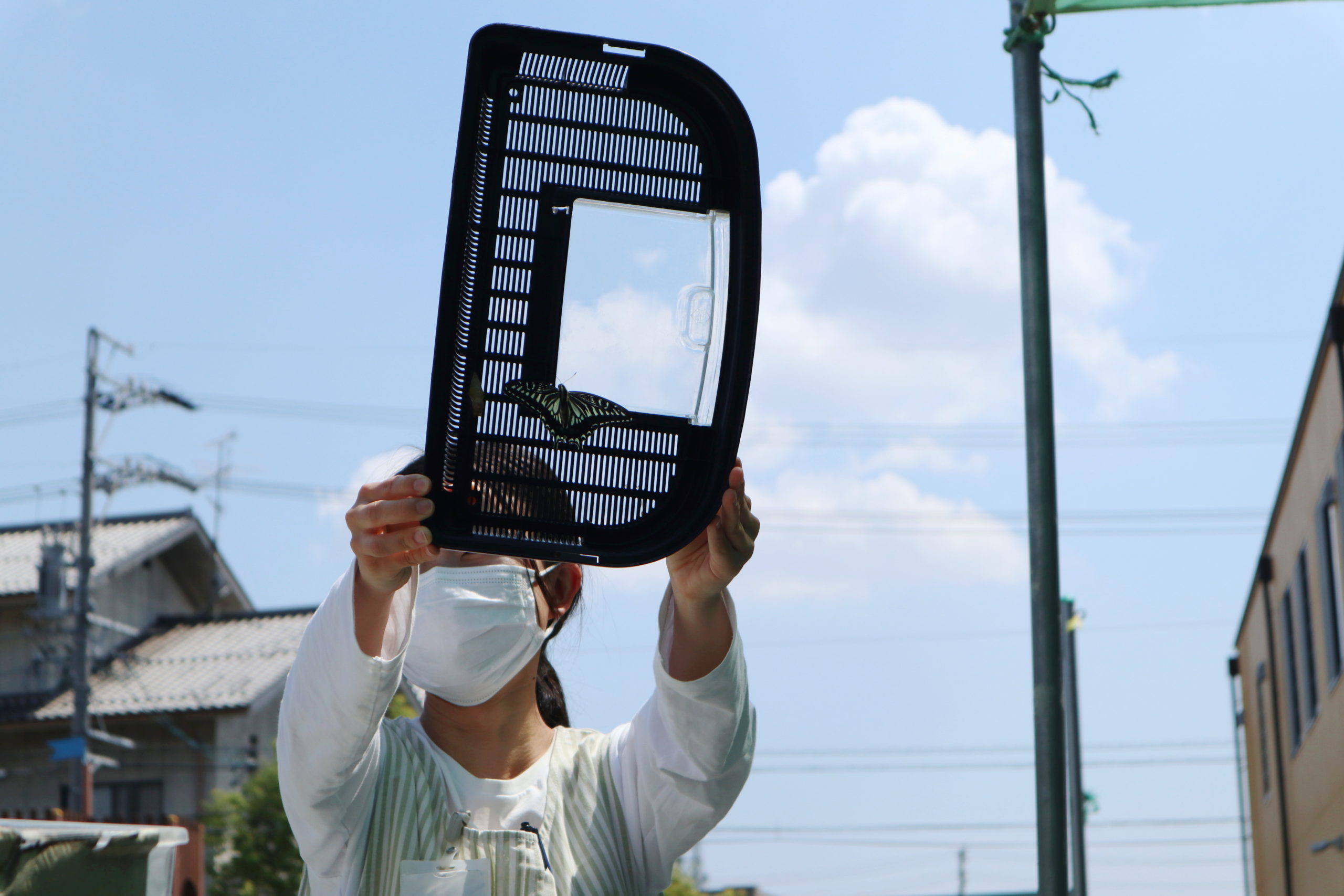 放送後、みんなが集まってきました。 大空高く舞い上がった2匹のチョウは、