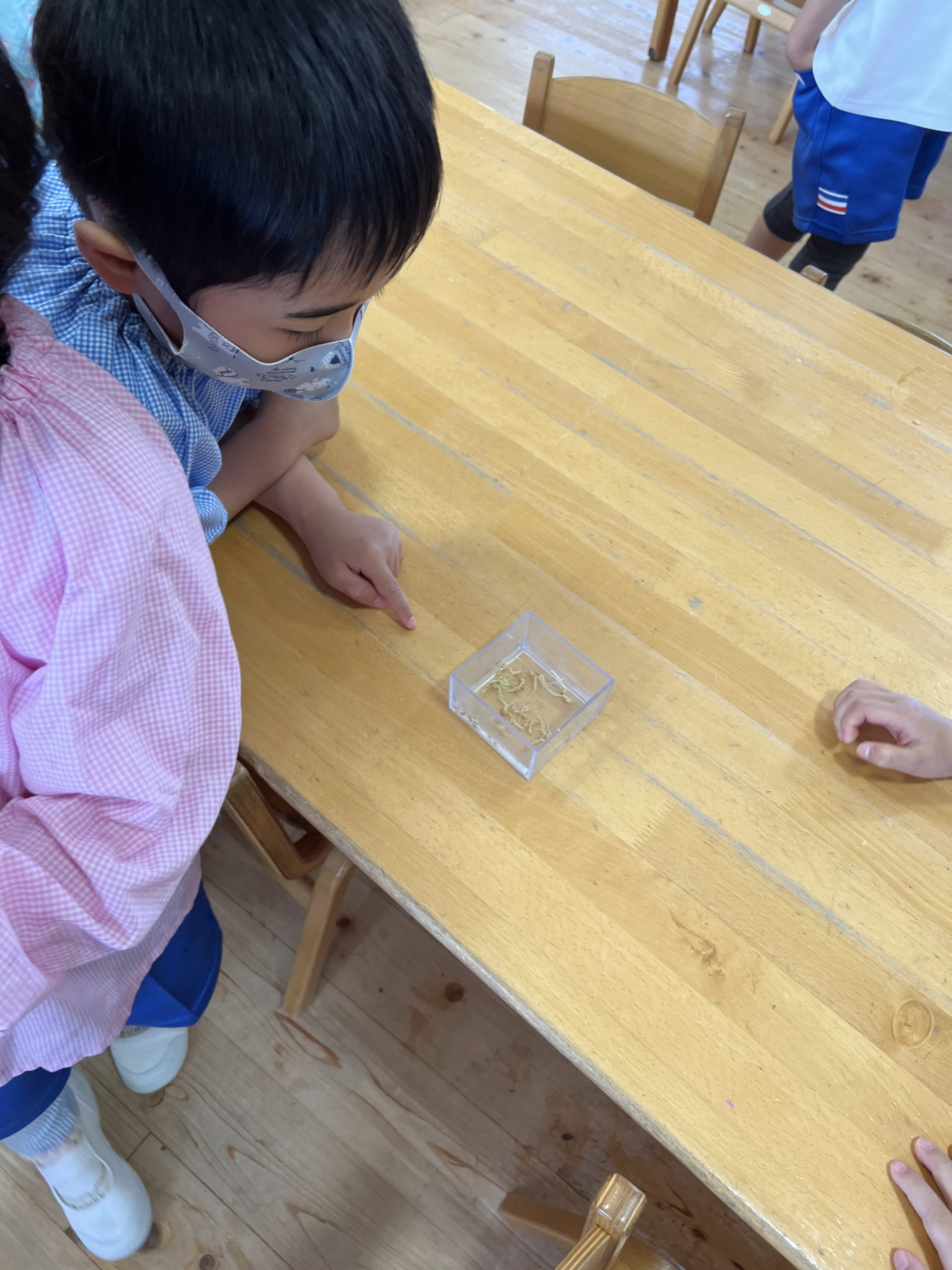 5月16日 こねた土に発芽した種を植えました。 不思議そうですね。