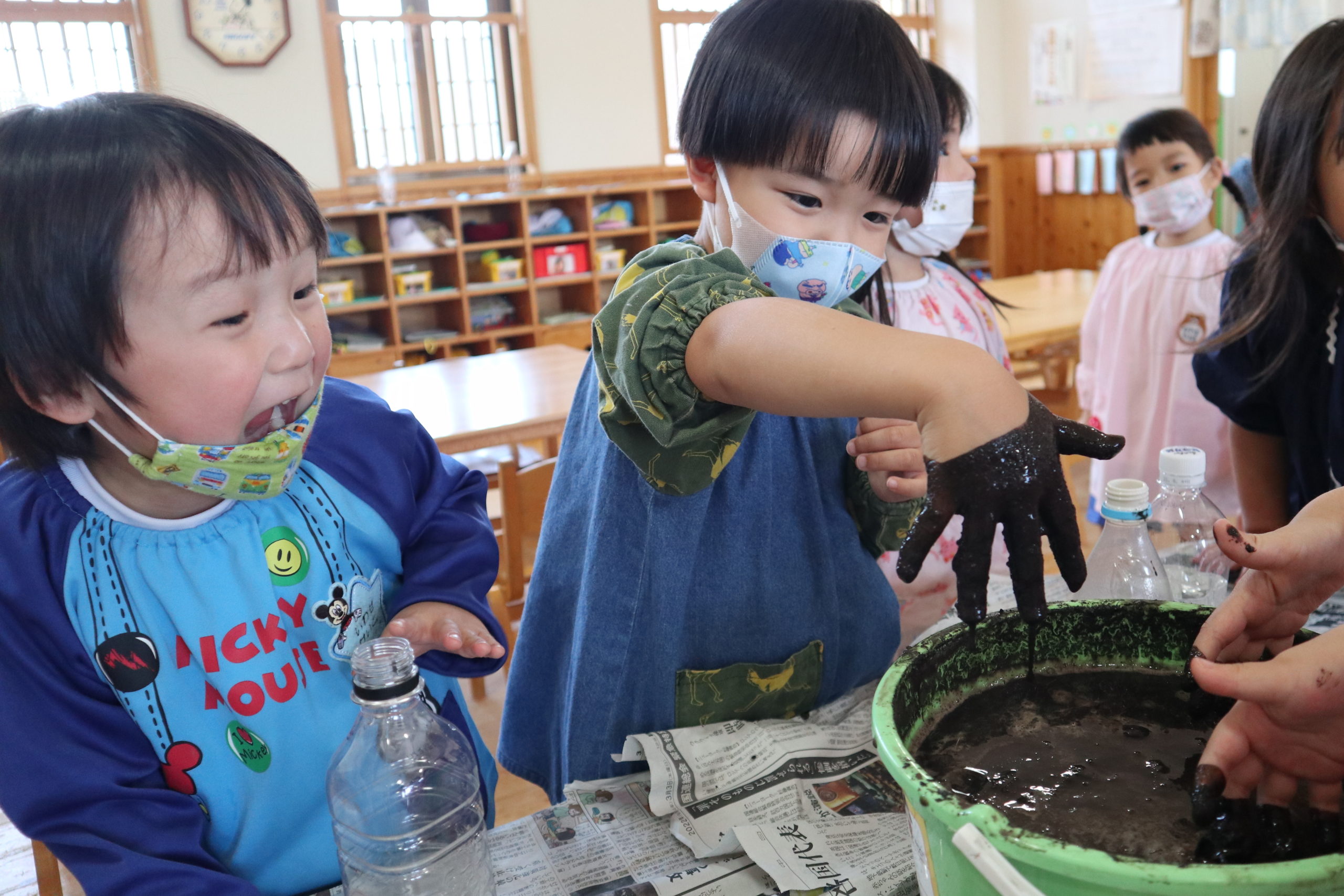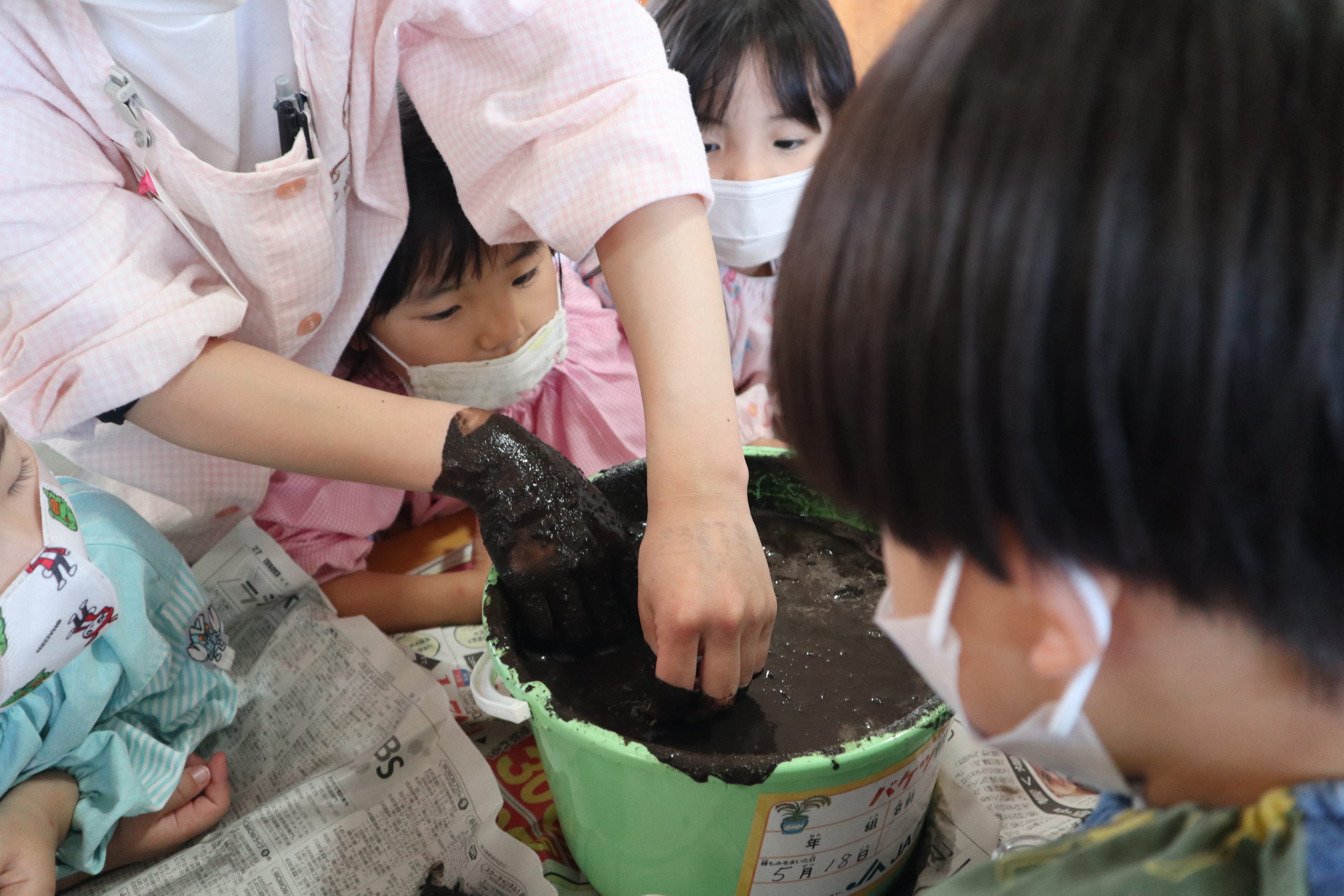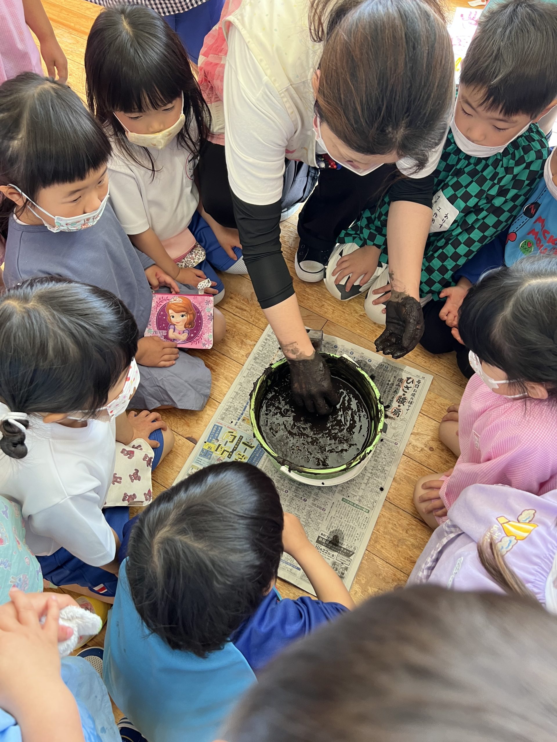バケツの土は真っ黒 バケツの中で土を混ぜたよ! 嬉々として泥んこ遊びをする子もいれば、ねちゃねちゃして・・・・気持ち悪い・・・。さまざまですね。