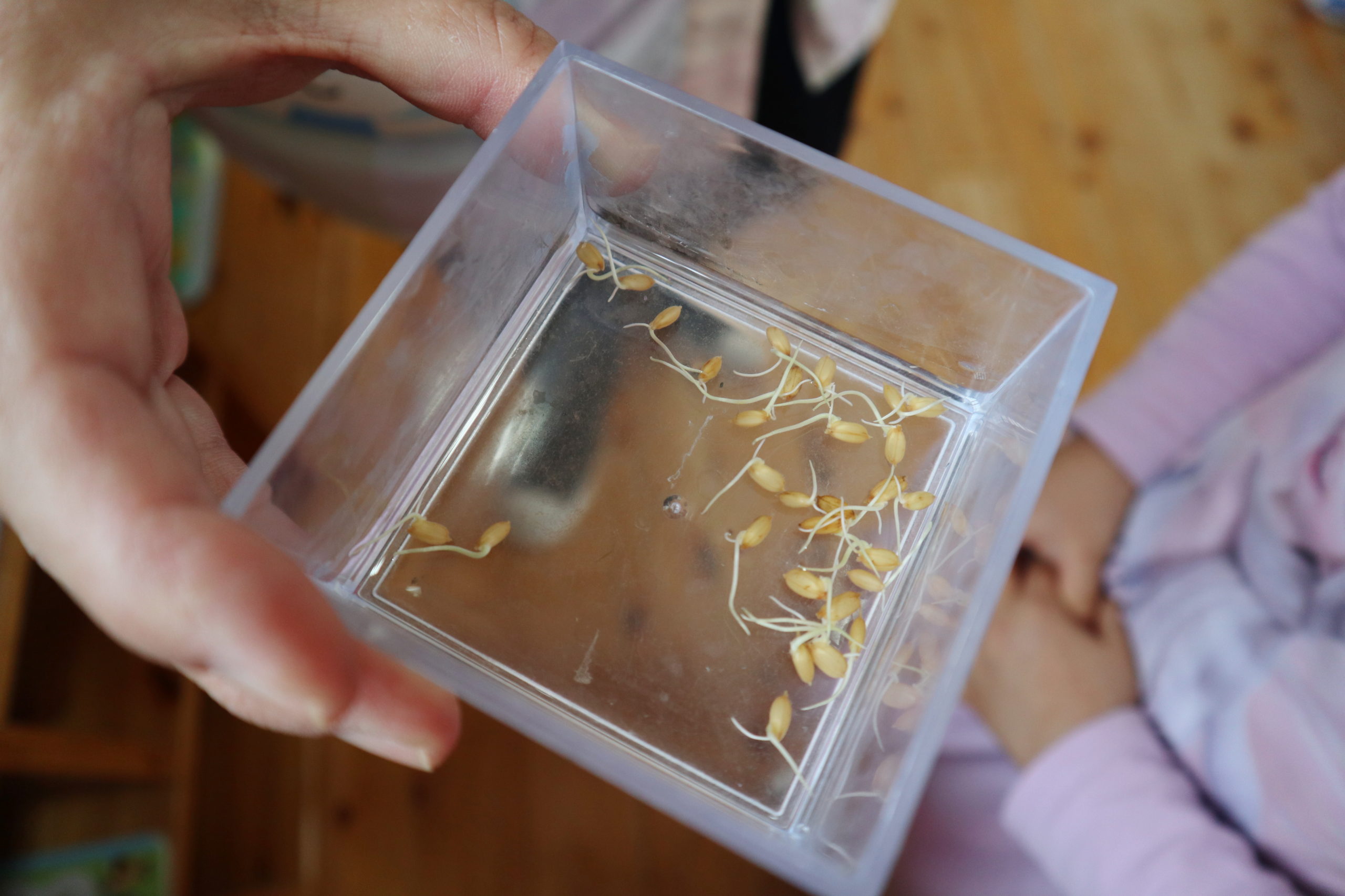 まず種もみを水に浸しました。そして芽が出るのを待っています。