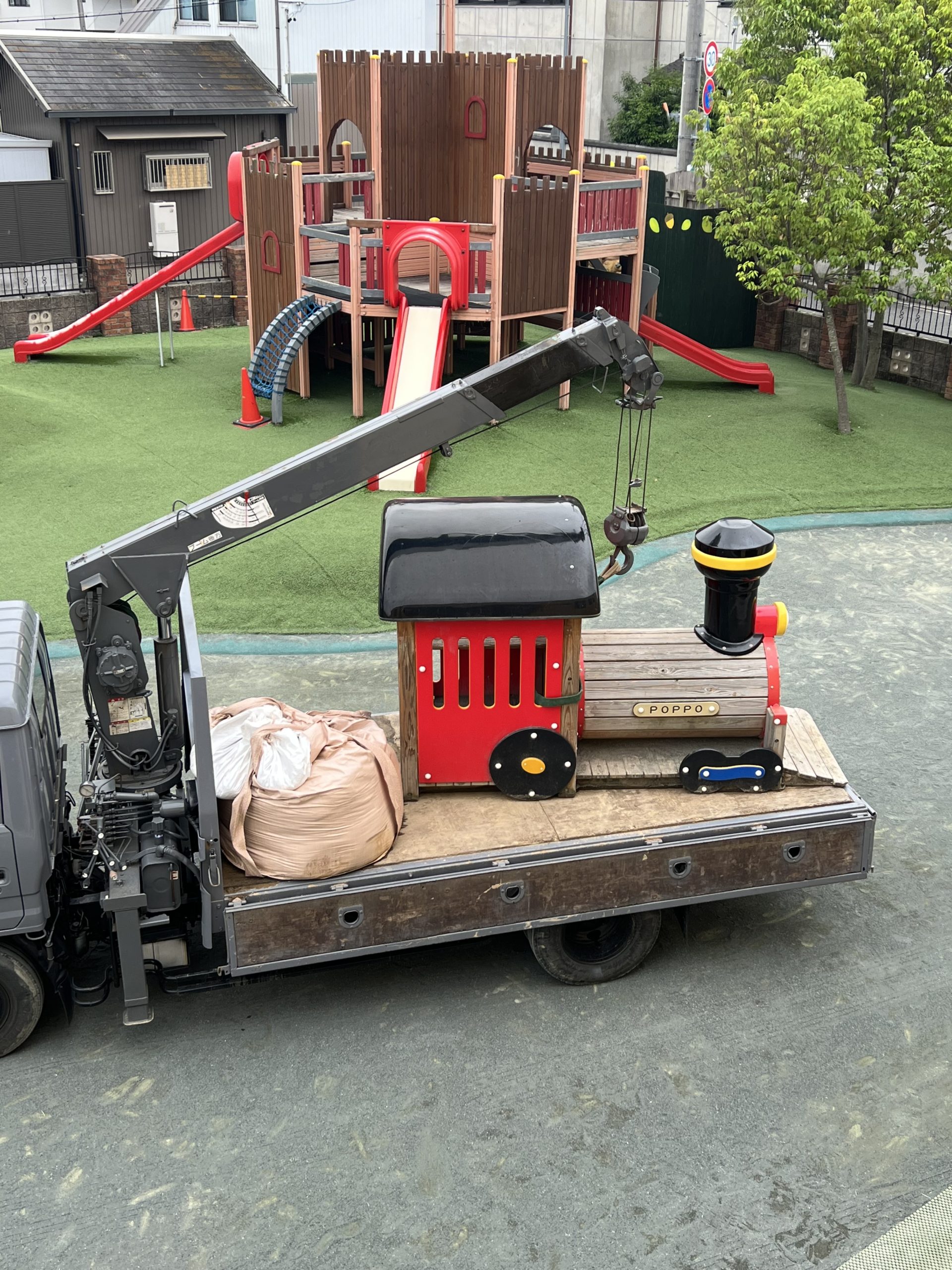 きしゃぽっぽをクレーン車で移動していただいて・・・・・新たなあそび場の誕生です。