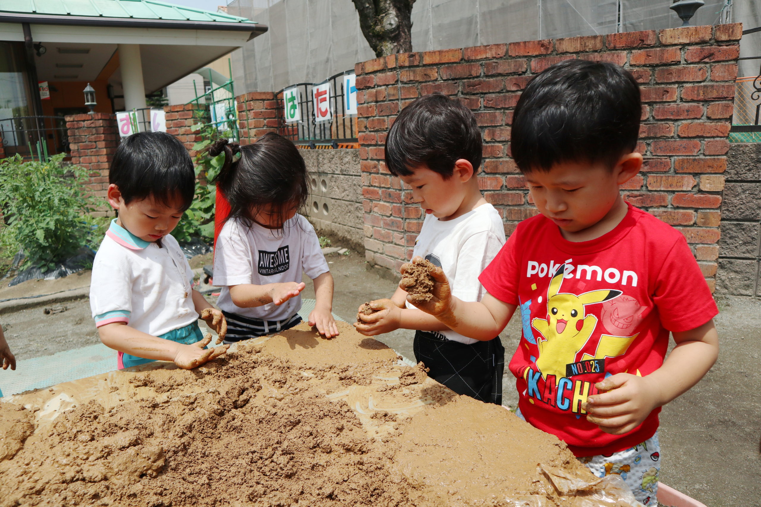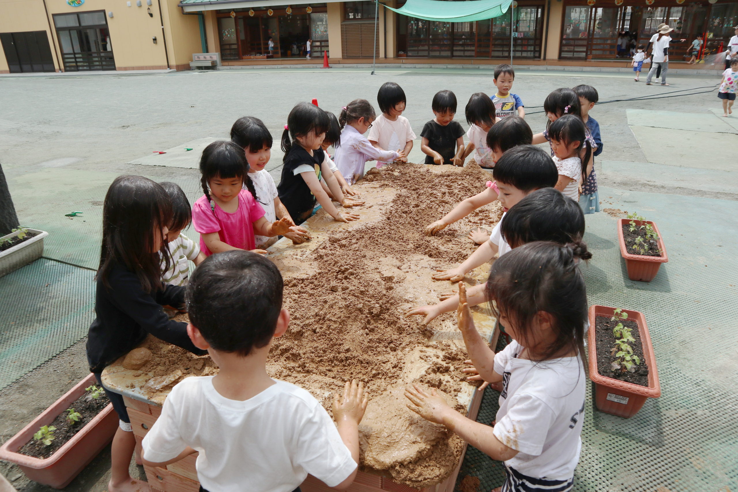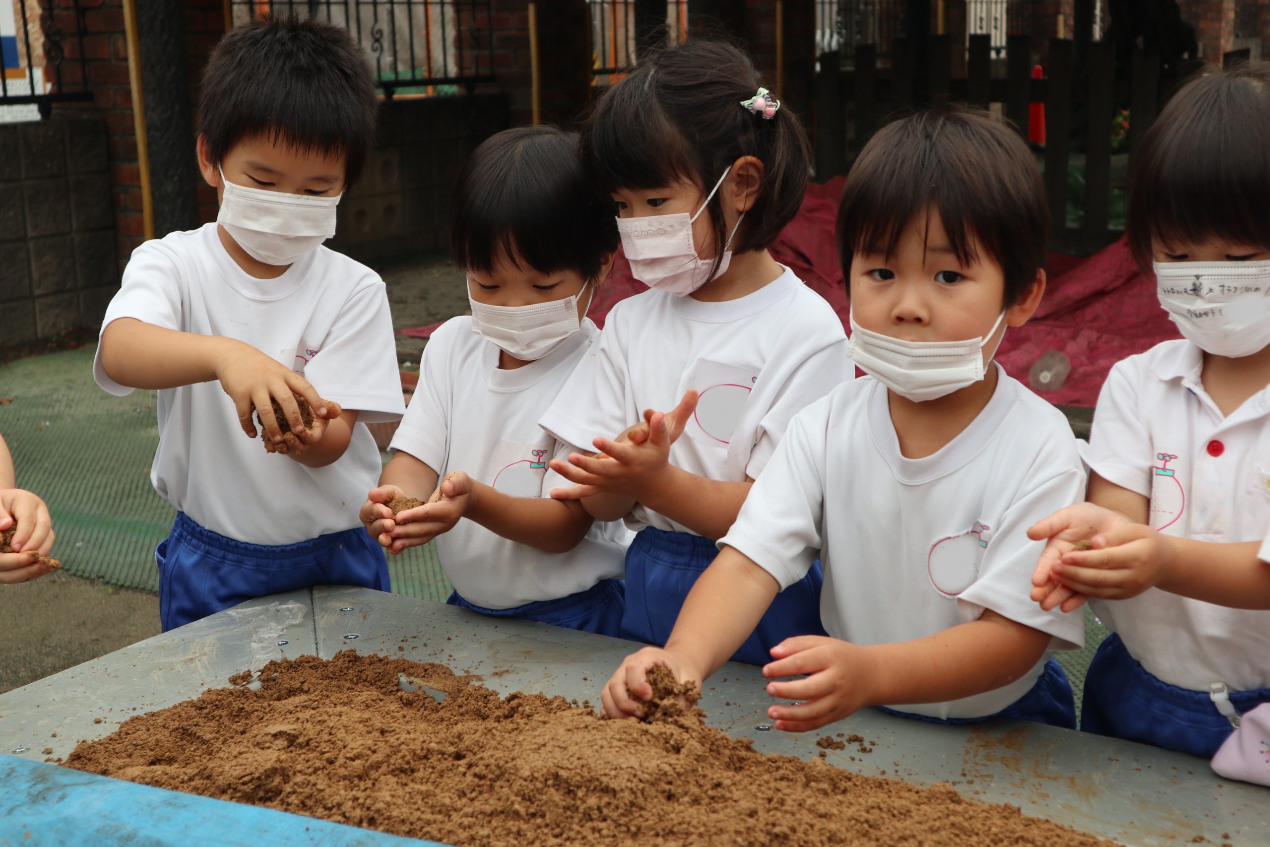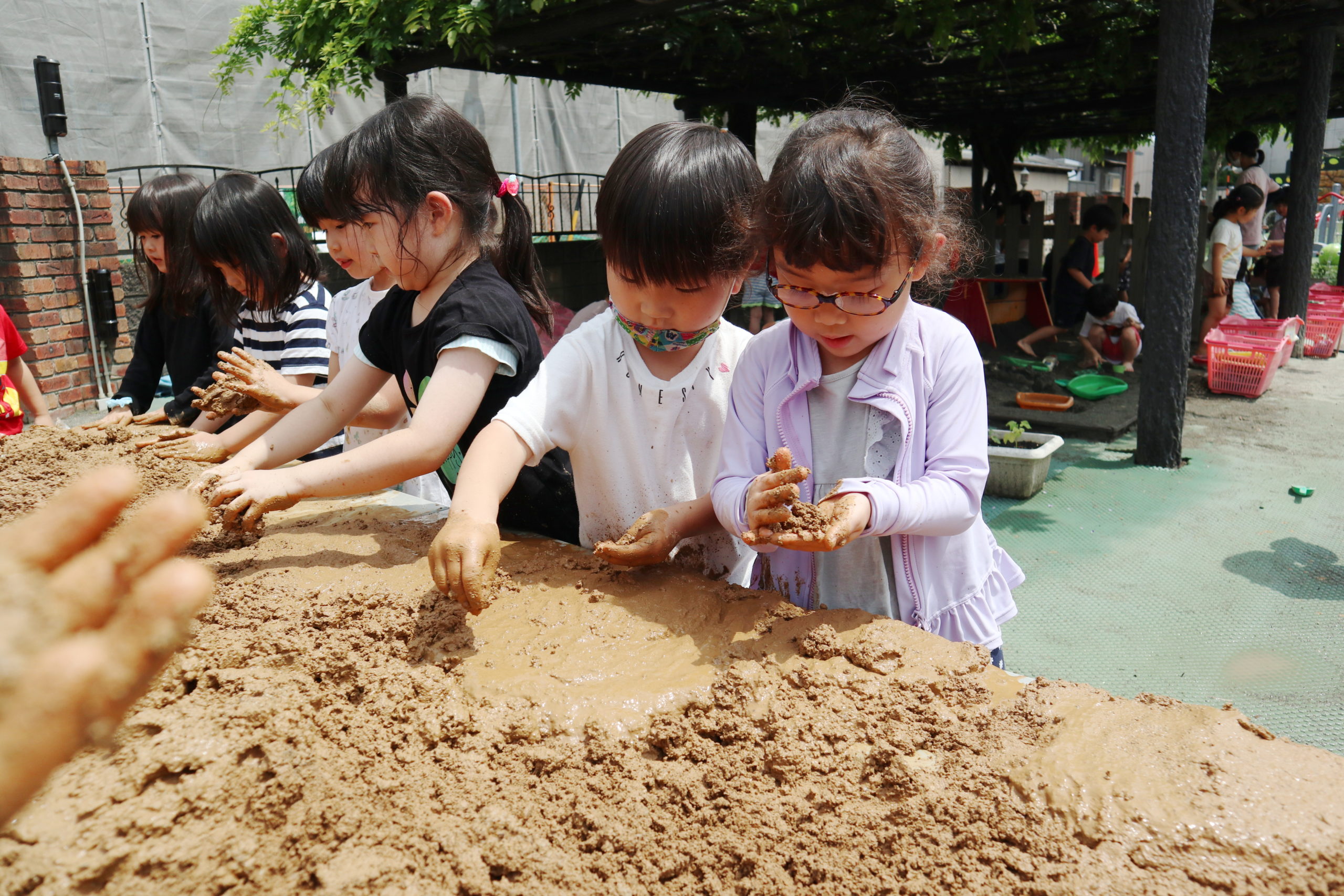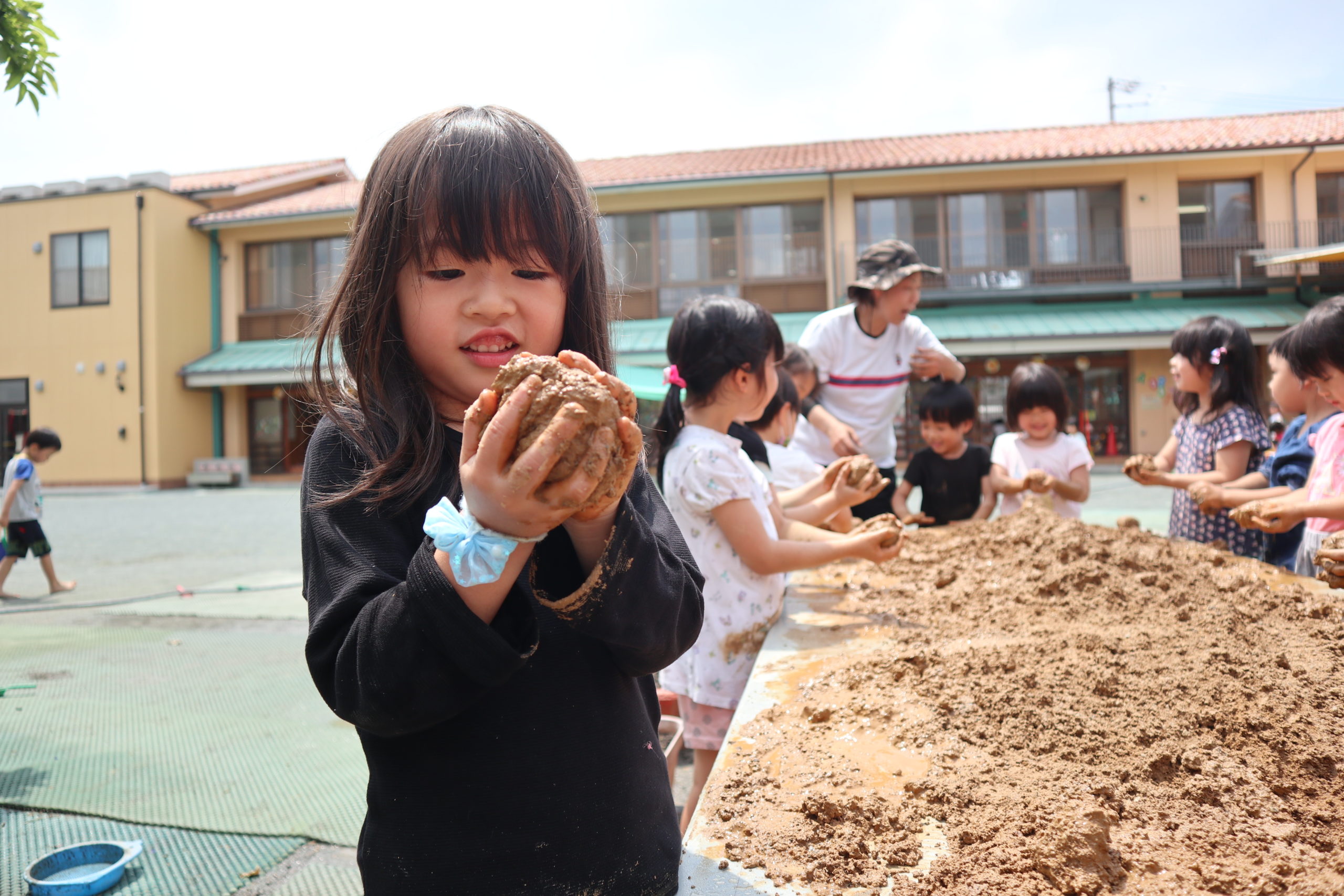 ねっとり手にまつわりつく感触がたまらないようで、離れられずにいつまでも遊ぶ子、恐る恐る土に触れる子、「わたし、てがよごれるから・・・・」でもみんなにつられて「わたしも、しよっと」。