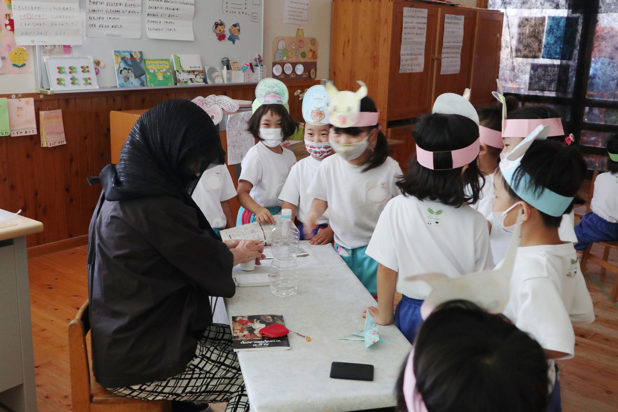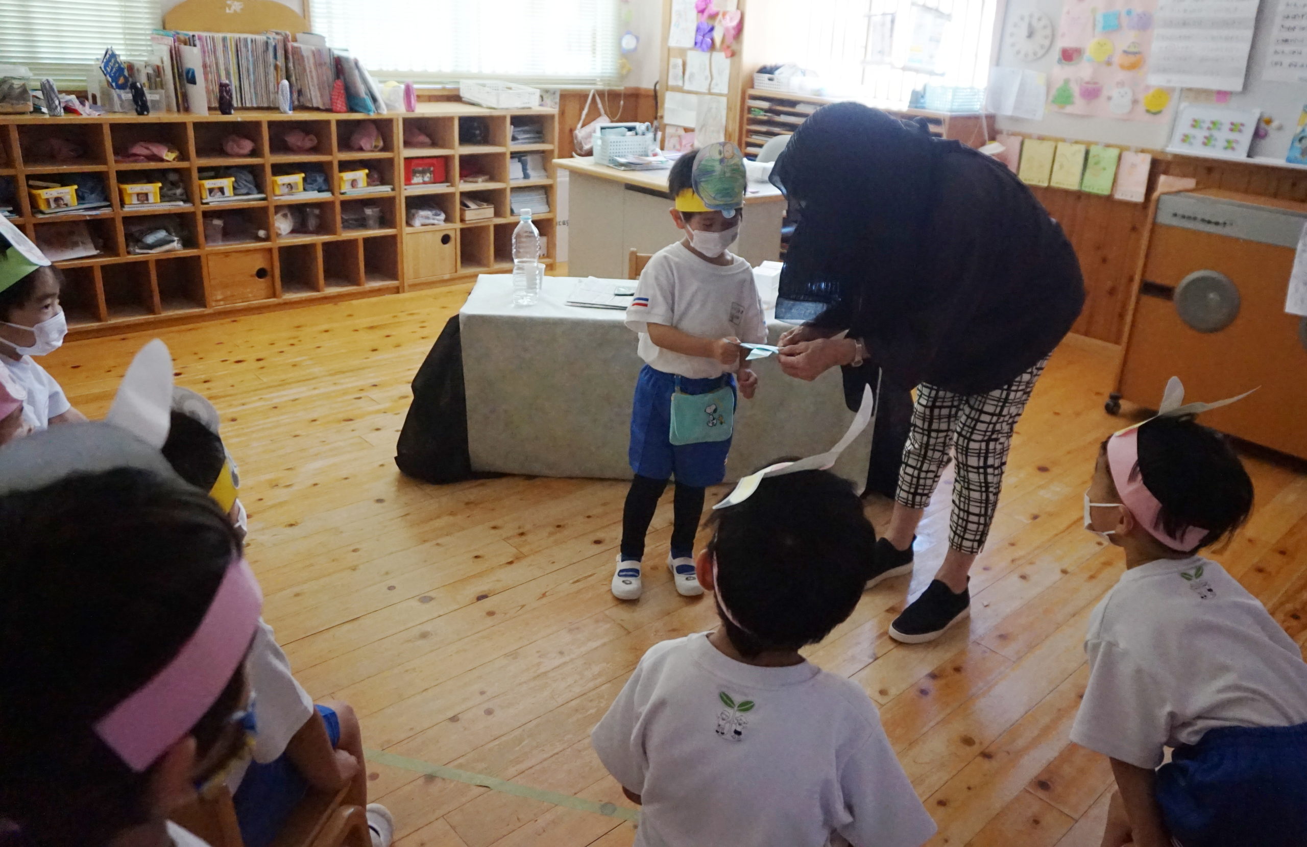 指隠しの術をしたところ、「たいへん、ばんどえいど。ばんそうこう。」と子どもたちが私の指を心配をして大騒ぎに。
