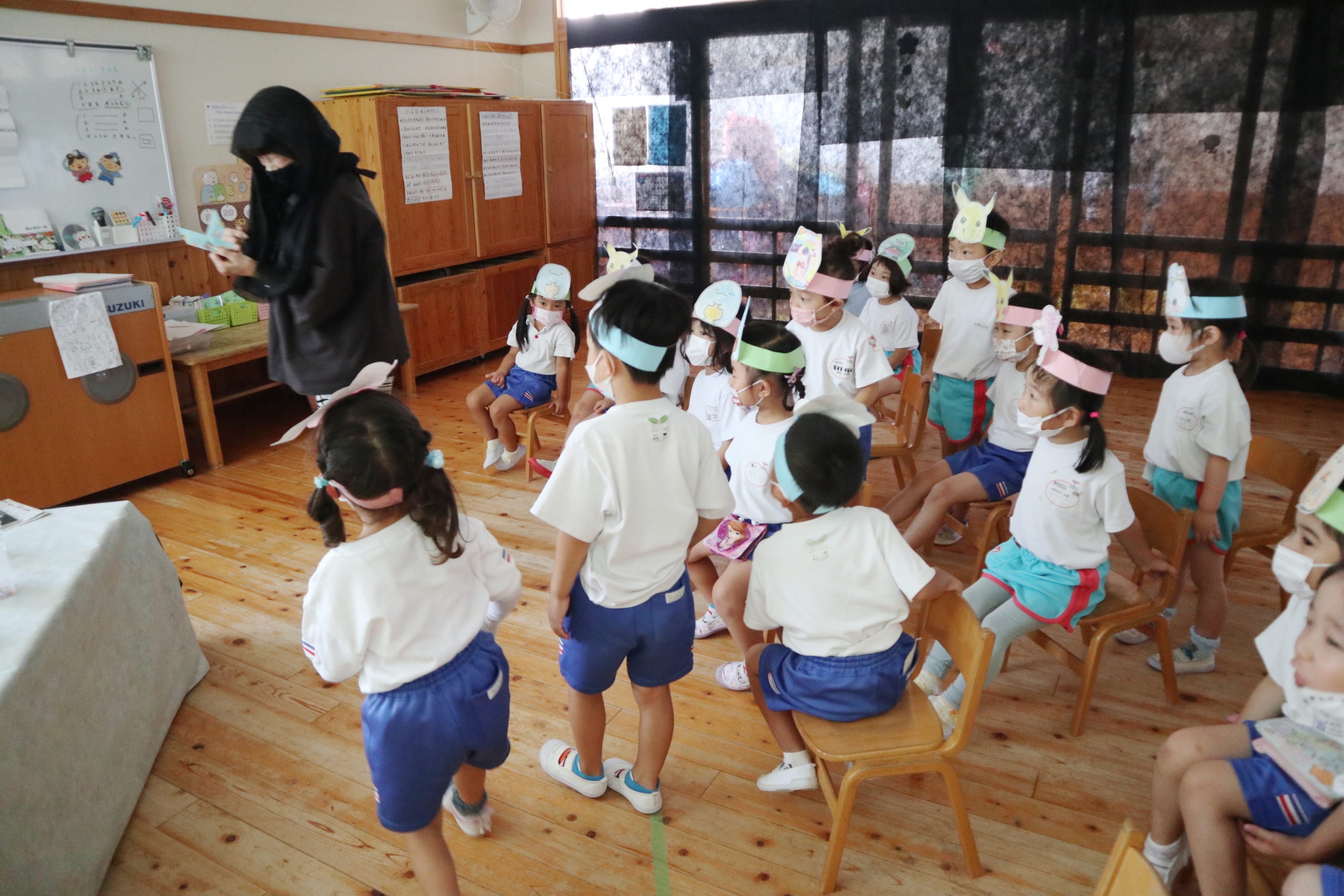 「ぜったいえんちょうせんせいだとおもうな!」と自身を言い聞かせるように首をかしげながら半信半疑の子どもたち、