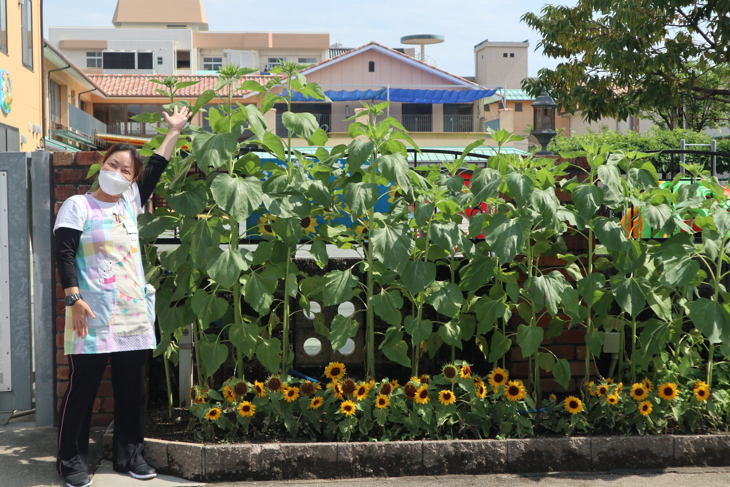 ひまわりはみなさんの背どころか、晃子先生を抜いておおきくなっちゃったよ。