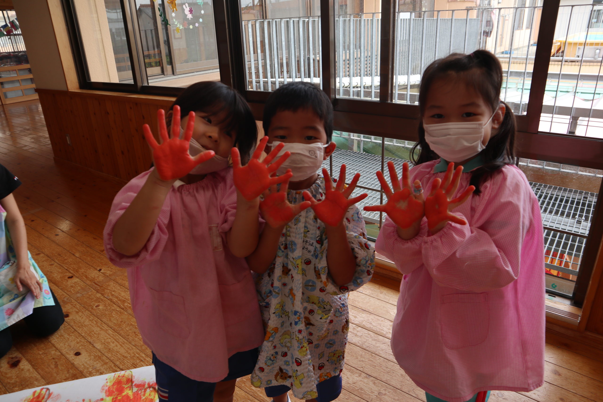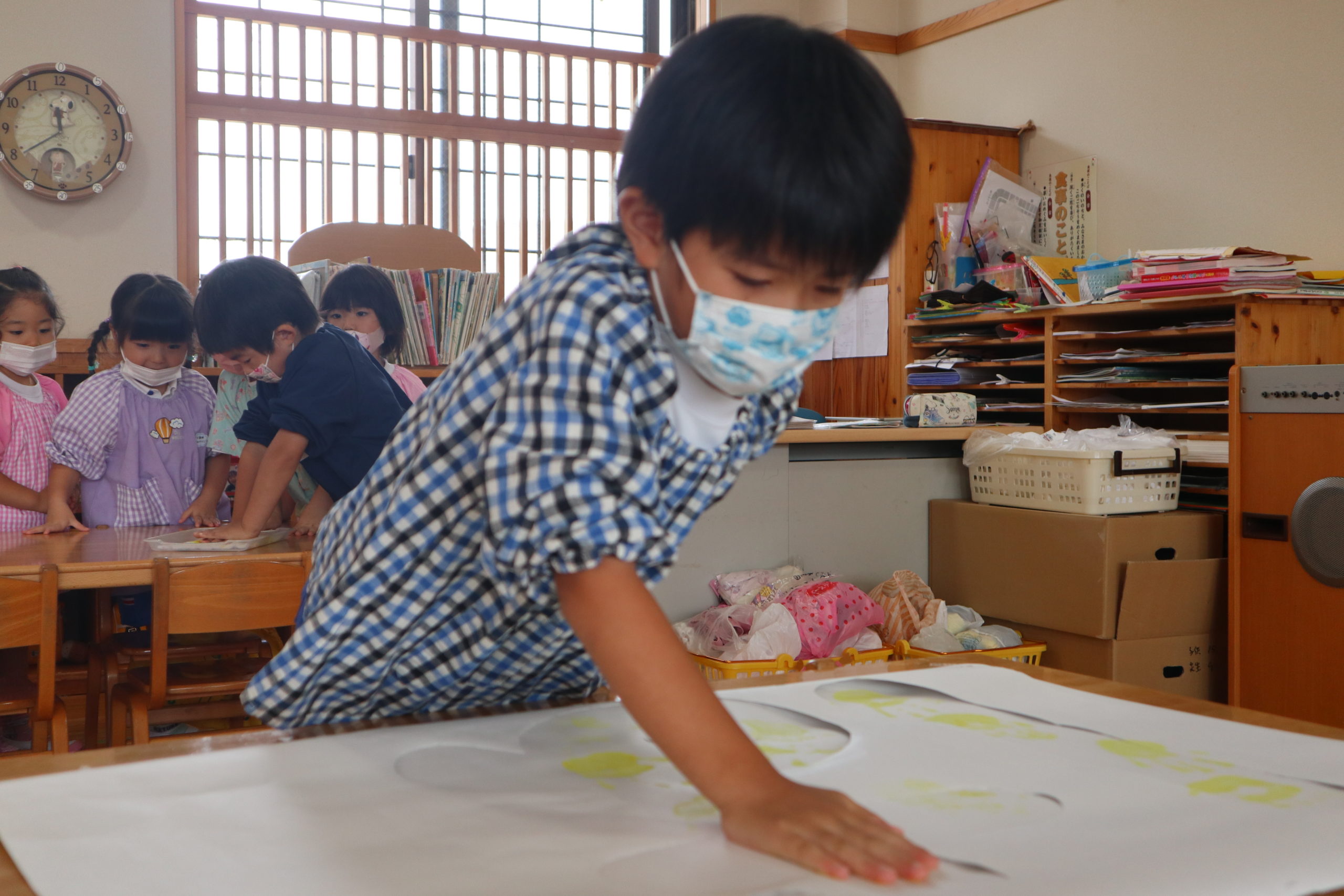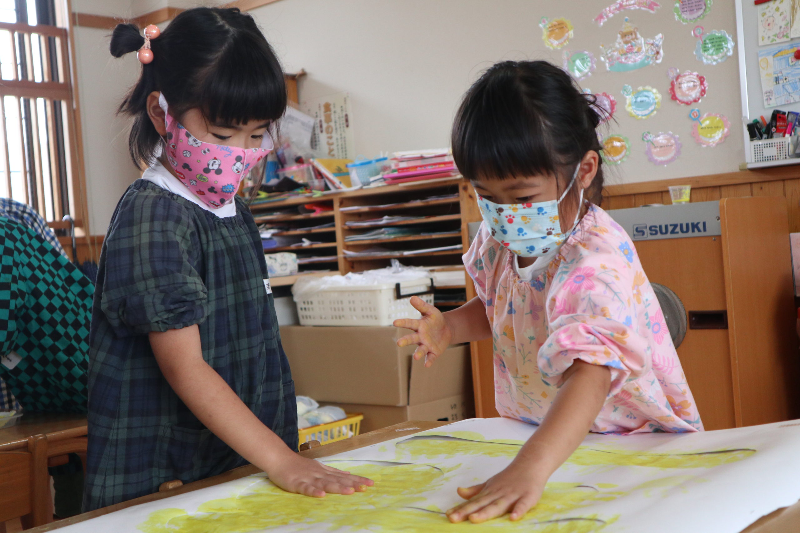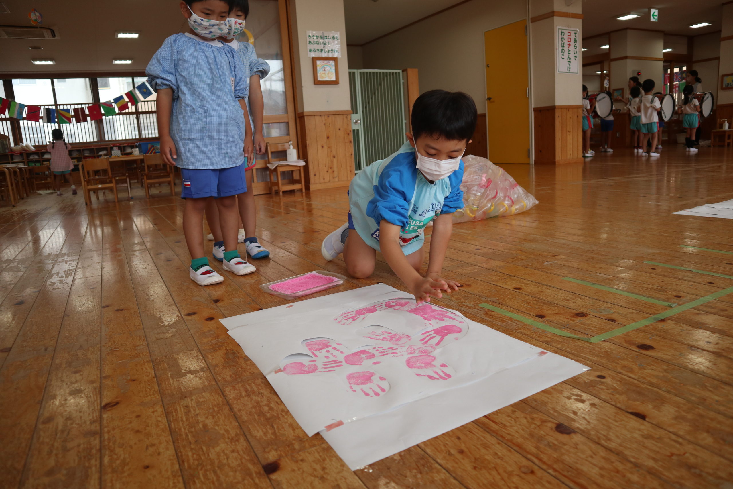 年長組と年中組の9クラスが各クラス一文字を担当してそれを合わせてスローガンを作りました。