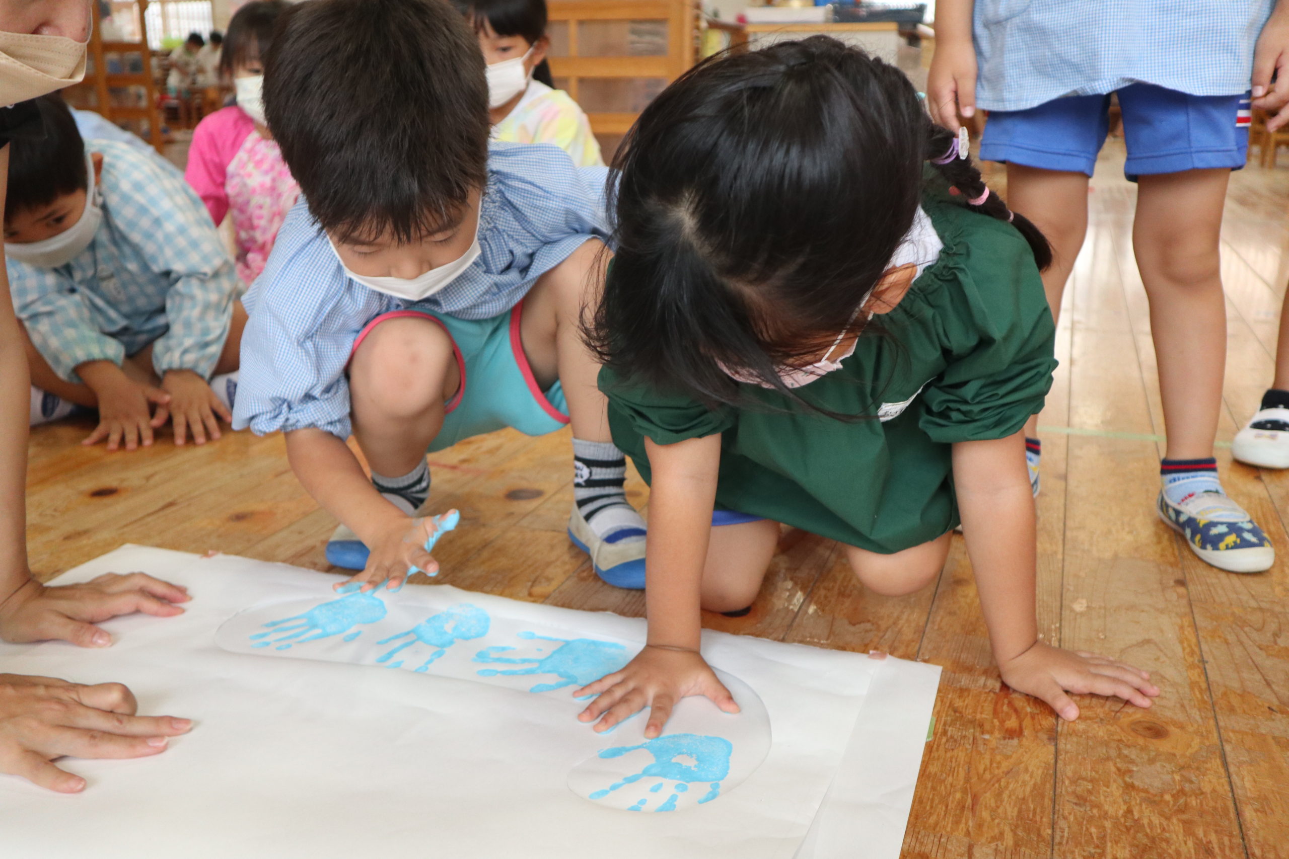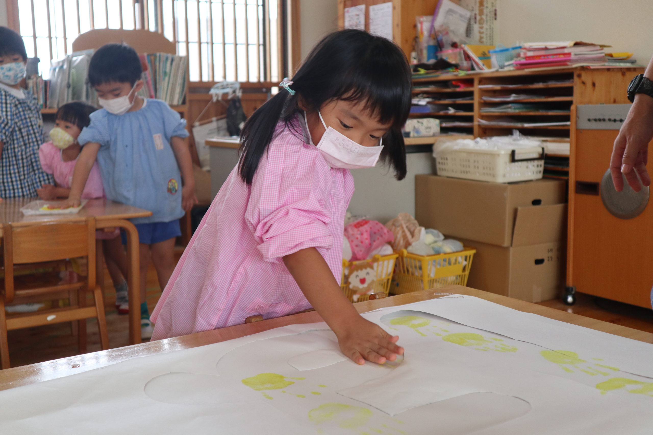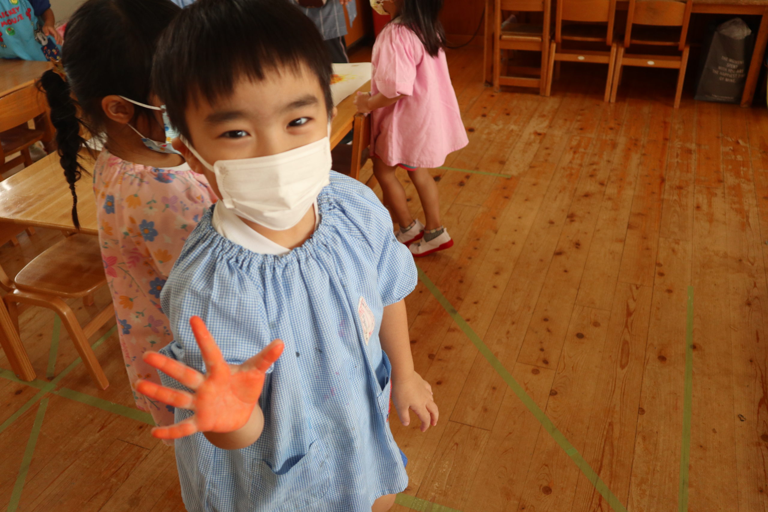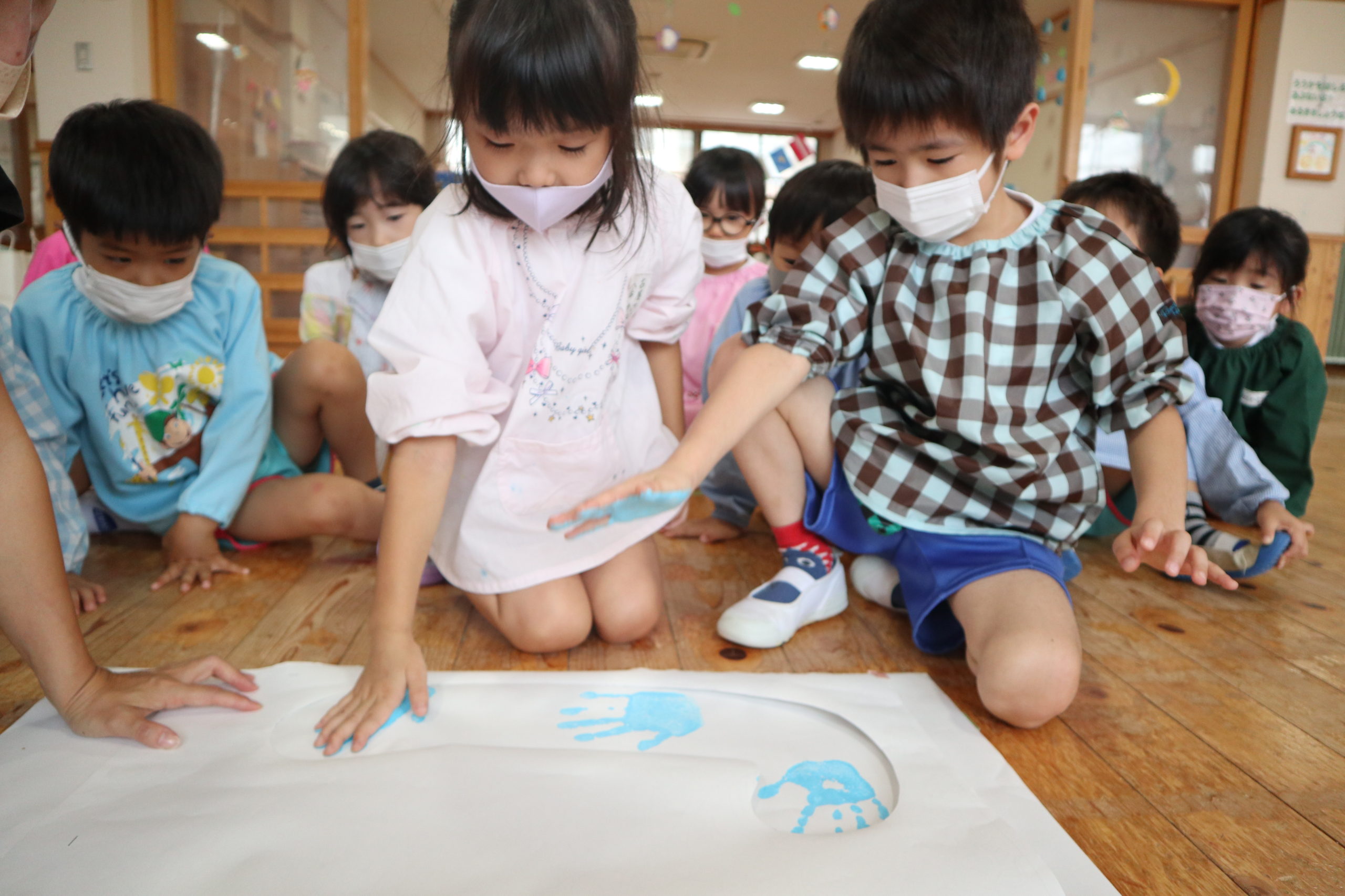 年長組と年中組の9クラスが各クラス一文字を担当してそれを合わせてスローガンを作りました。