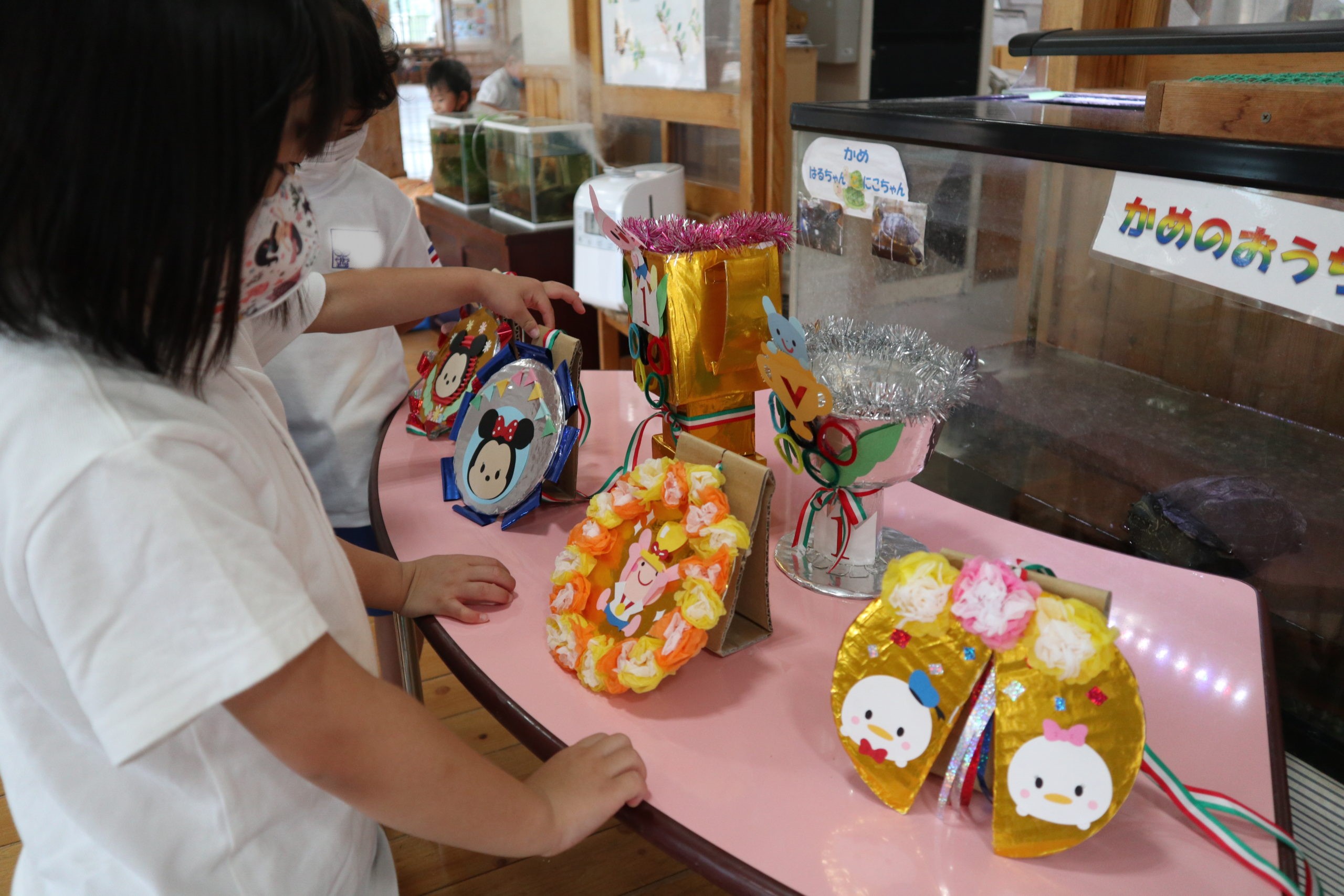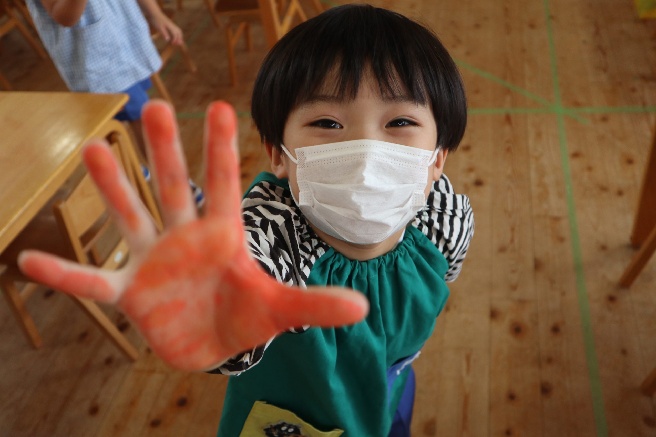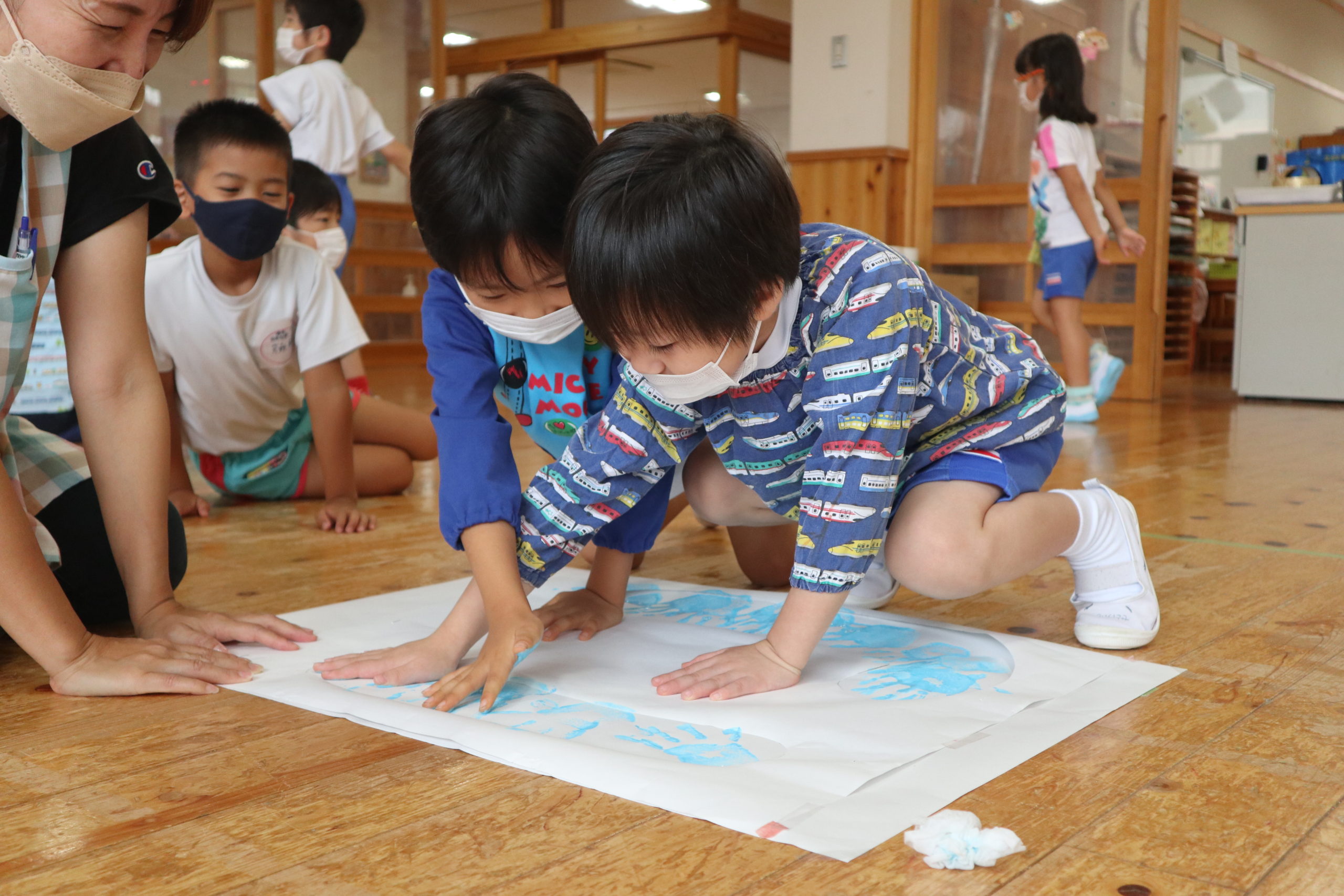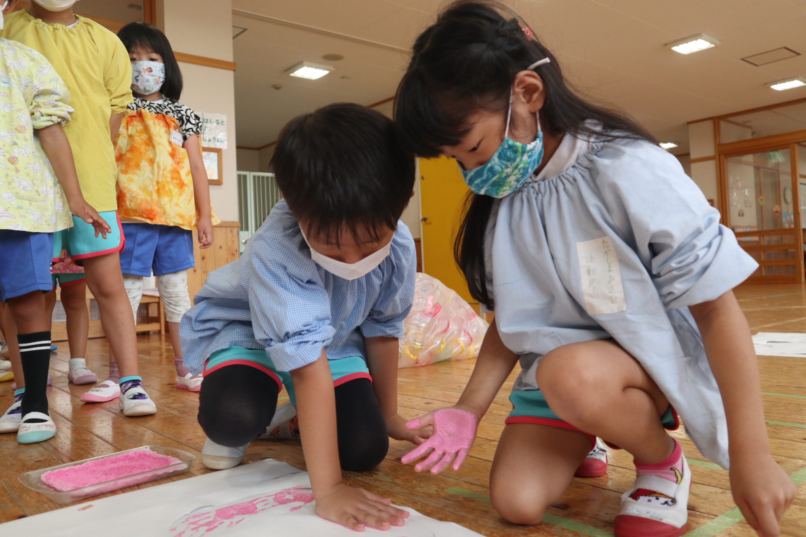 年長組と年中組の9クラスが各クラス一文字を担当してそれを合わせてスローガンを作りました。