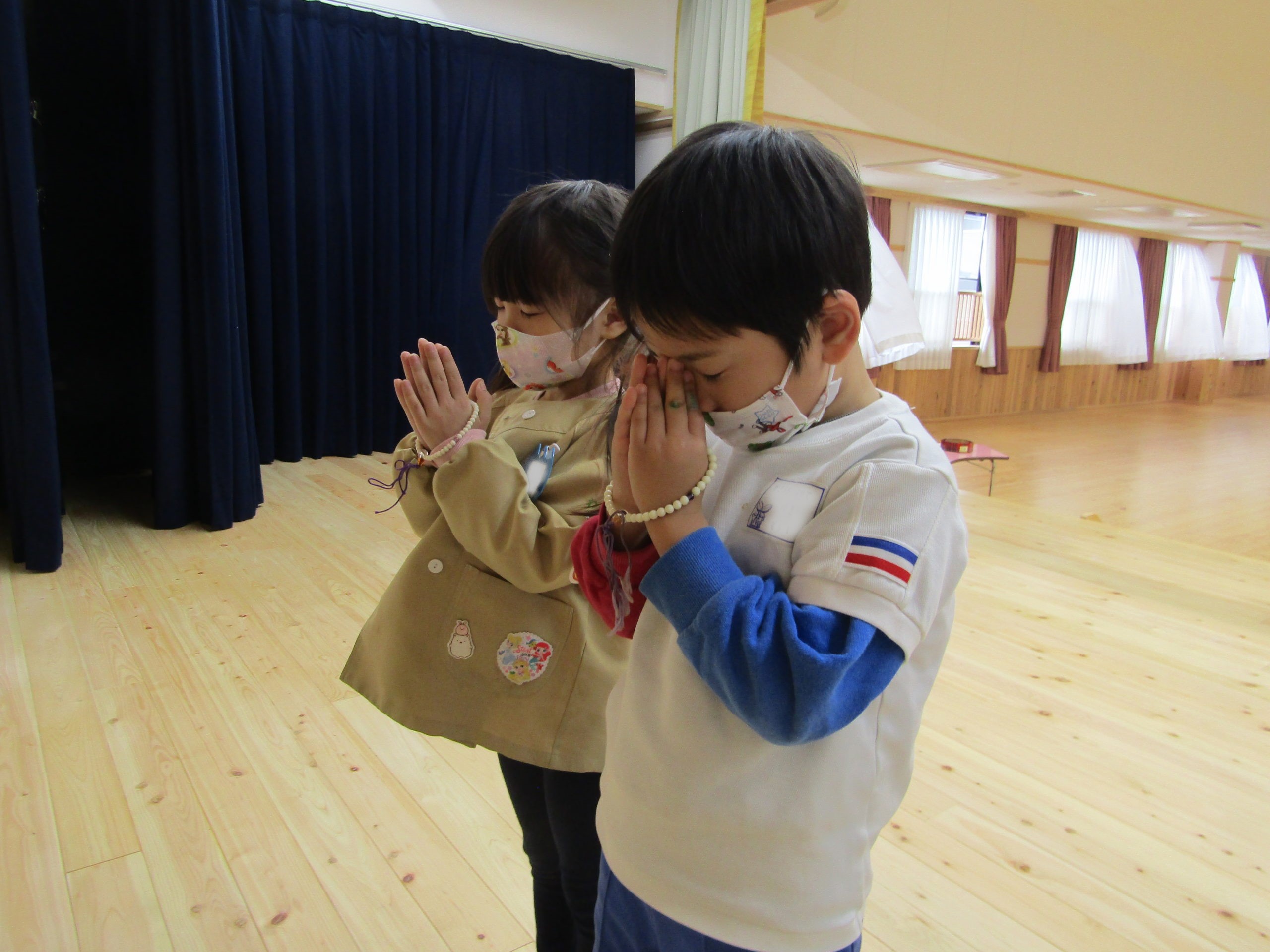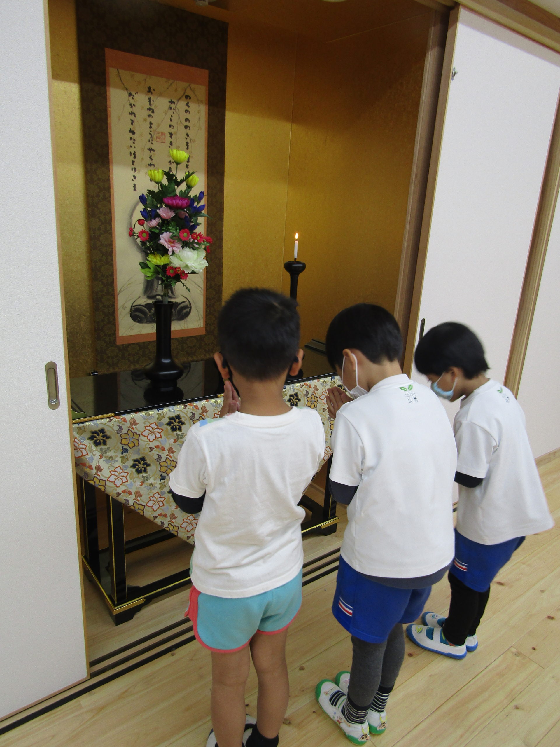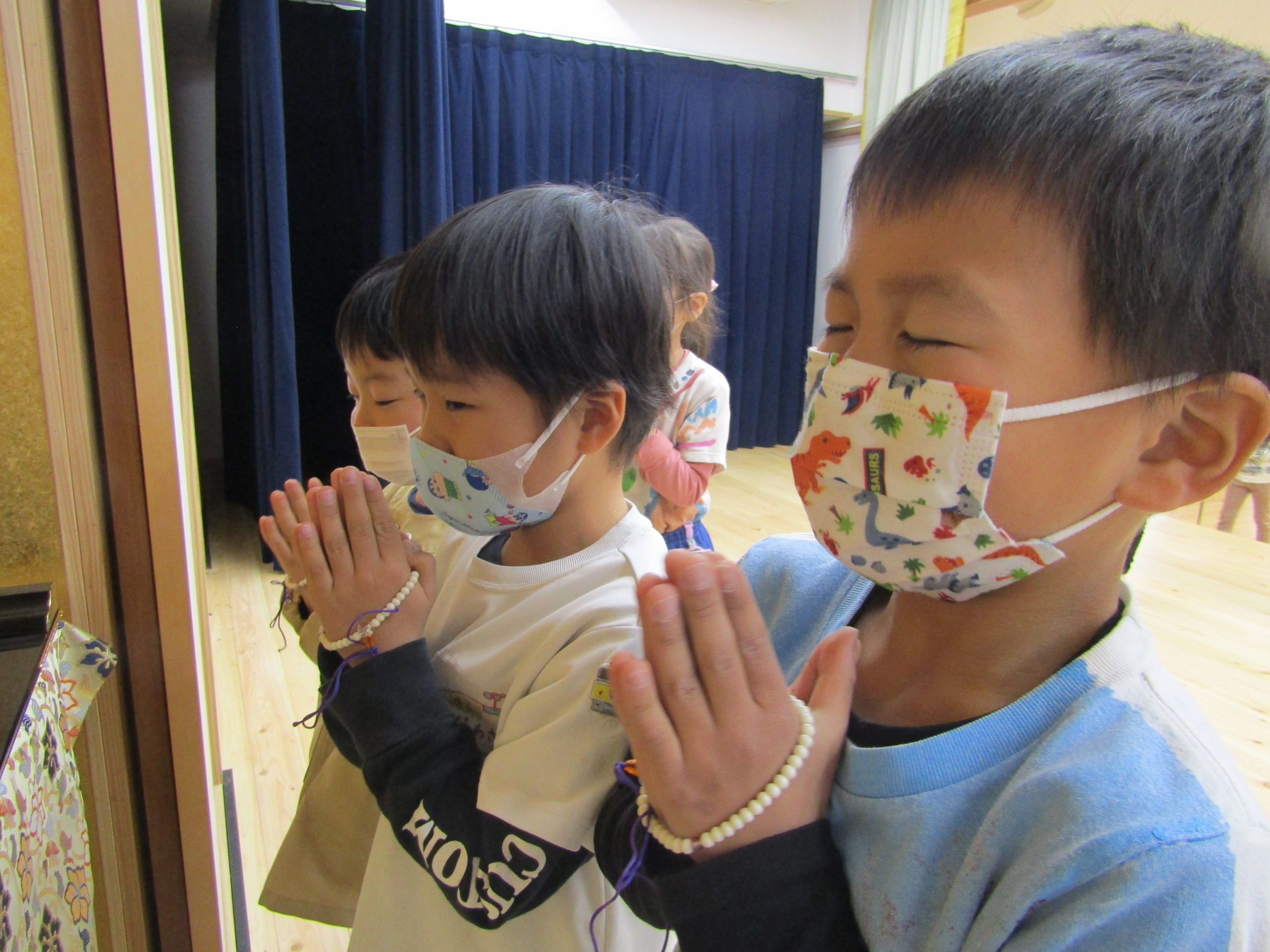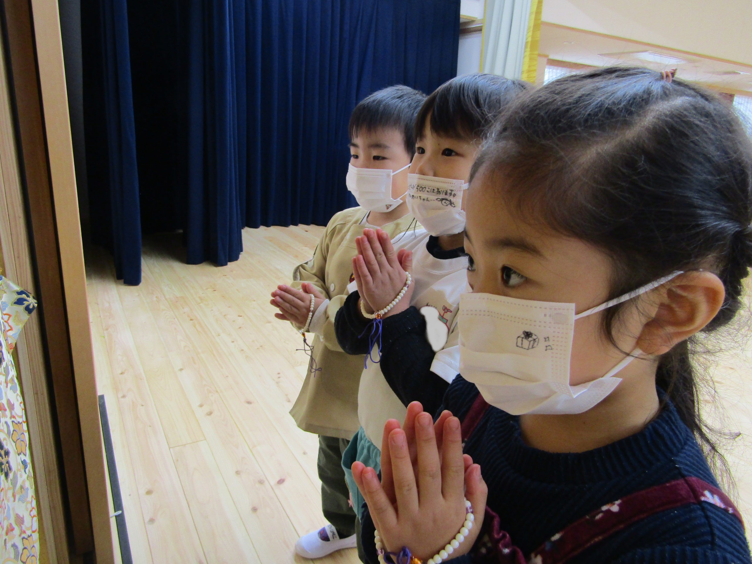 年中組や年長組の子どもたちは、朝の9時から9時30分、お昼の12時半から1時までの2回をおまいりの時間としました。