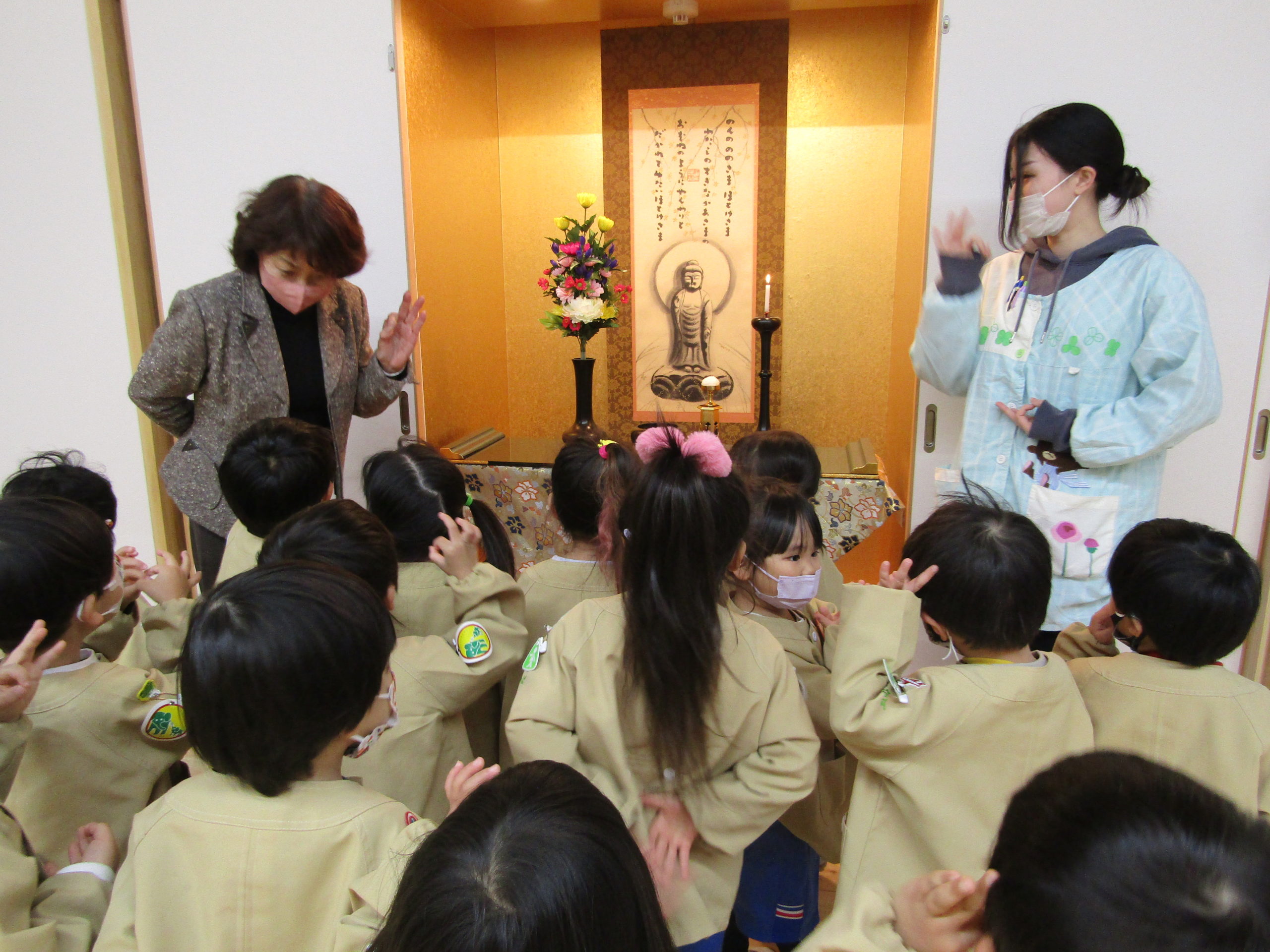 「あそこになんてかいてあるの?」「ののさま、おめめつぶっているの?」「ゆび、まあるくしているね」とたんぽぽ組の年少さん。