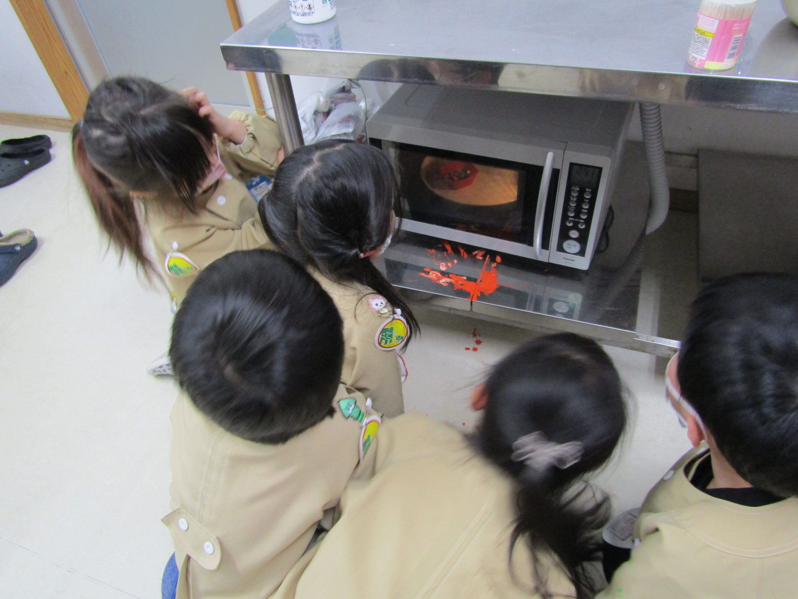 どんな風になるのかな・・・・? 目隠しをしてあとのお楽しみにしたいと電子レンジから目をそらす子。