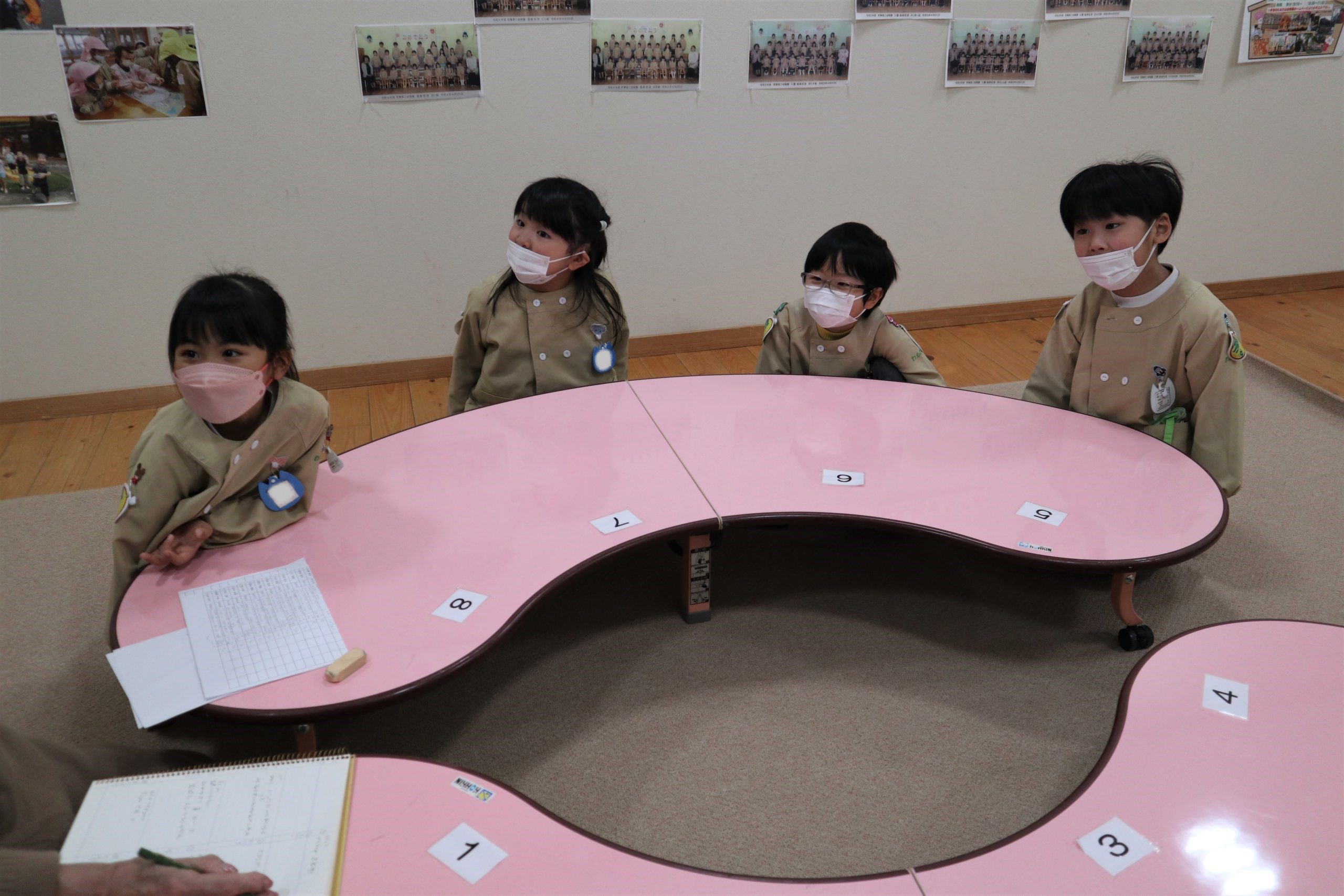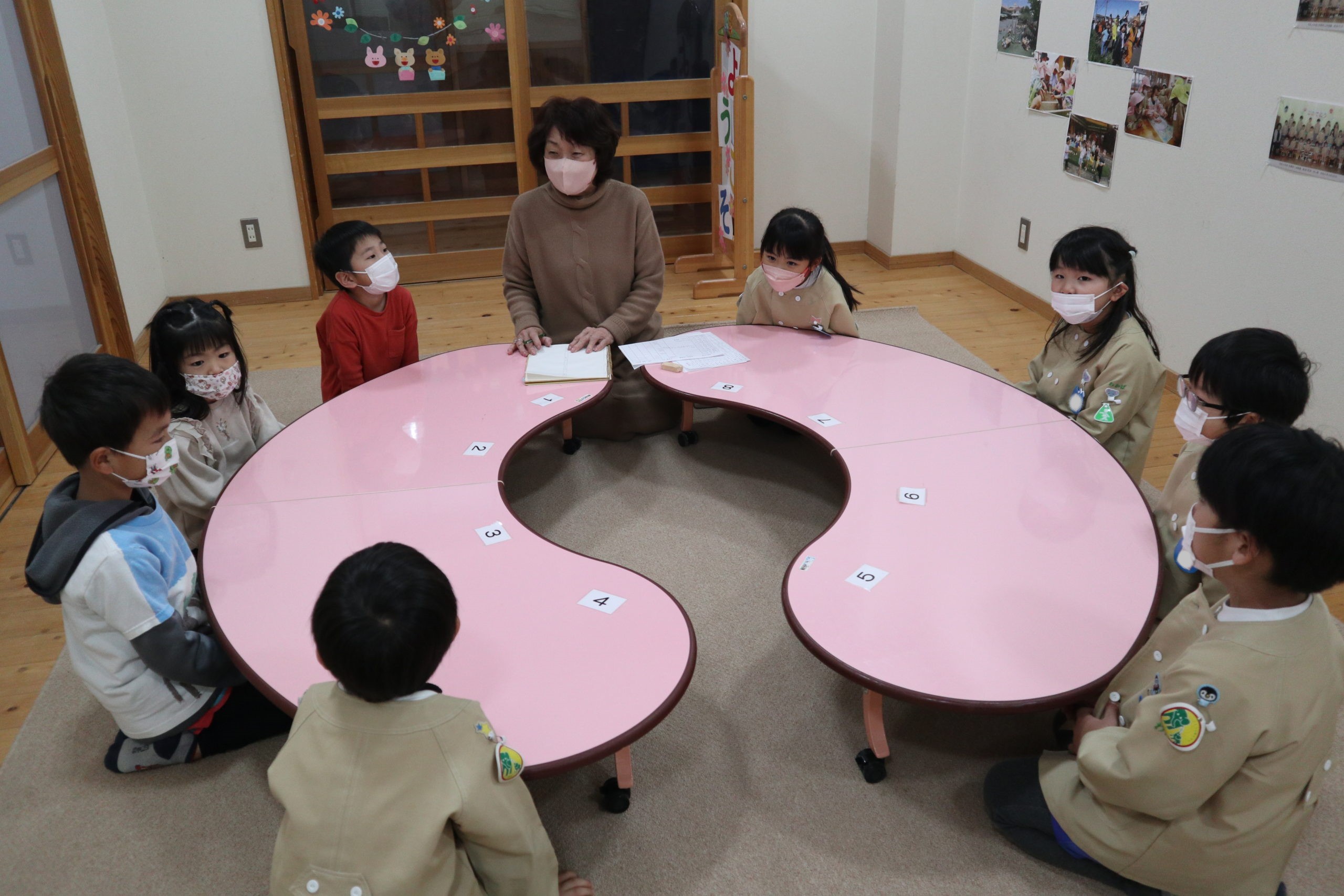さて、今日はそら組の8名のみなさんと「こどもかいぎ」をはじめました。