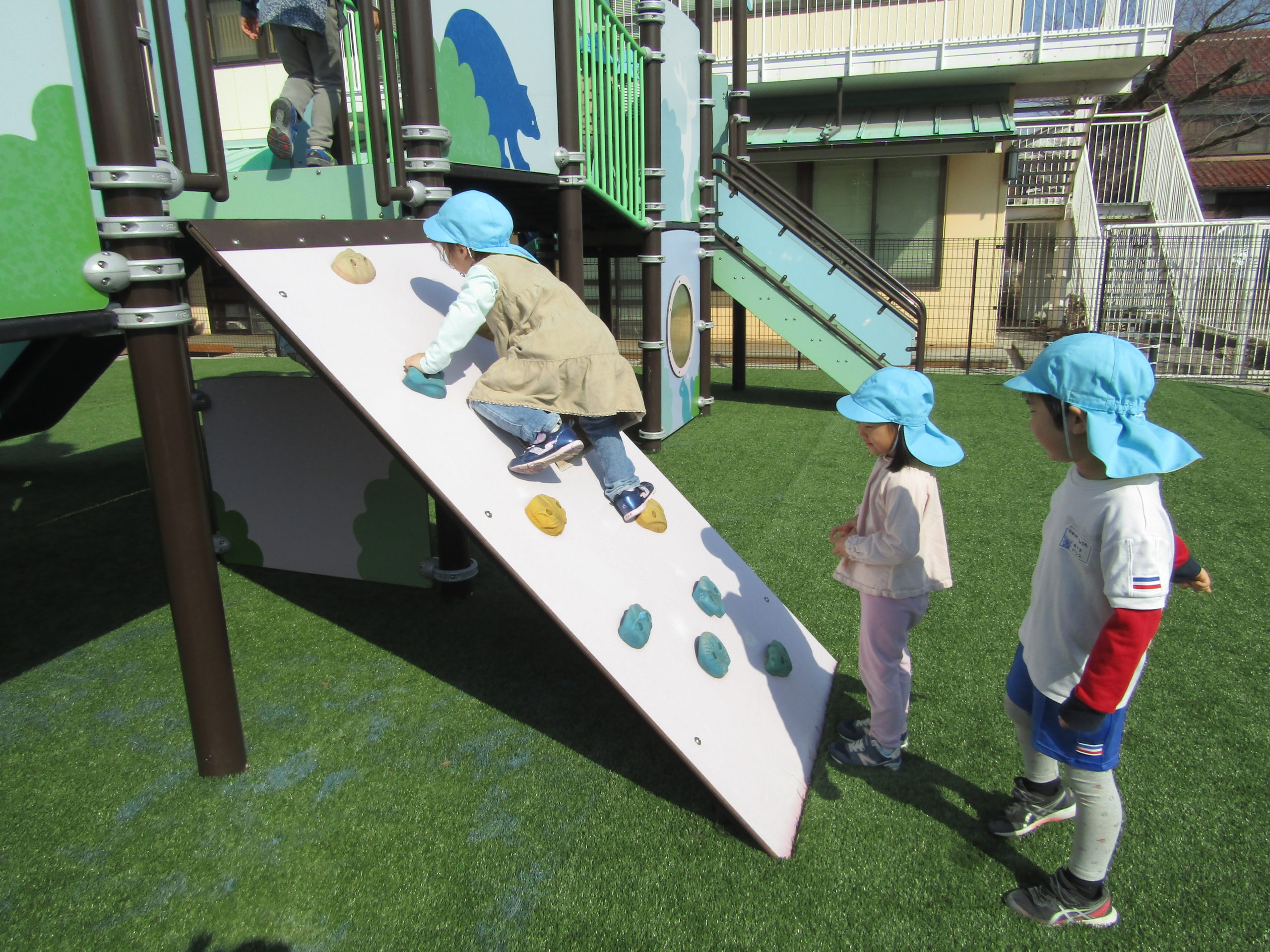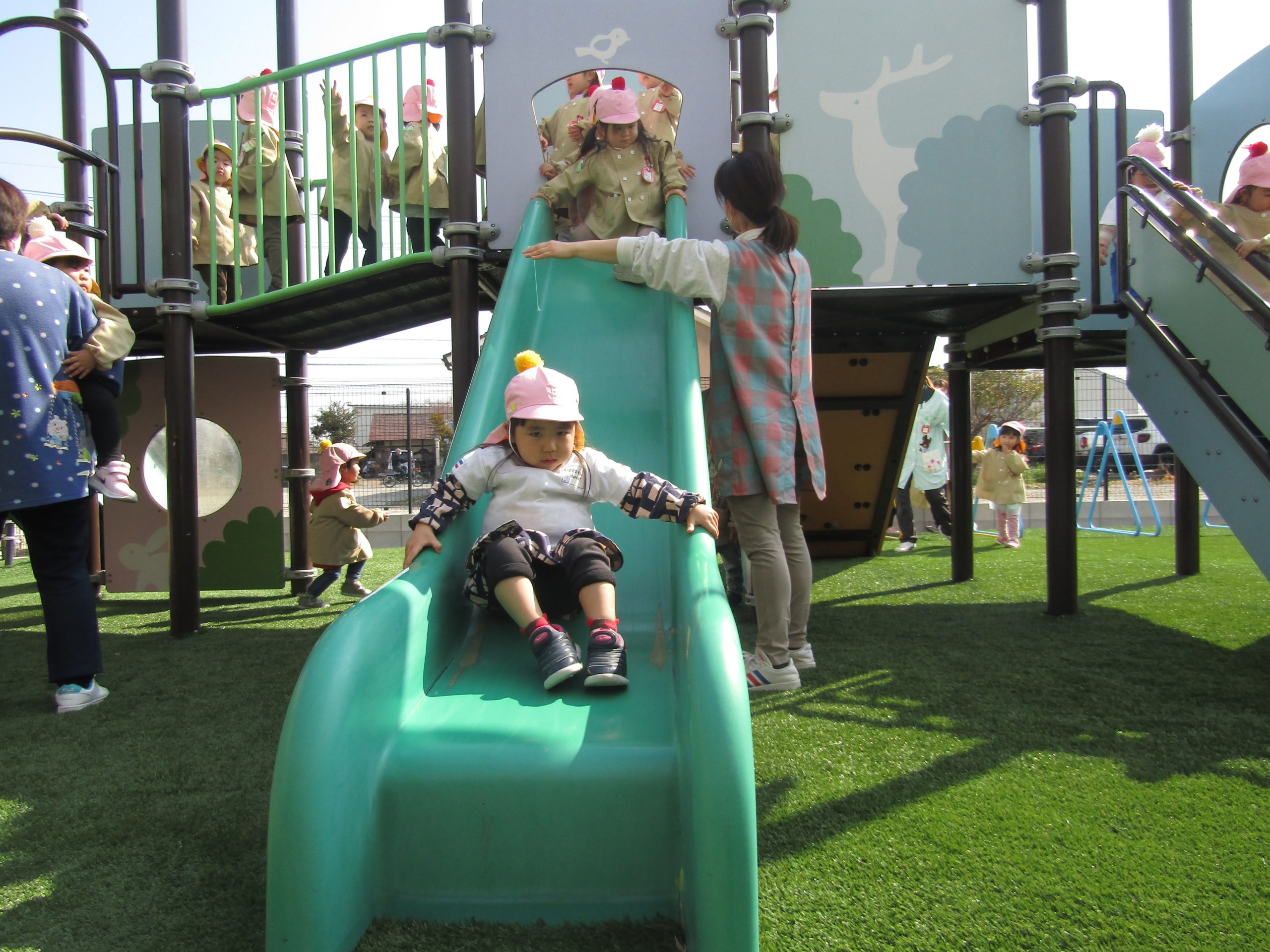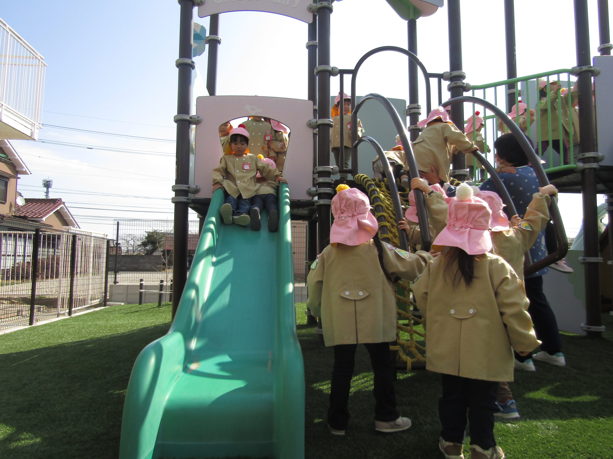 すべり台が2つある遊具は大人気、順番を守って上ったり滑ったりしてたくさん遊びました。