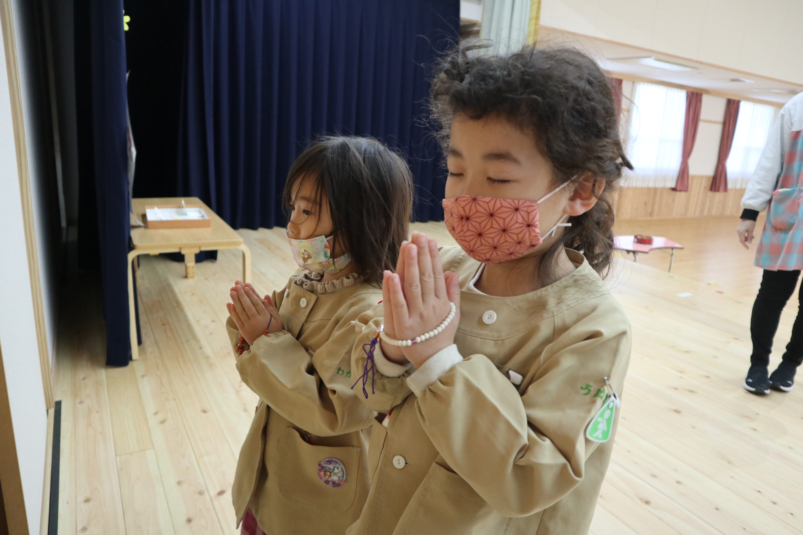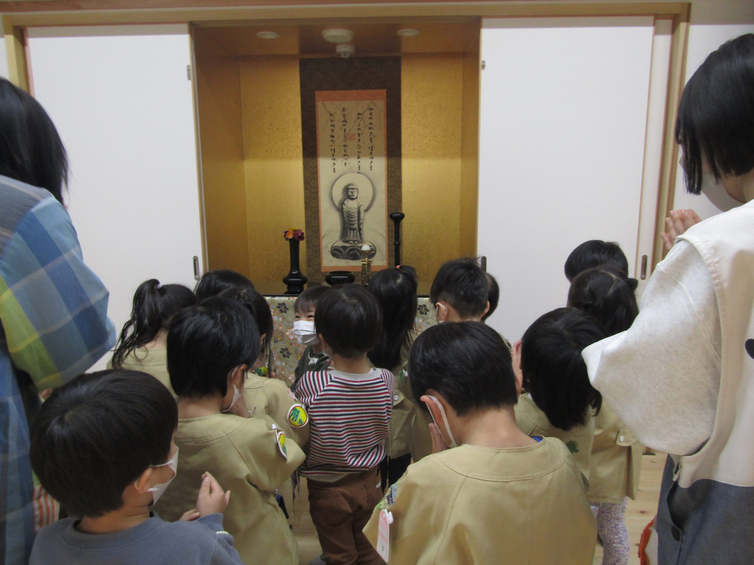 お念珠を手にかけて、おまいりする姿に子どもたちの心が伝わってきます。「上手にお念珠をかけているね」と言うと「せんせいにおしえてもらったよ」