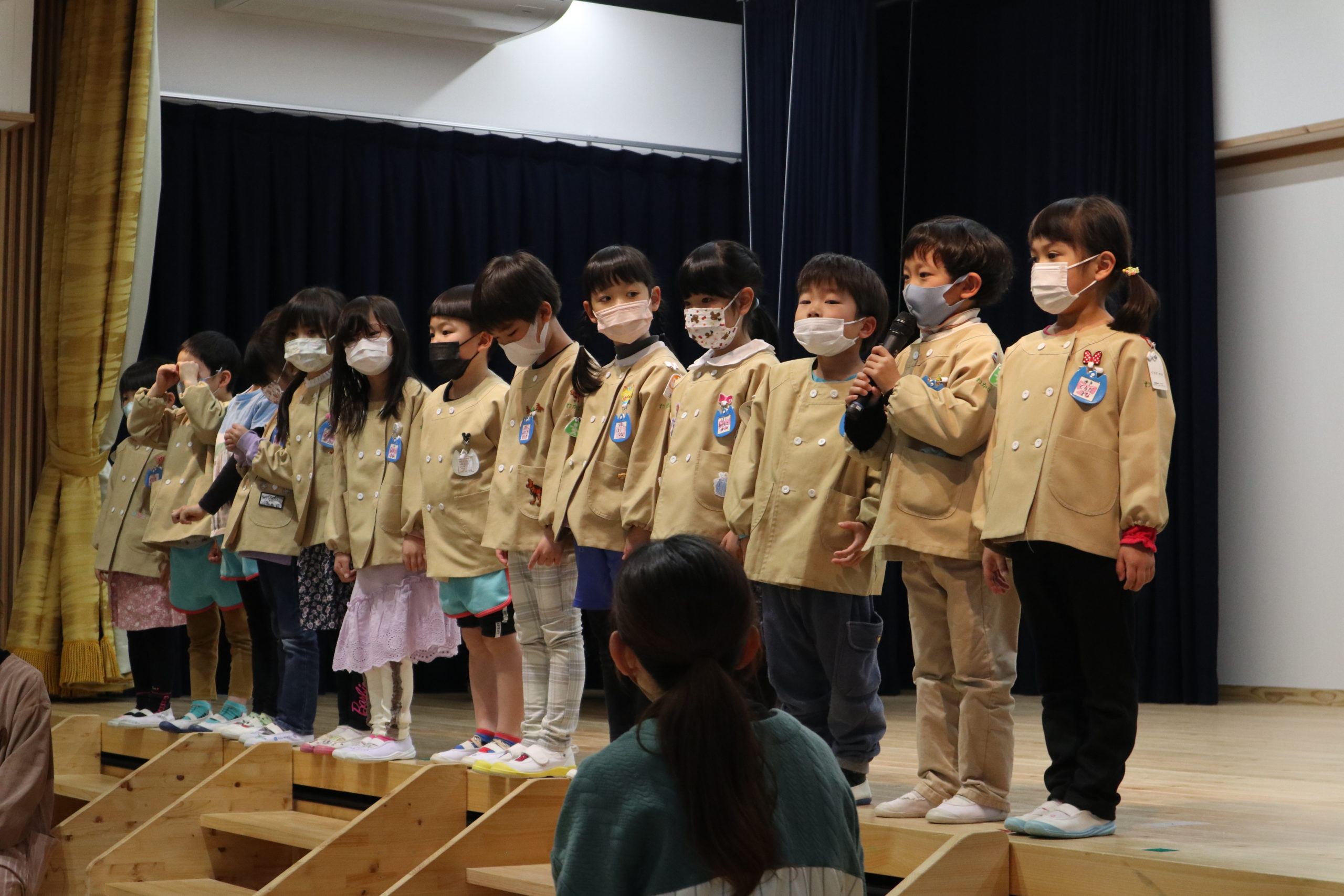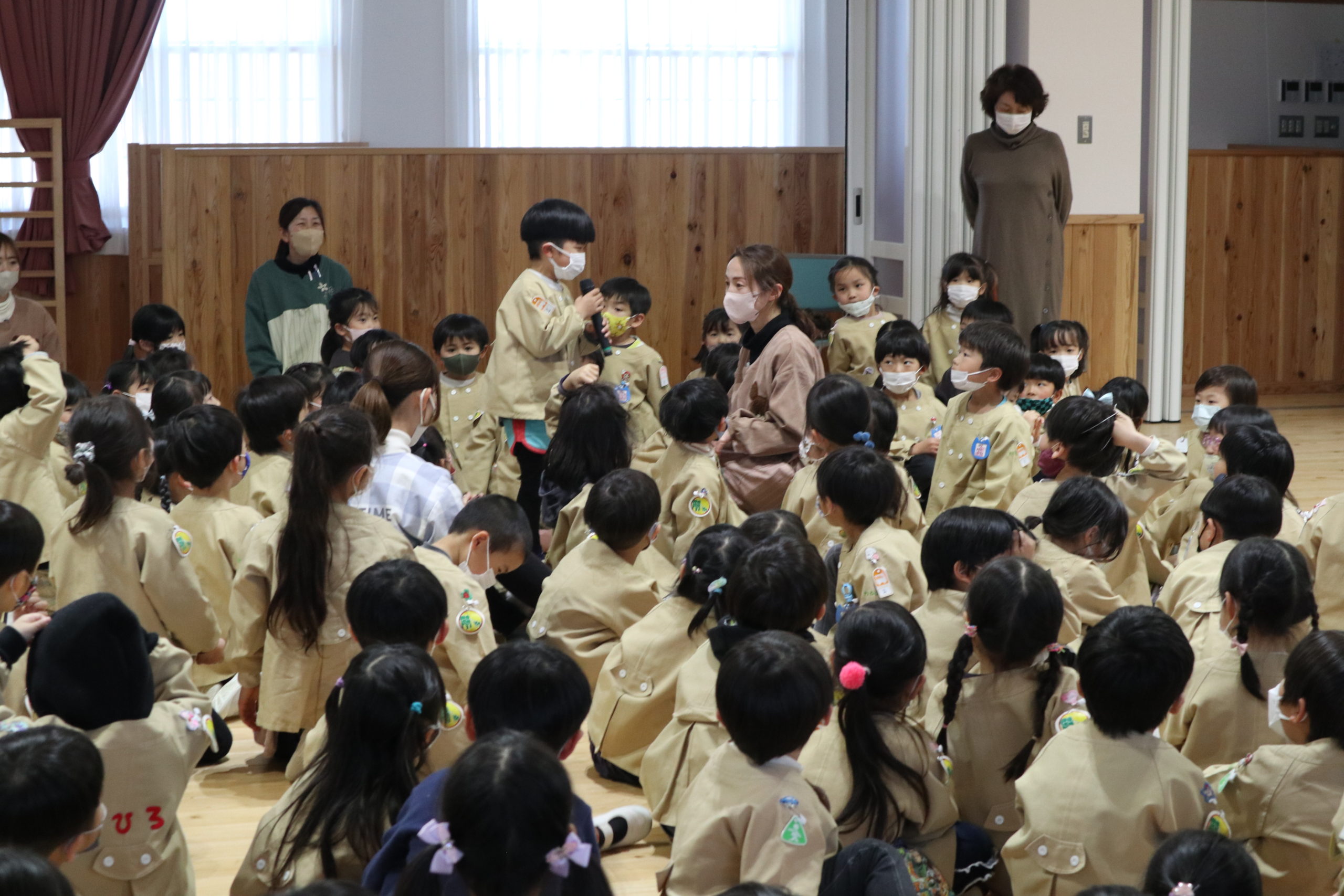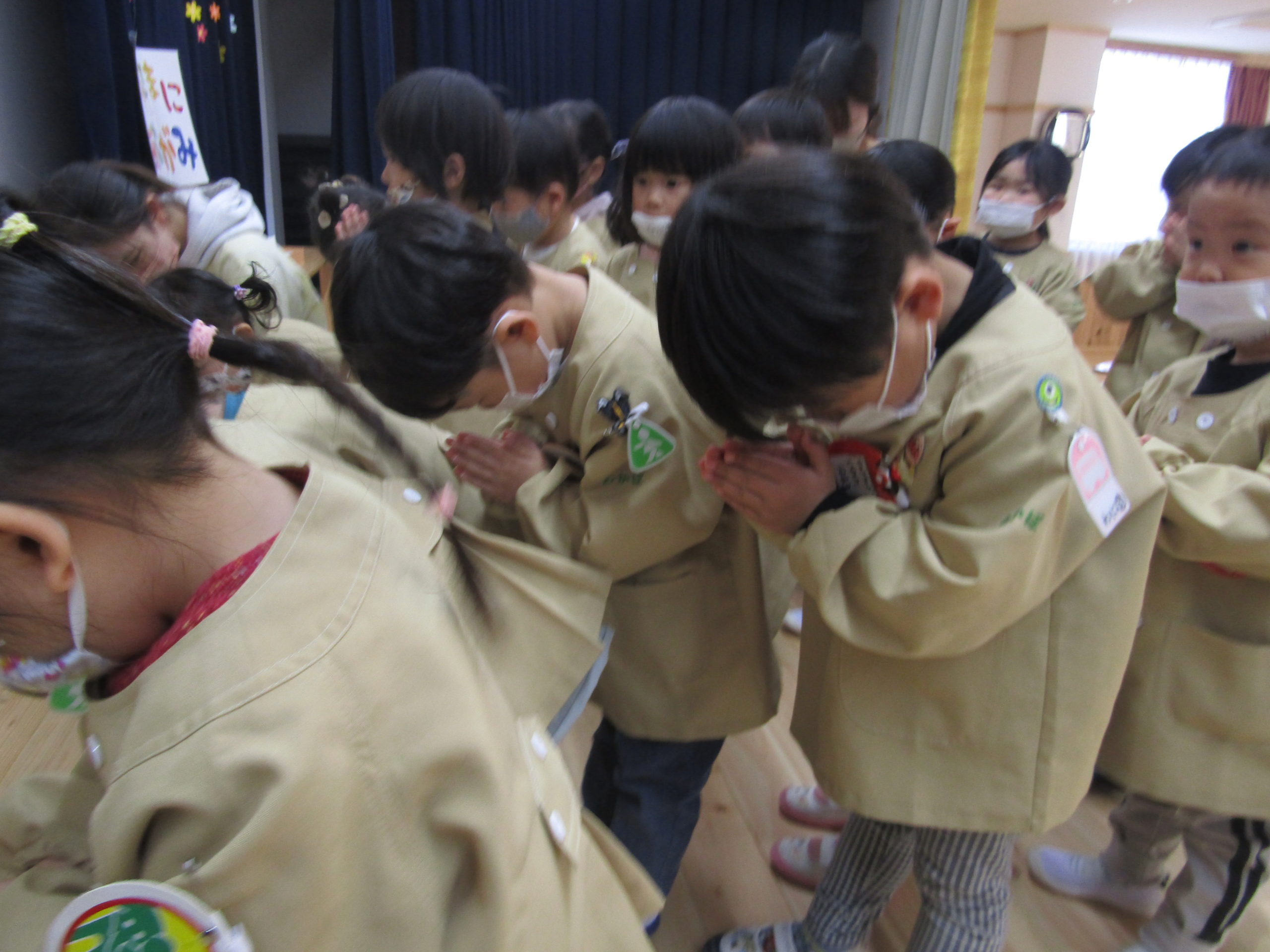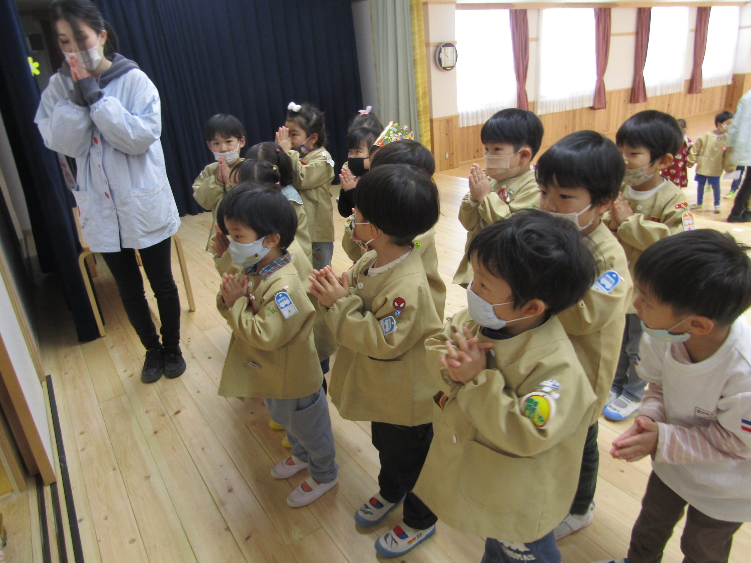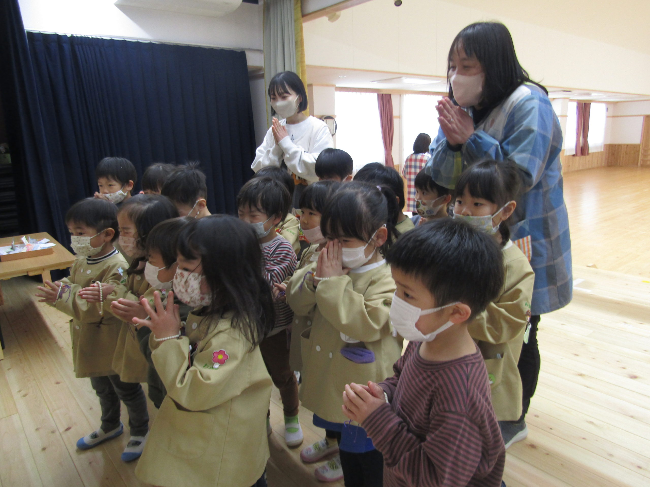 ののさまのお歌が幼稚園に流れると、子どもたちはホールに集まってくれました。