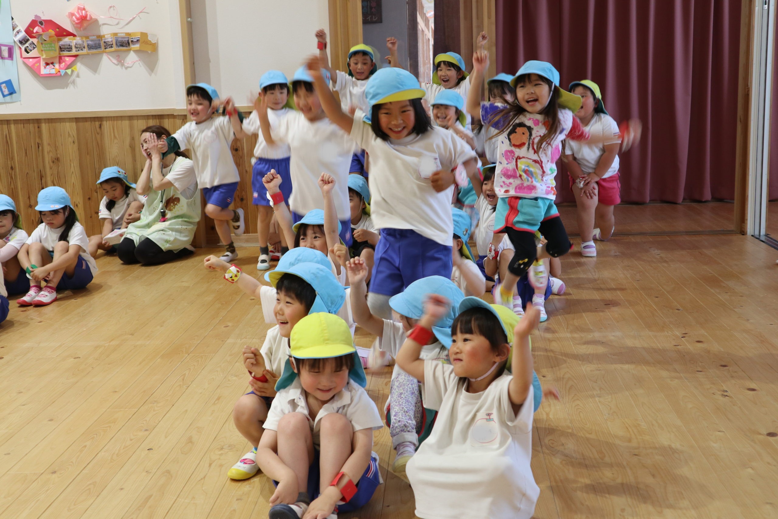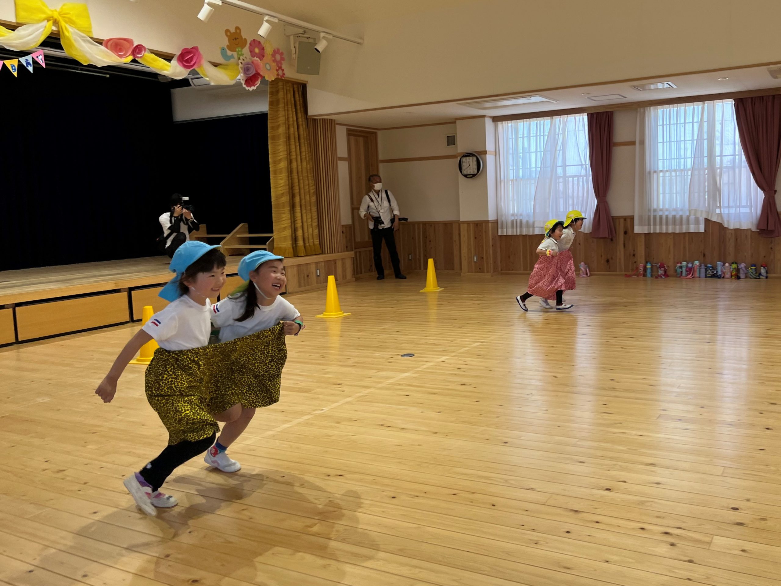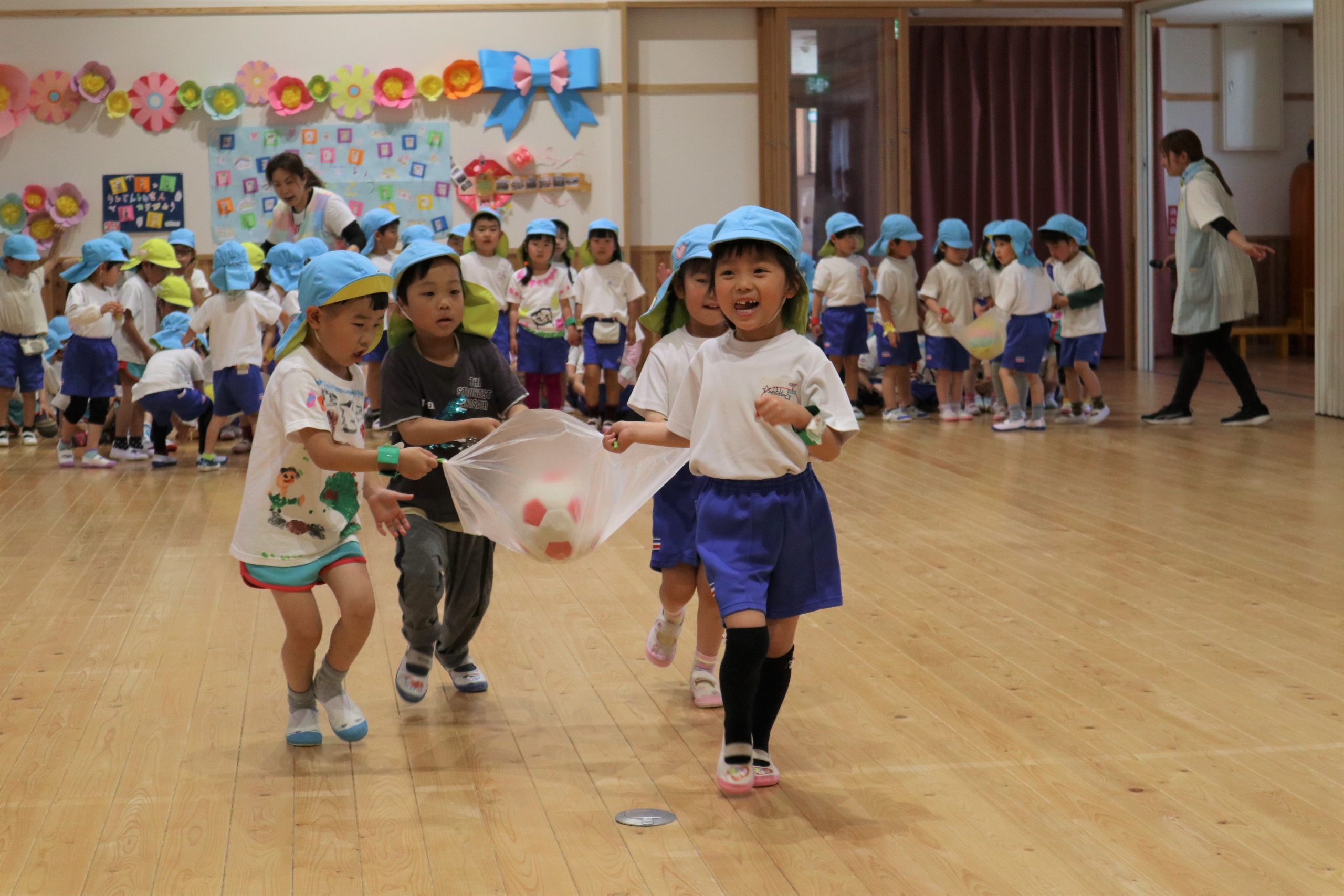 さて、年中組は、クラスの新しいおともだちと仲良くなれるように、クラスのおともだちと力を合わせてできる種目で遊びました。勝った時は跳ねて喜び、負けた時には「もう一かい」・・・・。