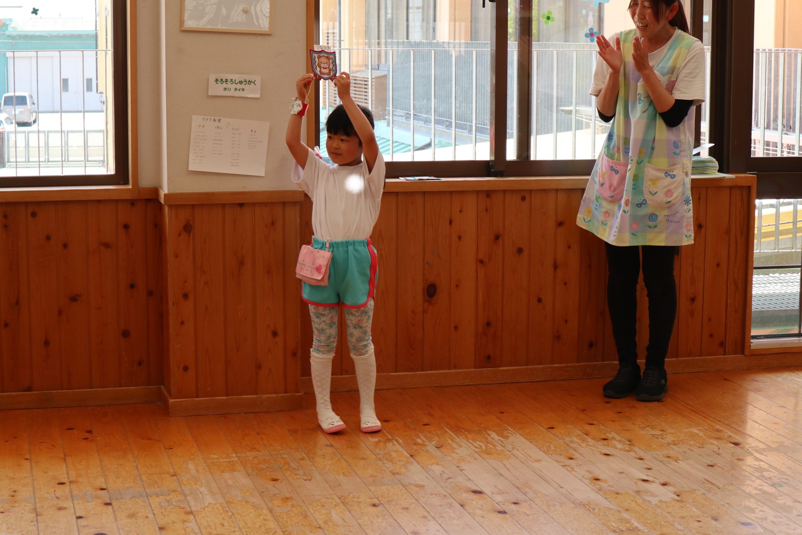つき組は1つのワッペンが贈呈されました。子どもたちの反応は面白いもので、ひとつもとれなかったにじ組は4位、4位、3位のあまりいいとは言えない成績の中で「3位がとれて、よかった!」とよろこび・・・。