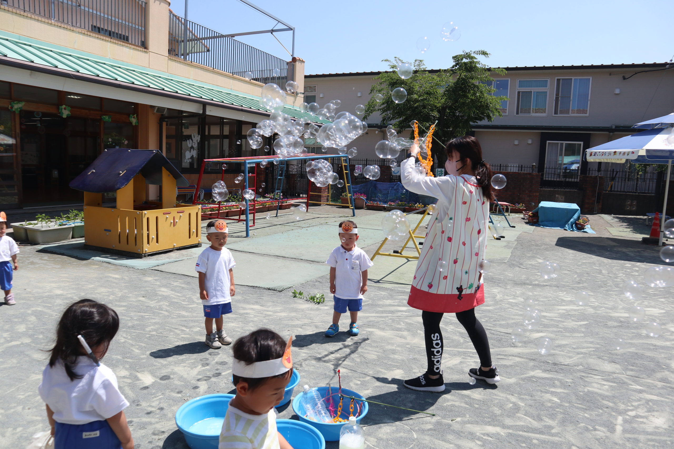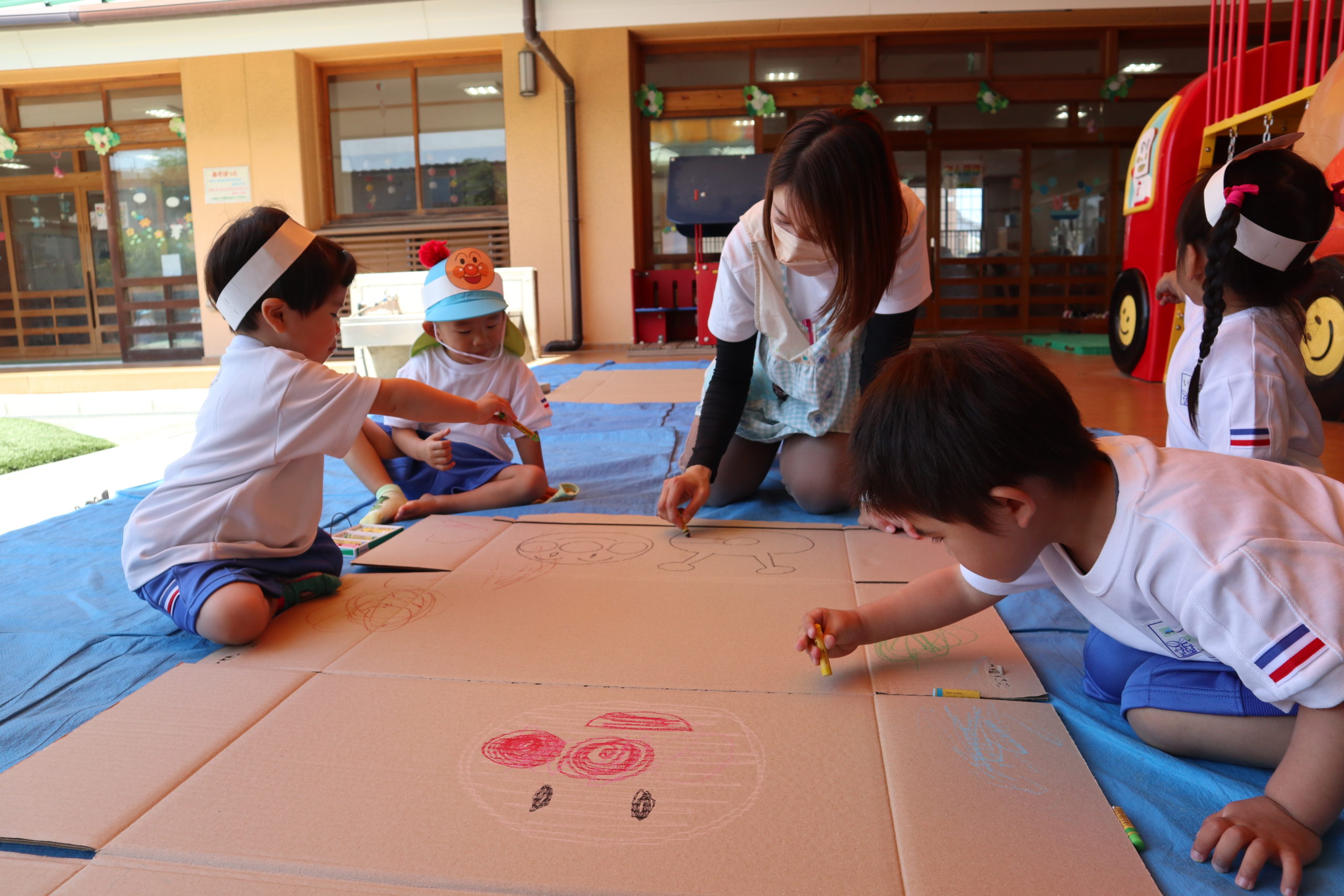 お面を被ってダンボールにお絵かきしたり、お空に向かってシャボン玉を追いかけたり、だんぼーるはうすであそんだり・・・。たのしかったね!