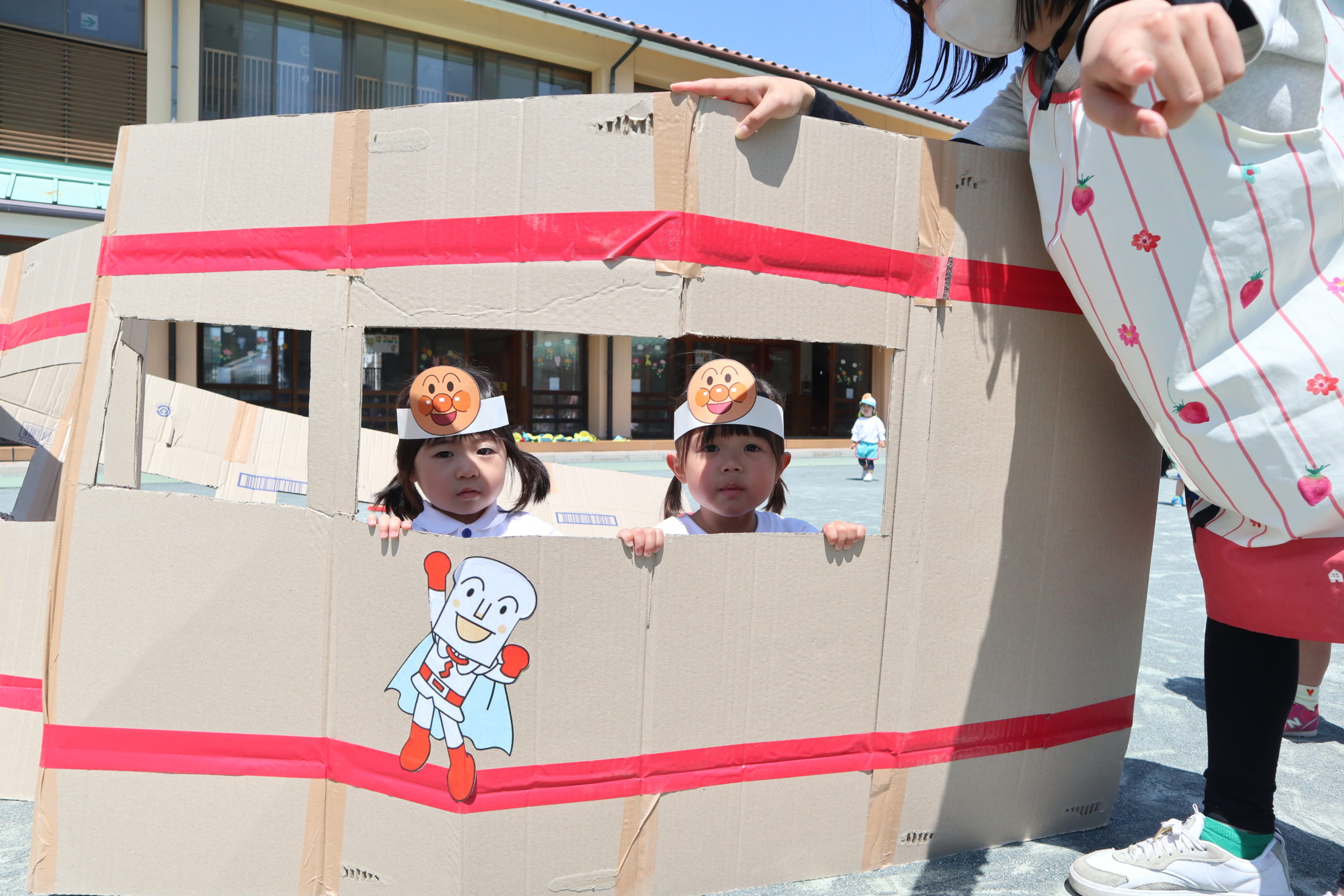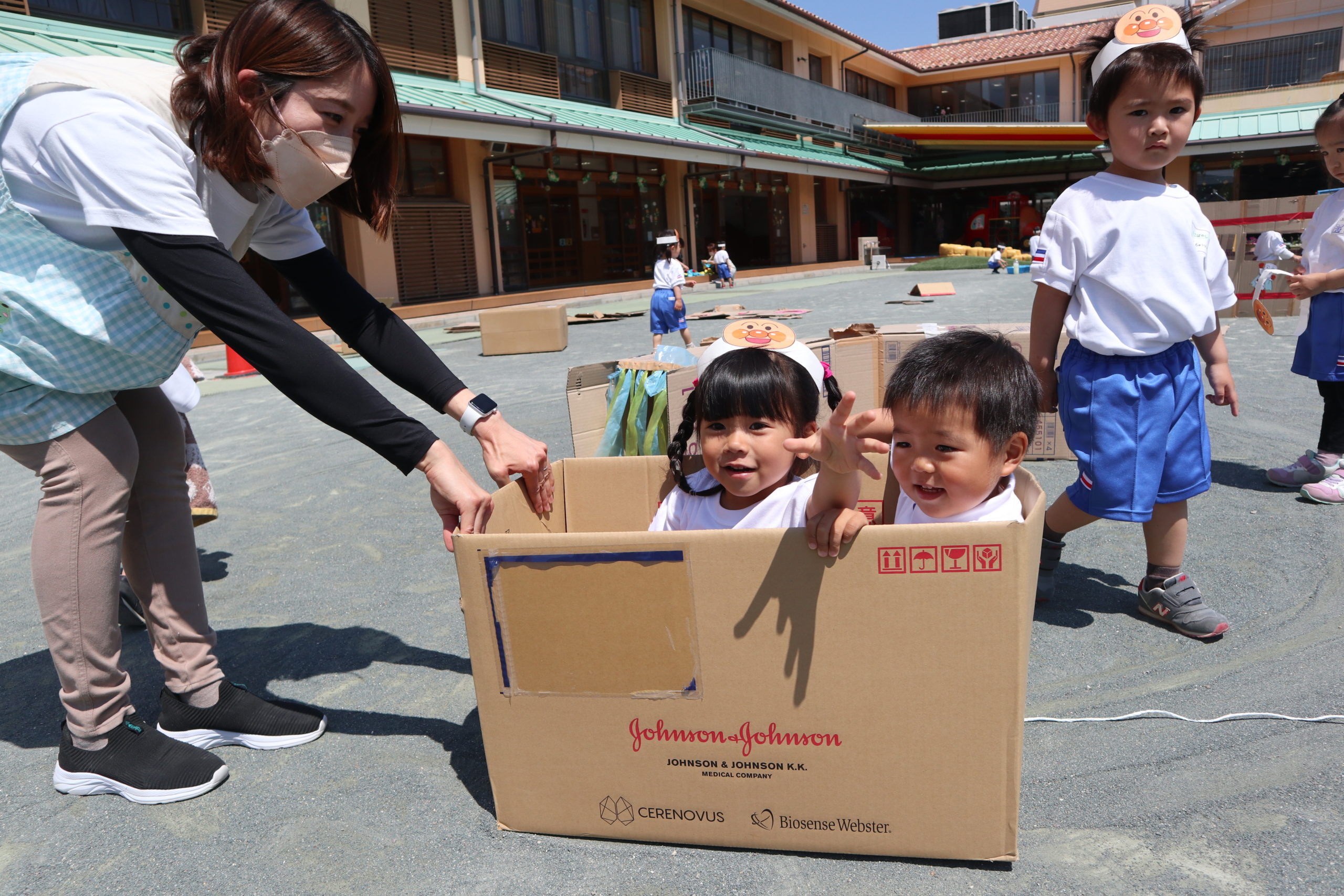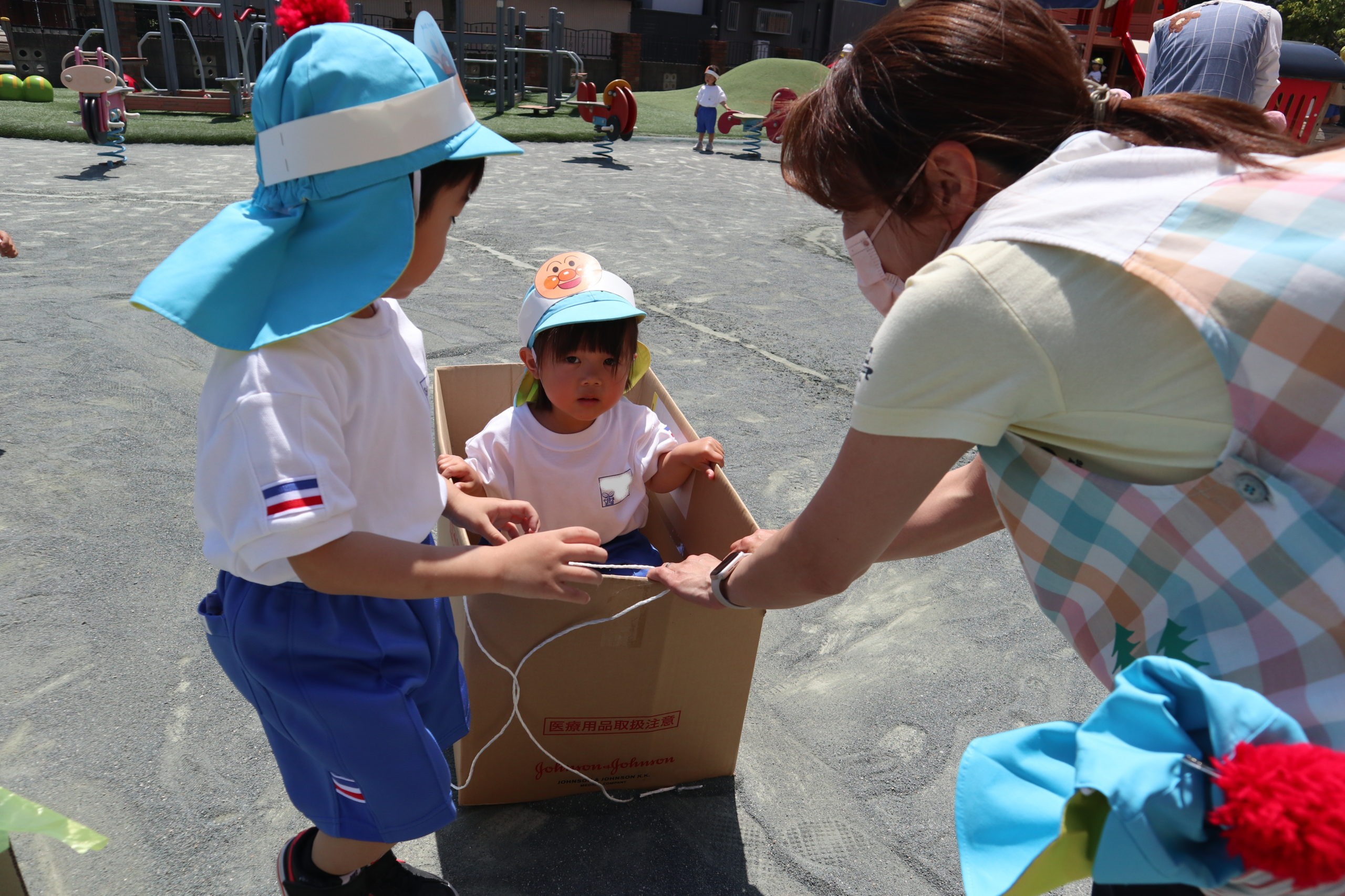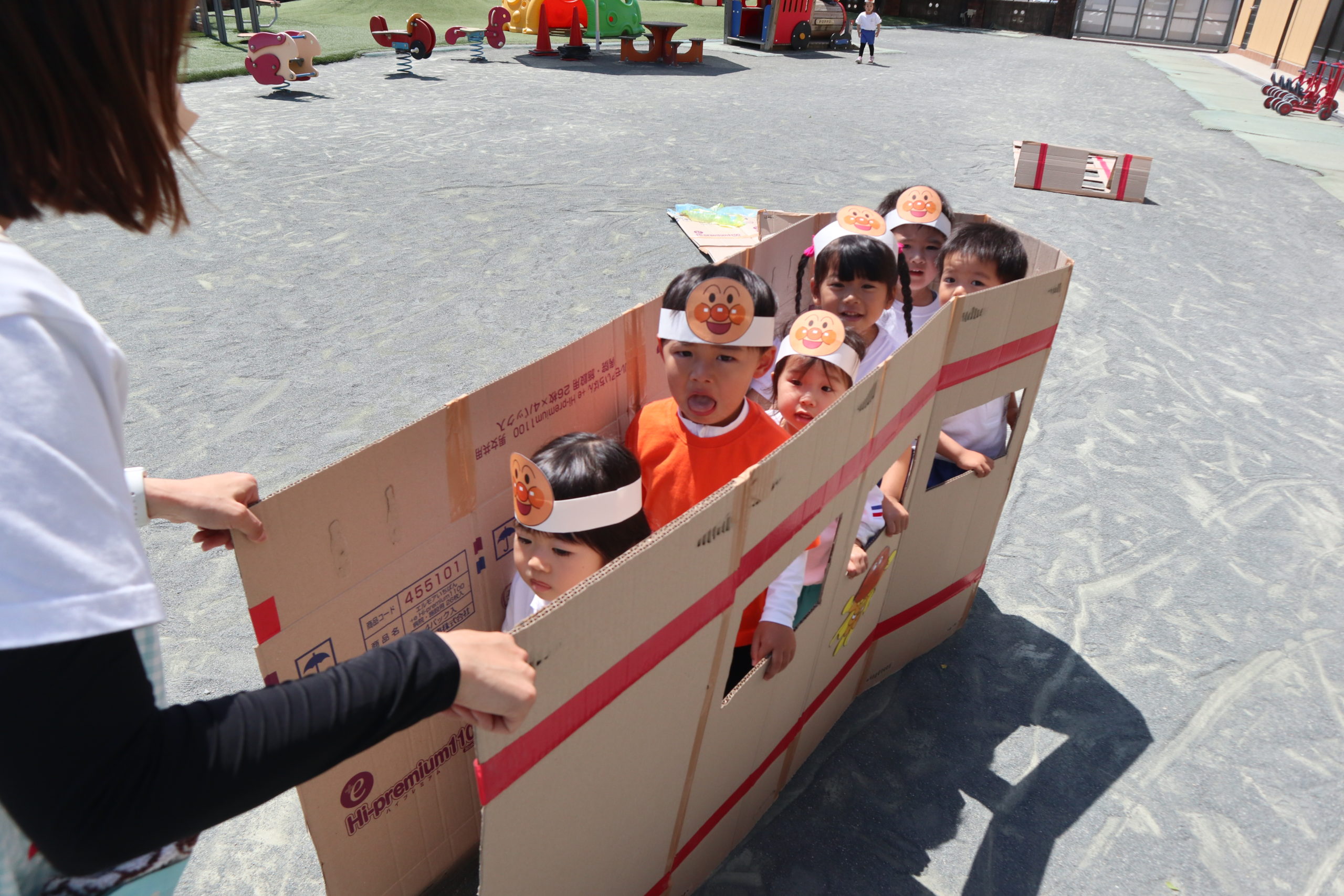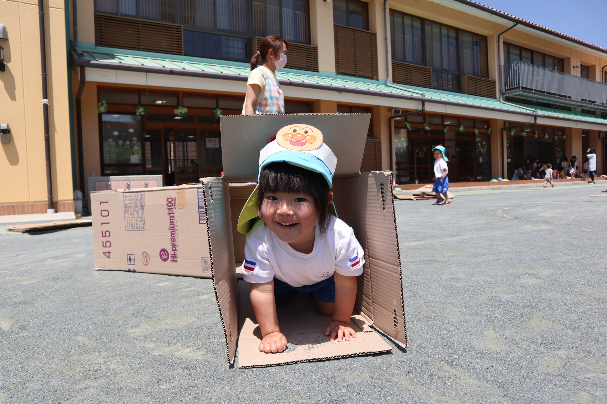 年少さんは、園庭でダンボールをたくさん使って色々なあそびを用意しました。