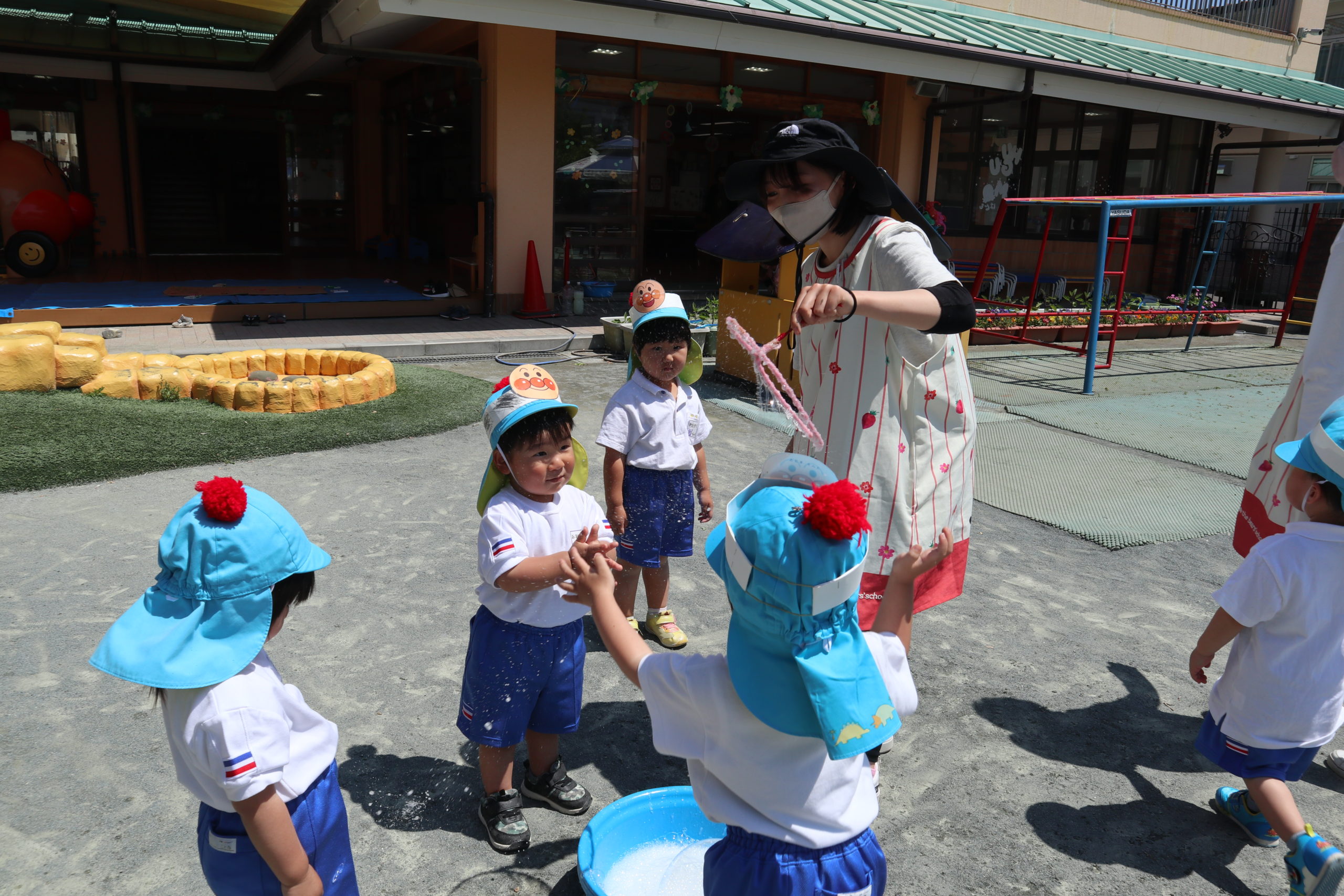 先生4人対4位のにじ組の子どもたちとの対戦で行われました。結果は、子どもチームの圧勝となりました。ぐ~んぐ~んと綱が引っ張られていく姿に、年長さんの逞しさをみました。