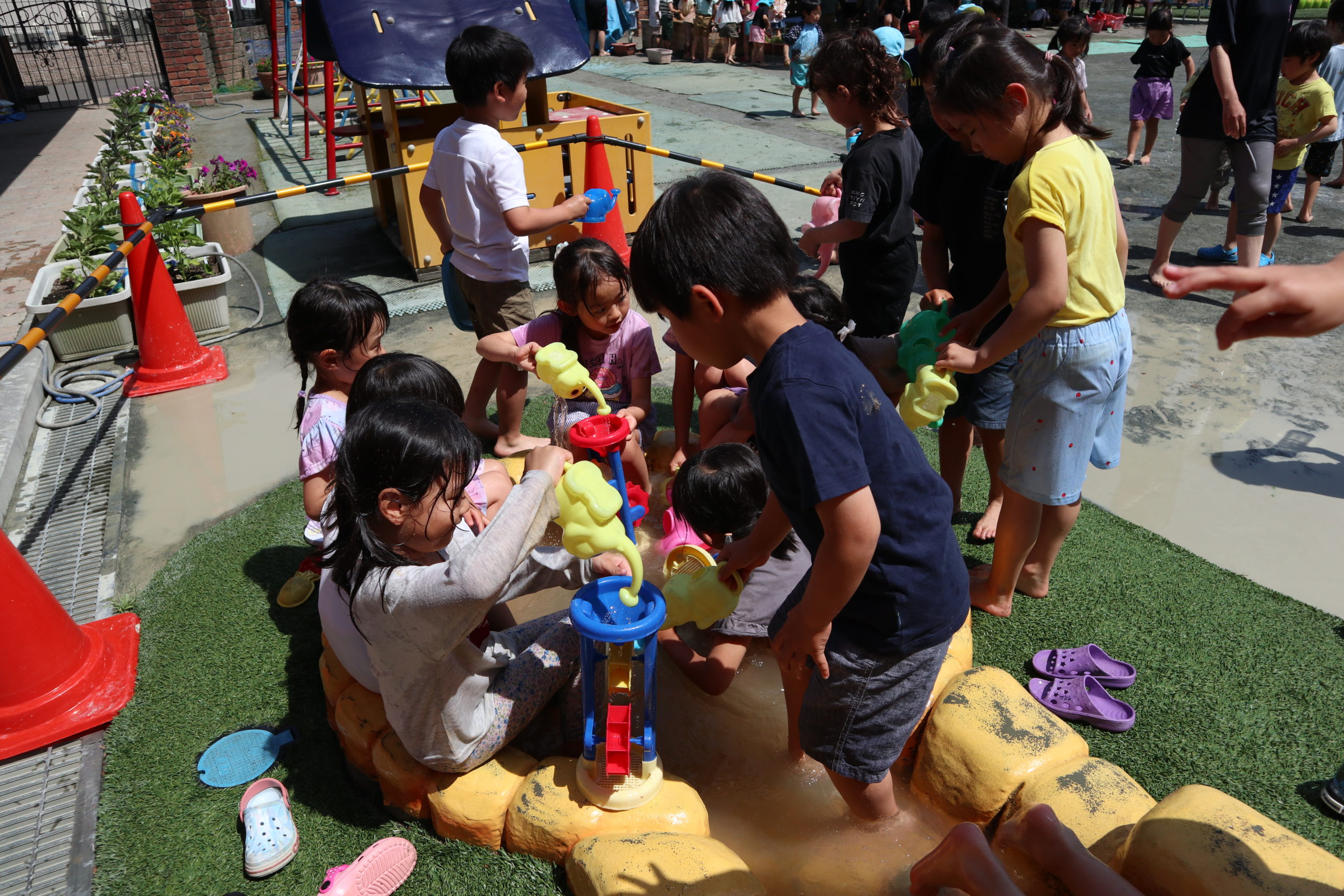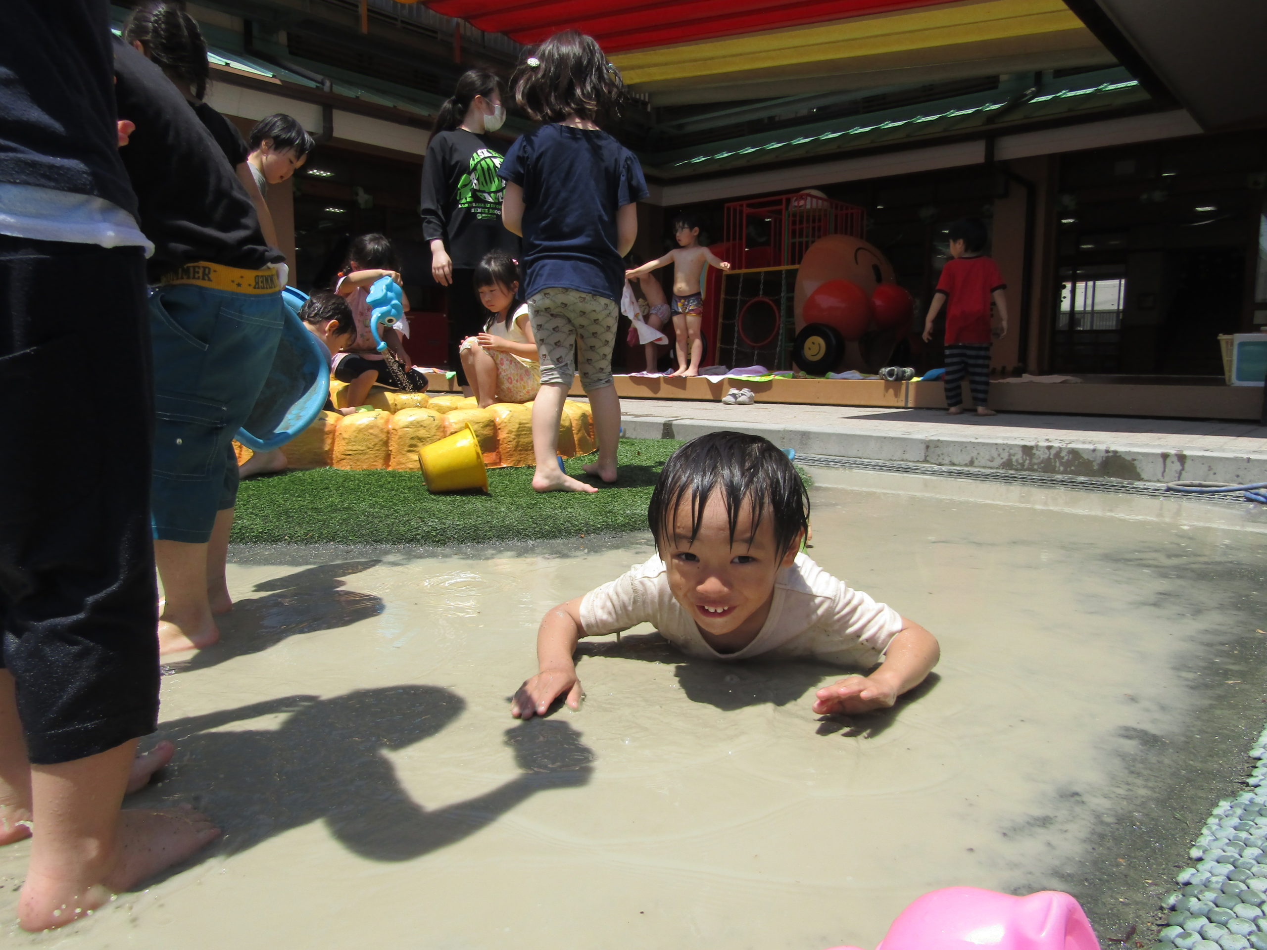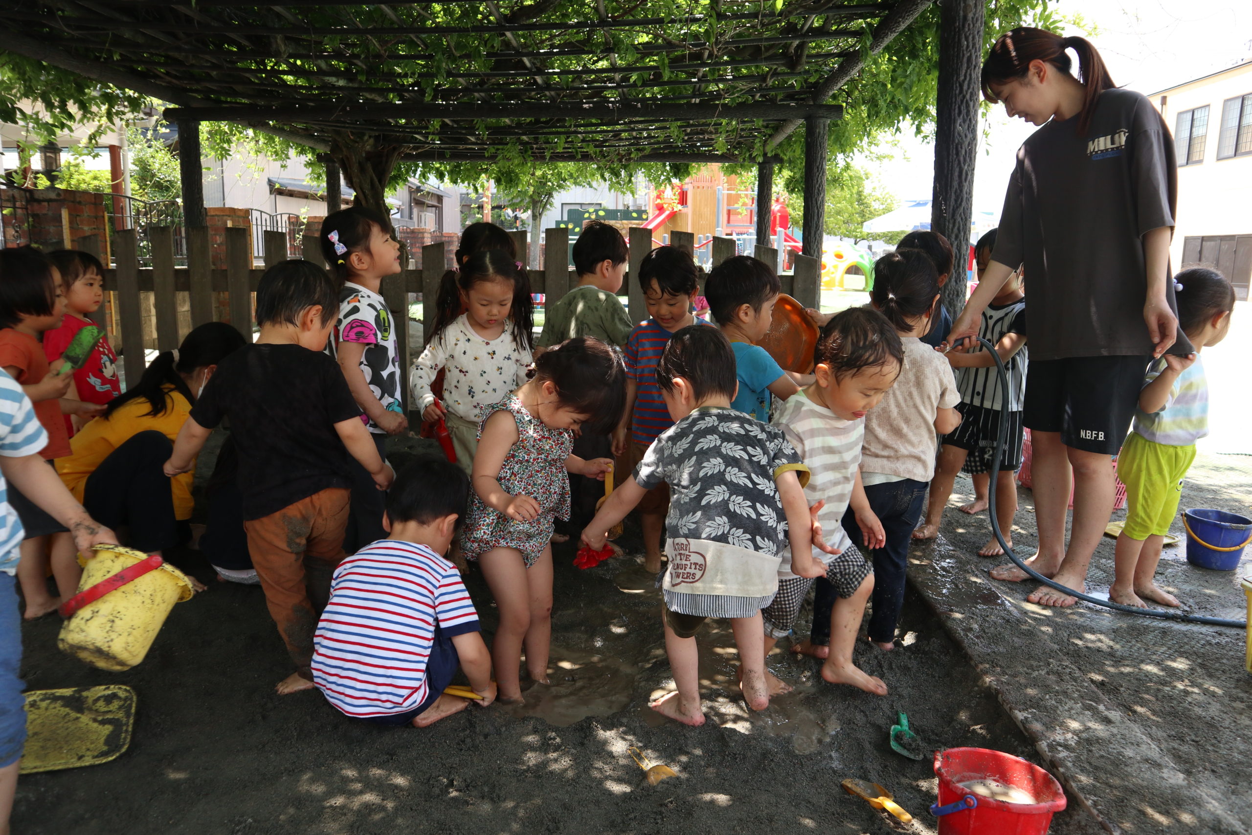 まだまだ5月ですが、どろんこあそびや水あそびがうれしい日となり、園庭に歓声が響き渡りました。