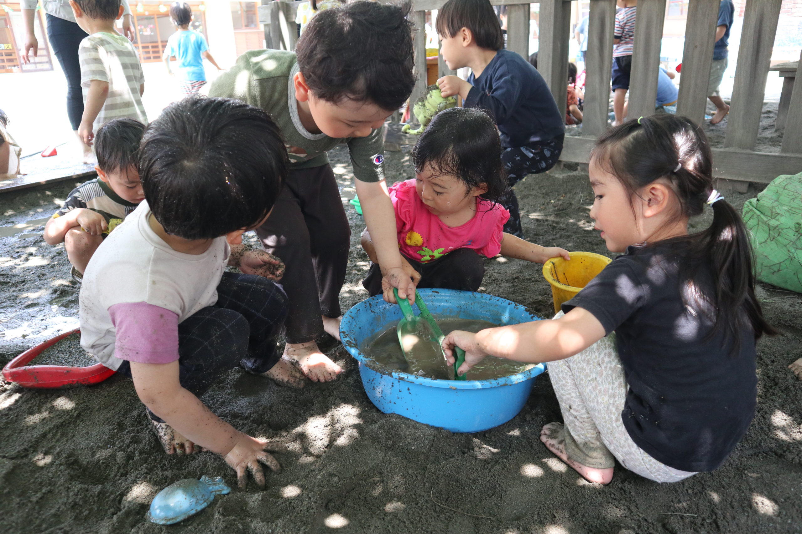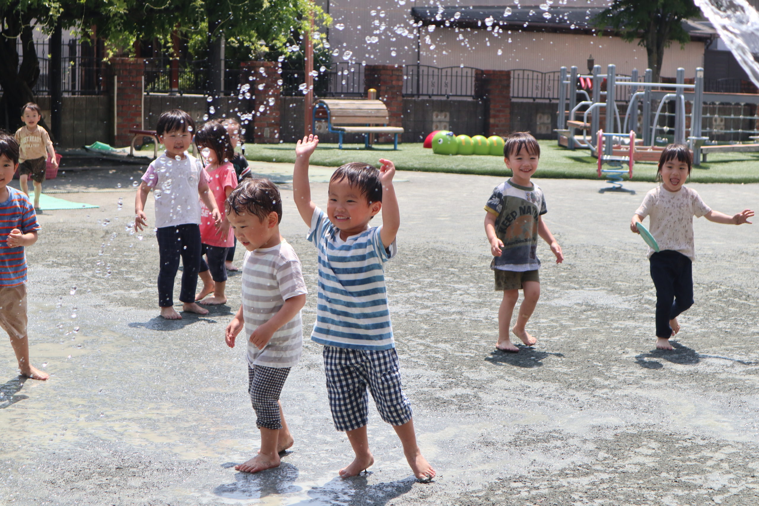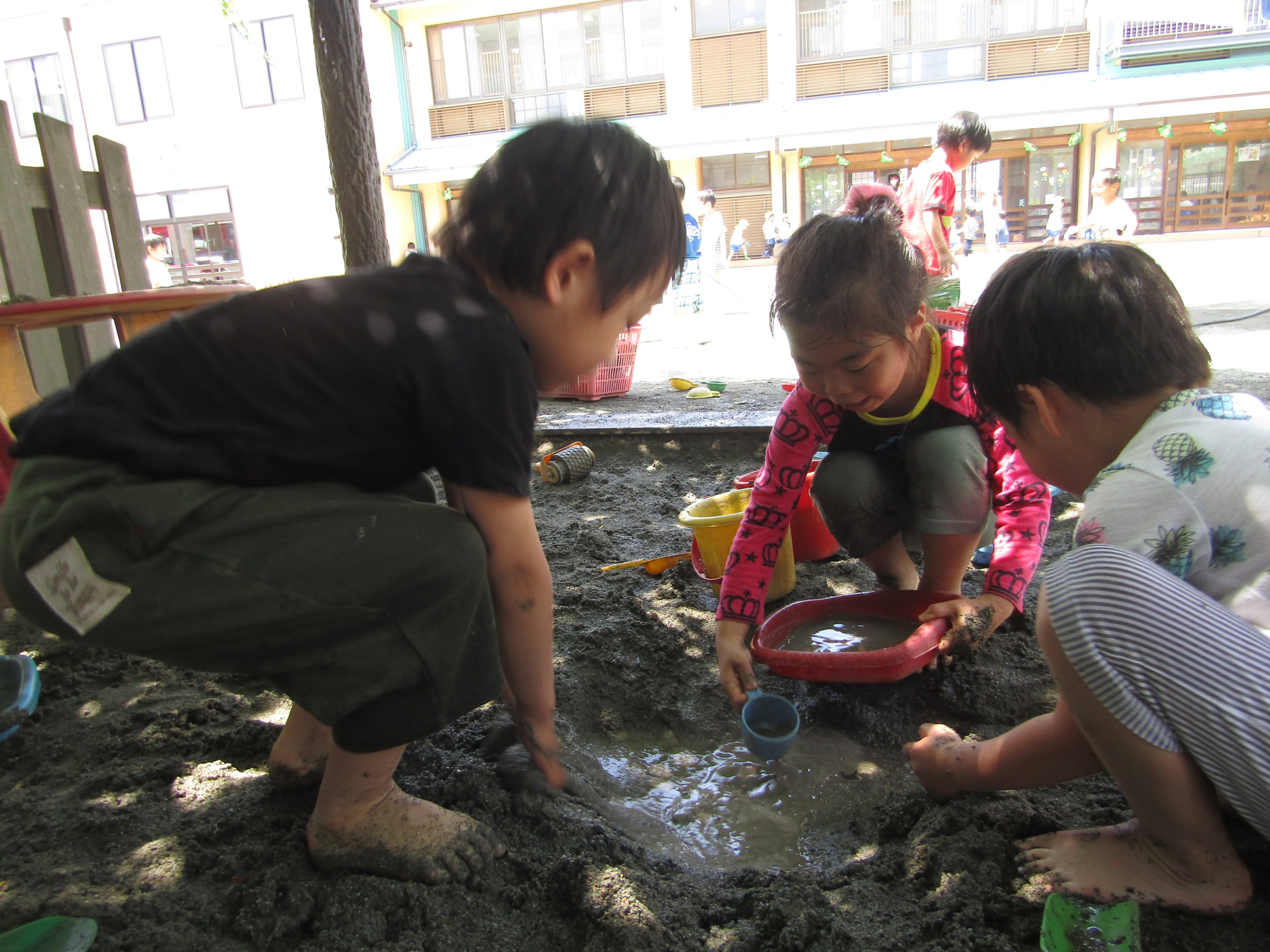 まだまだ5月ですが、どろんこあそびや水あそびがうれしい日となり、園庭に歓声が響き渡りました。
