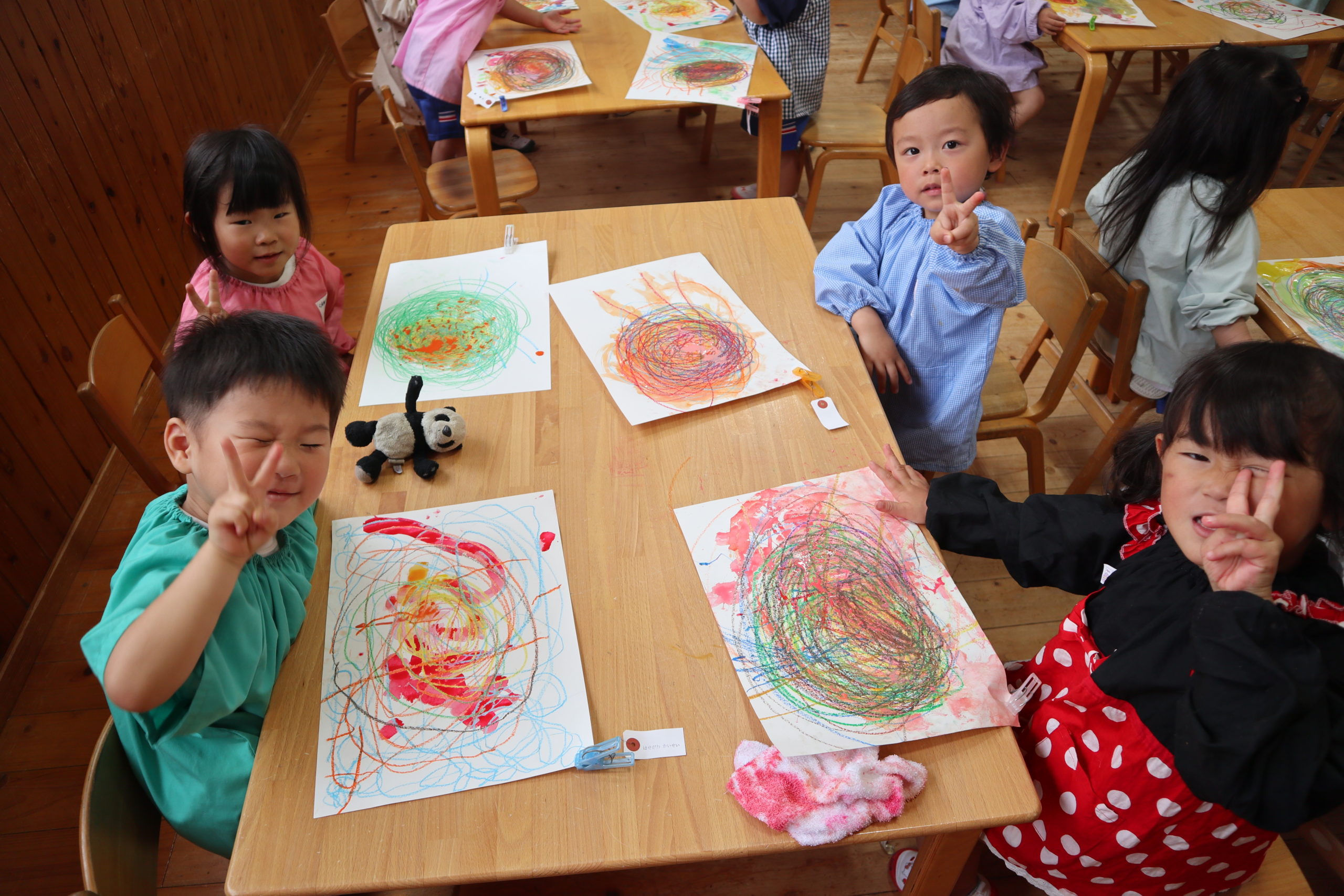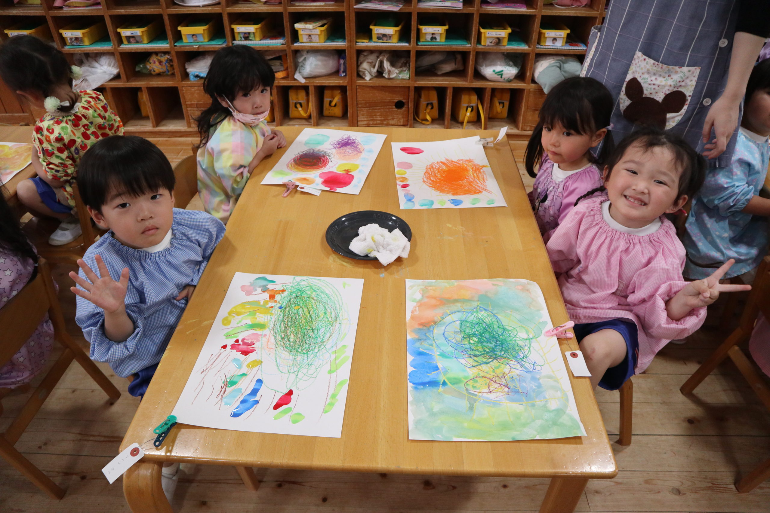 くれよんに絵の具がはじいたり、絵の具を重ねて滲んだり、思い思いのカラフルな色で塗りたくりを楽しみました。一つ一つが経験であり、次につながっていくふしぎな種つくりです。