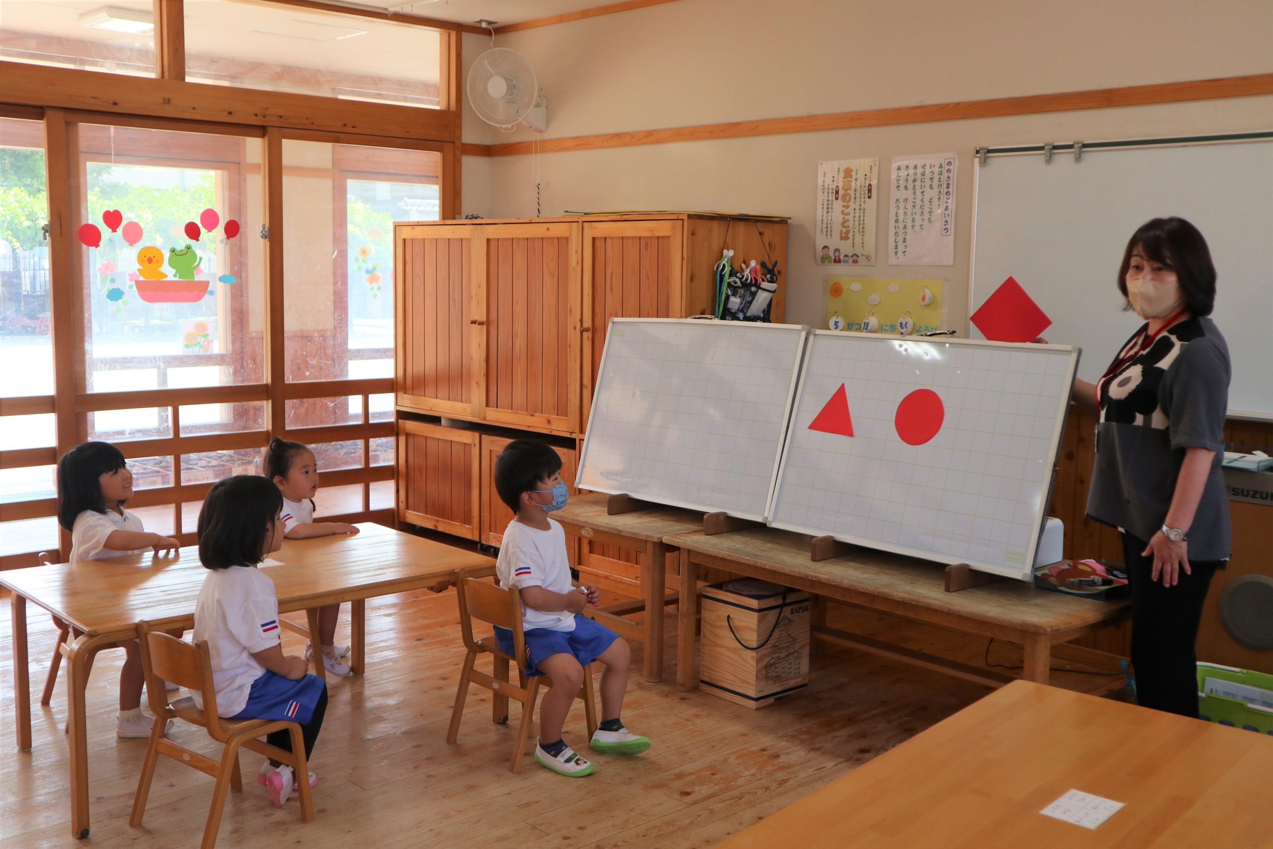 △や◇の大きな紙で角の数をかぞえました。ひとつ、ふたつ、みっつでさんかくだね。という具合です。学研まなびタイムでは、講師の先生が学研の開発された教具を使って「みて、きいて、まなぶ」姿勢を大切にしています。