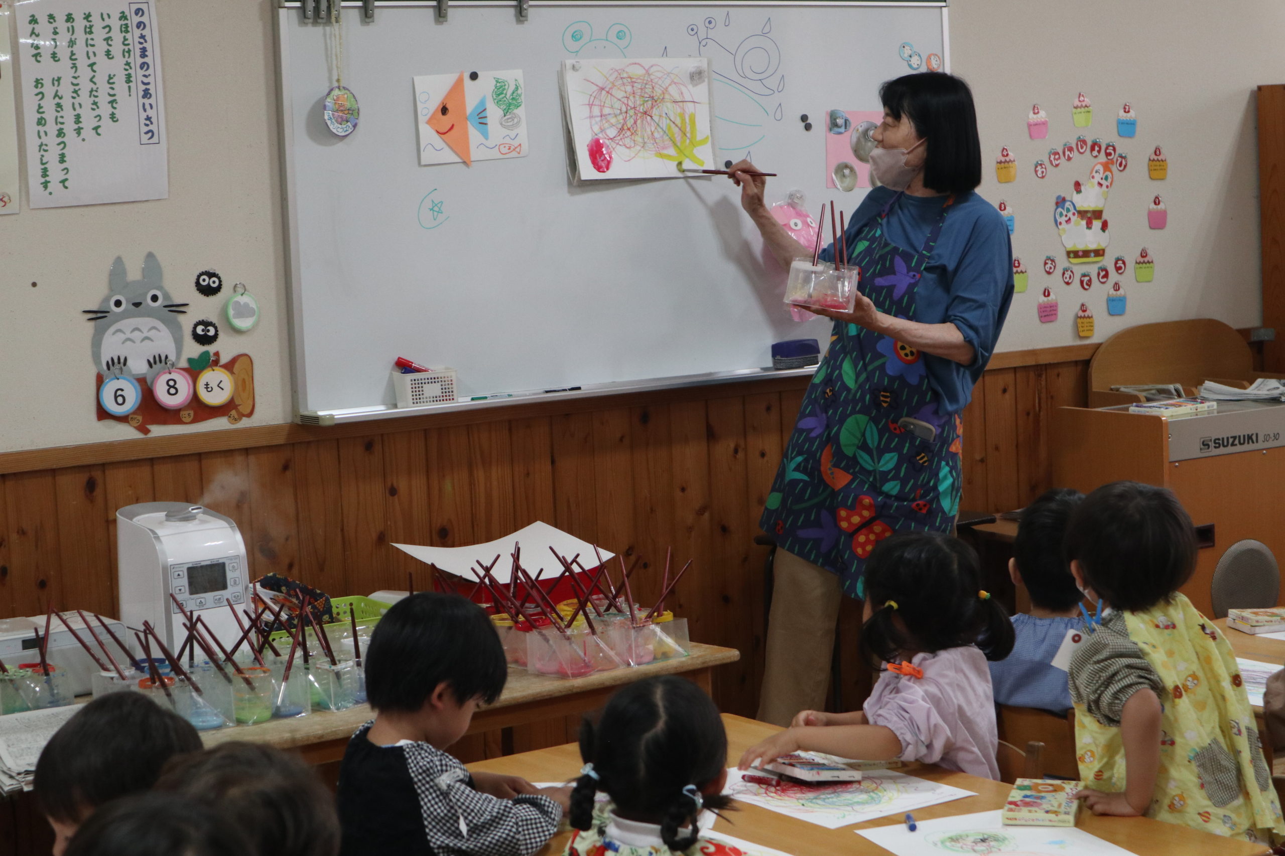 まず、くれよんでおひさまをぐるぐる描き、「おひさまがでたら、いちばんよろこぶのはだ~れ?」