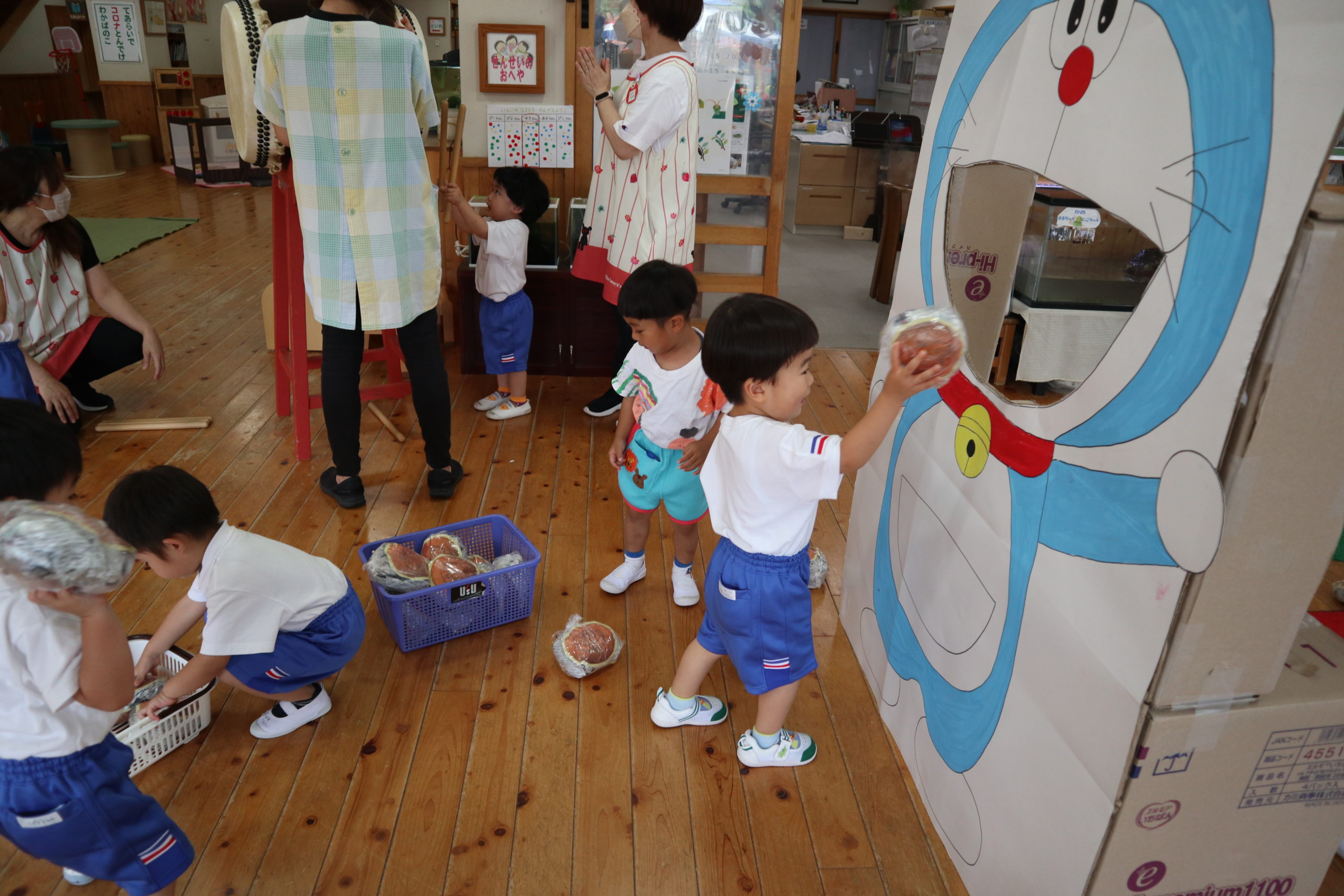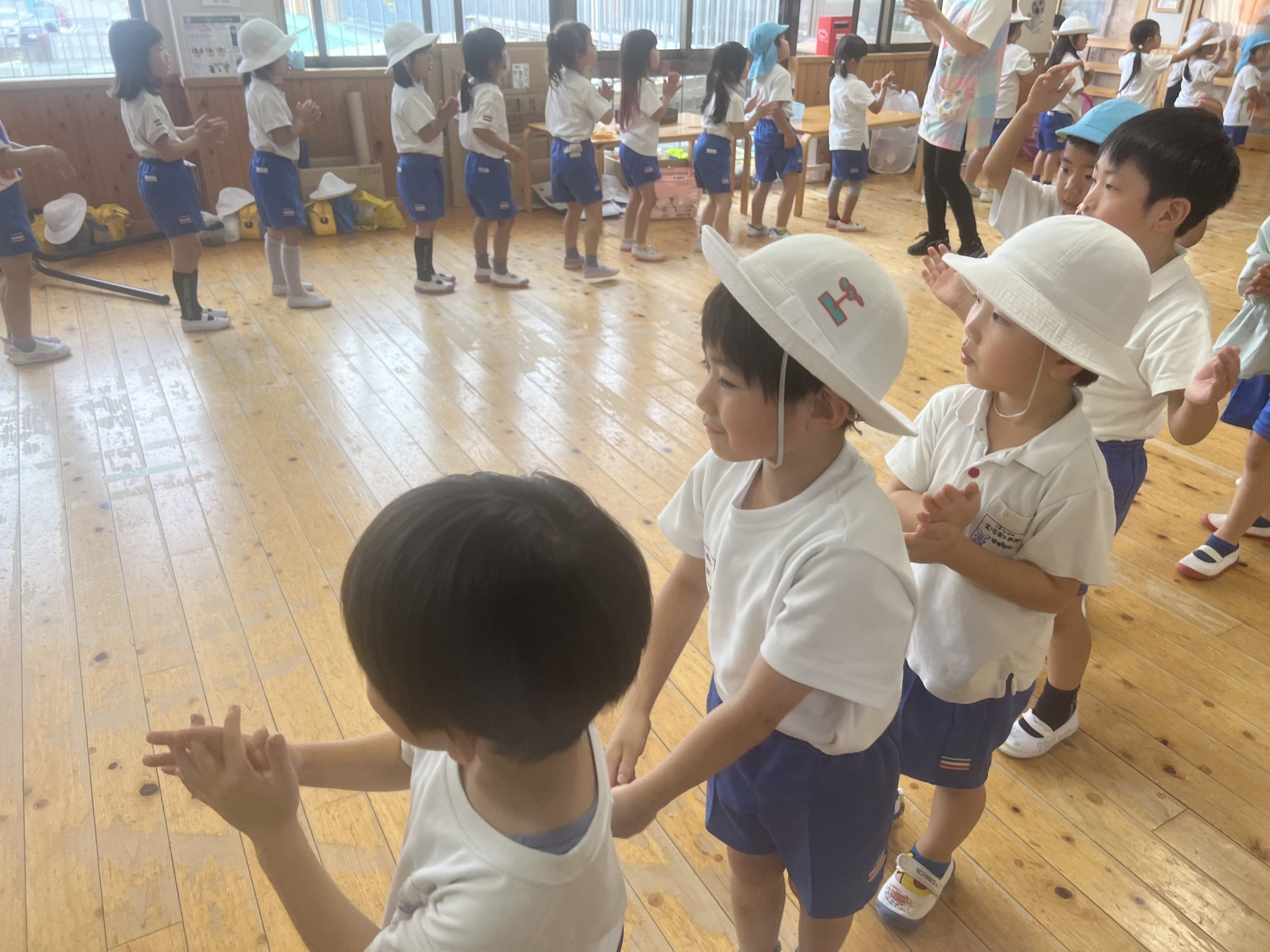 お帰りが終わった2時25分、2階からドンドンと地響き、思わず駆け上がってみると年長さんの盆踊りに加わって踊るちゅうりっぷさんの姿がありました。