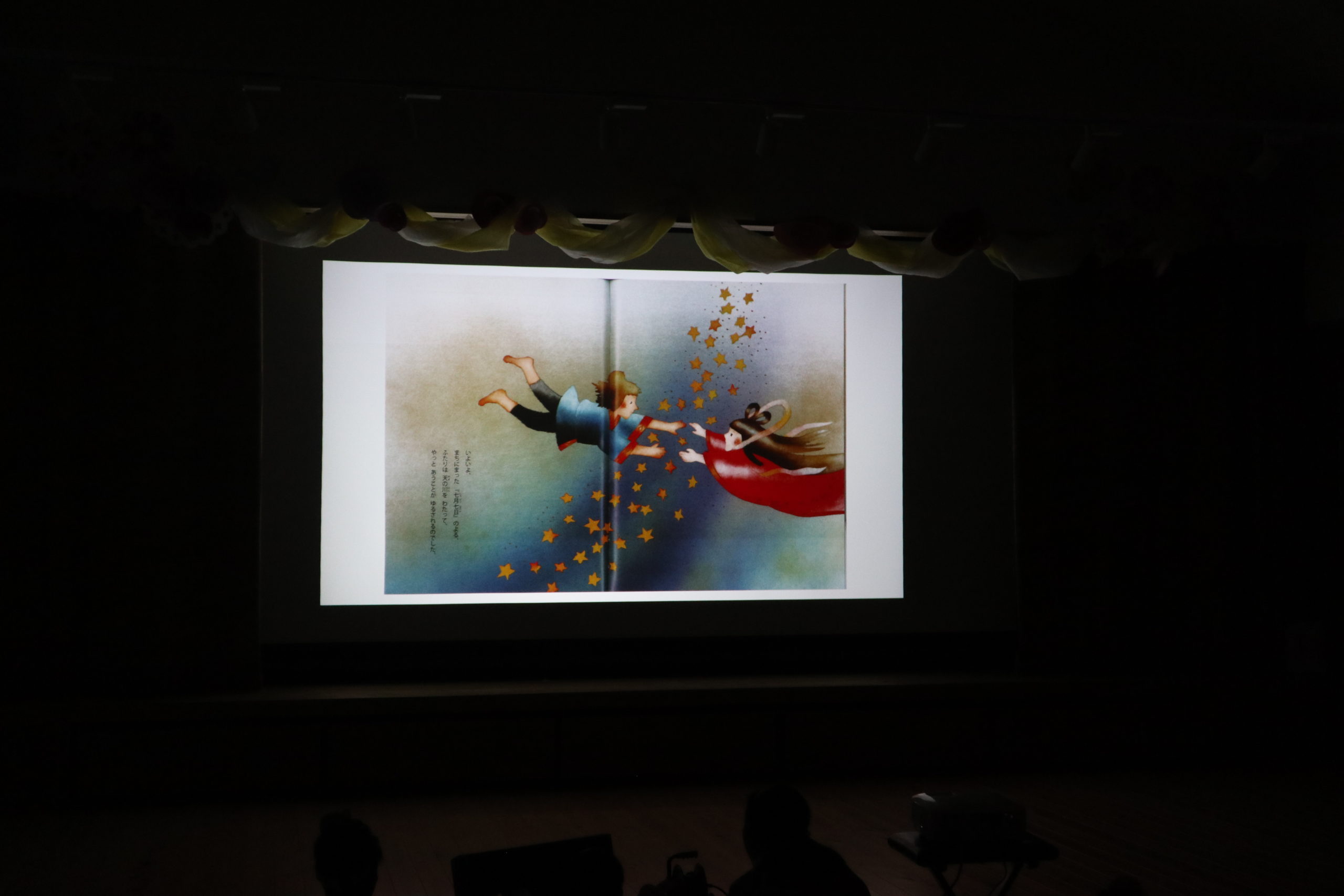 暗闇の中にキラキラ輝く天の川を間にしておりひめ様とひこぼし様のおはなしが続きます。