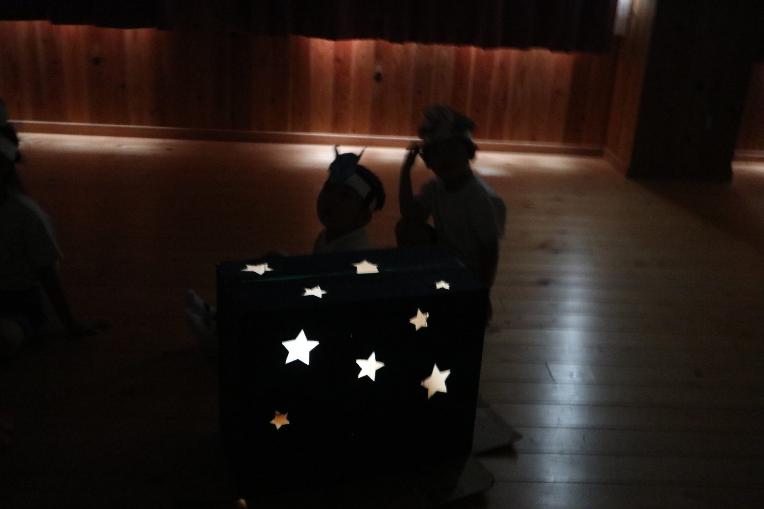 年中組は、真っ暗なホールにお手製のプラネタリウムを作って、天井にたくさんのお星さまをちりばめました。