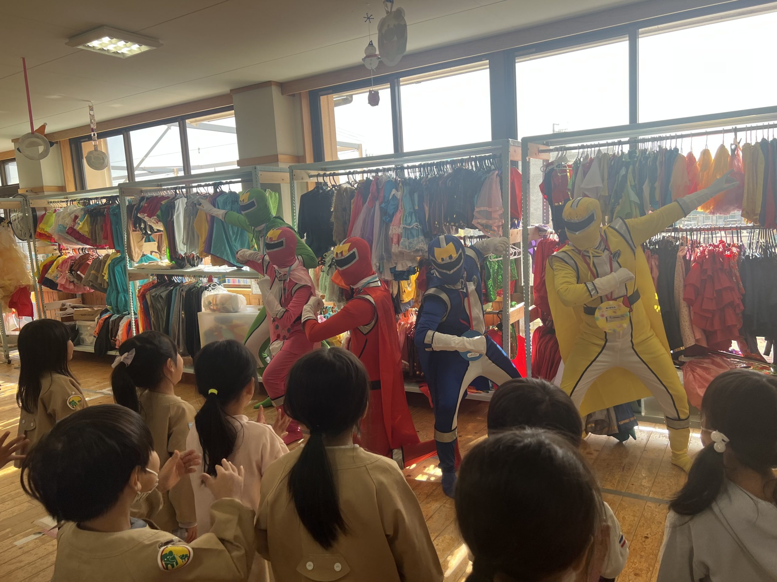 最近では、映画の世界のみらいレンジャーとホールで年少さんは尻尾とり、年中さんは走り玉入れ、身体を使って遊びました。